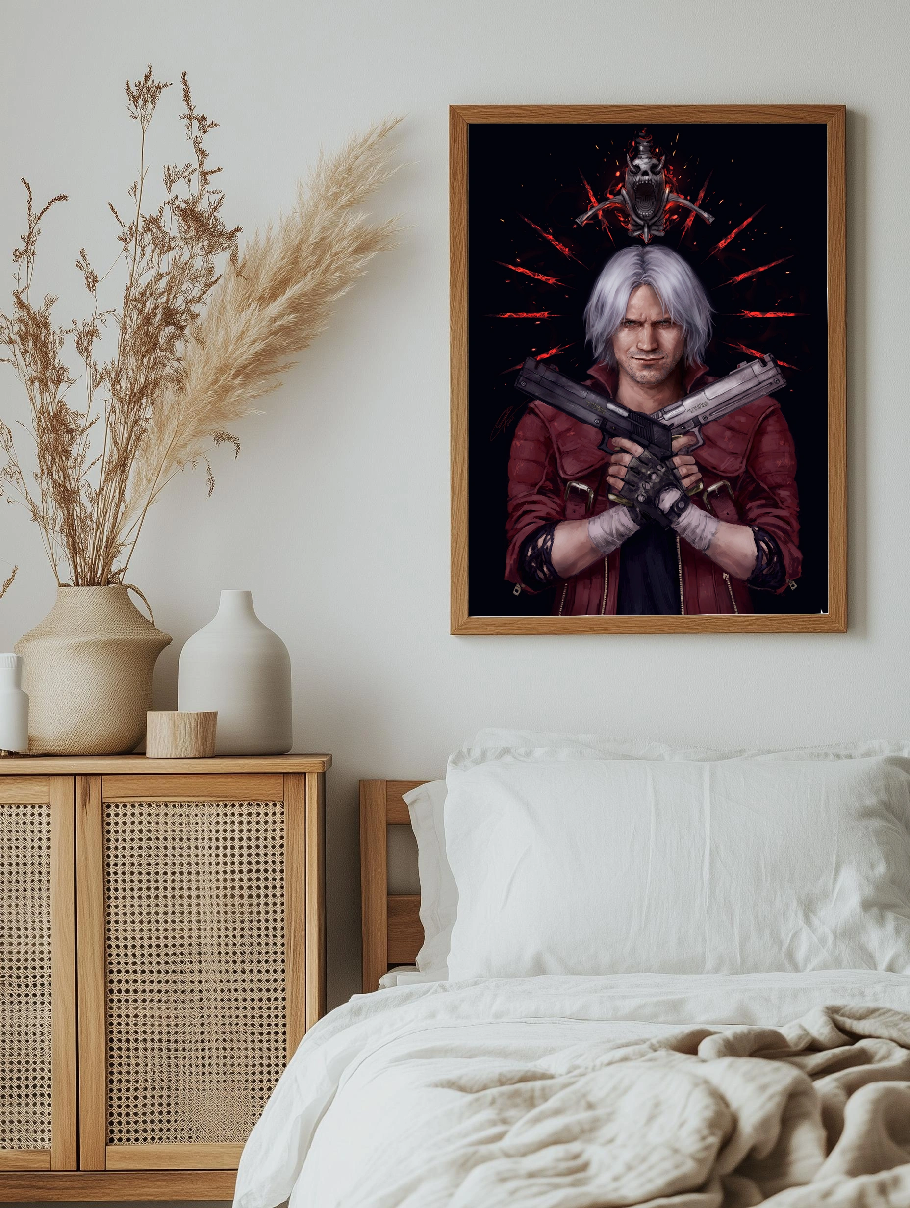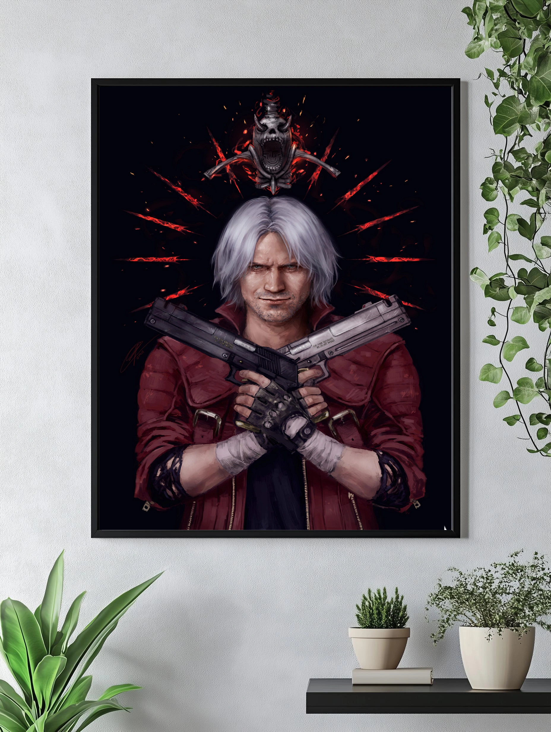 На изображении представлен Данте — главный персонаж из игры Devil May Cry. Он изображён с переплетёнными в руках пистолетами, в красном пальто и с белыми волосами, на тёмном фоне с кроваво-красными символами и демоническим черепом сверху. Картина отлично подойдёт как современное искусство для стен и стильный интерьерный декор.