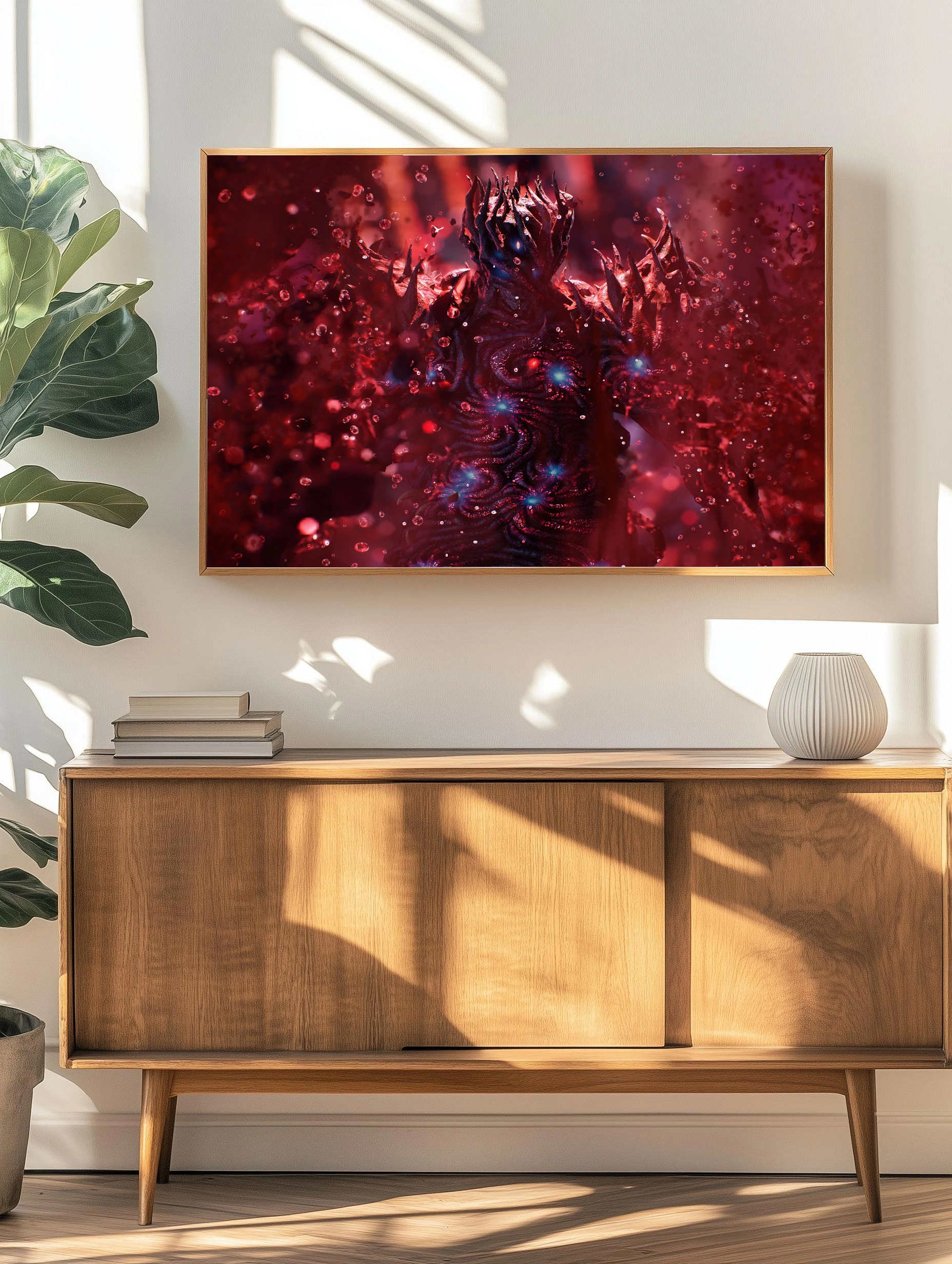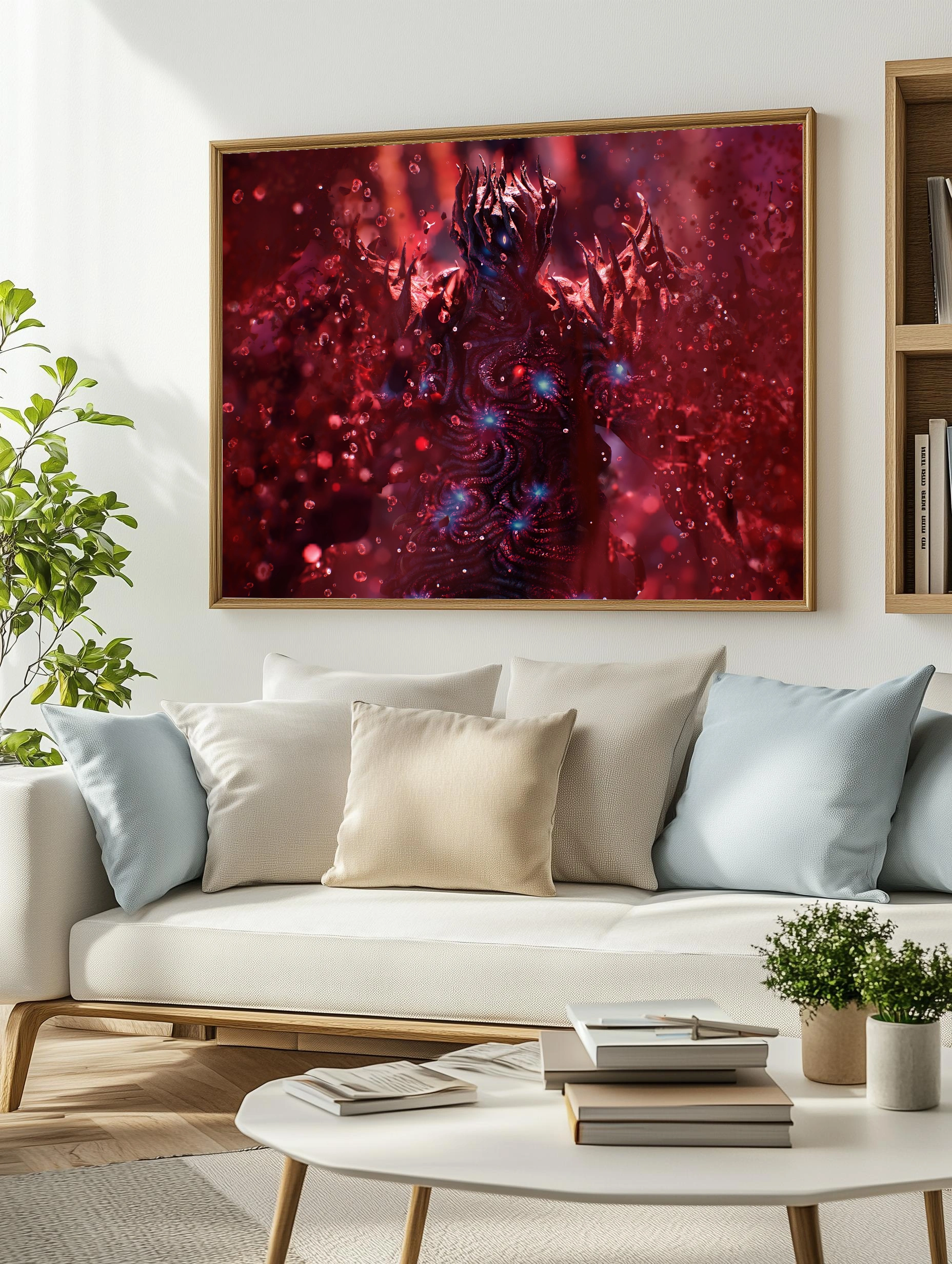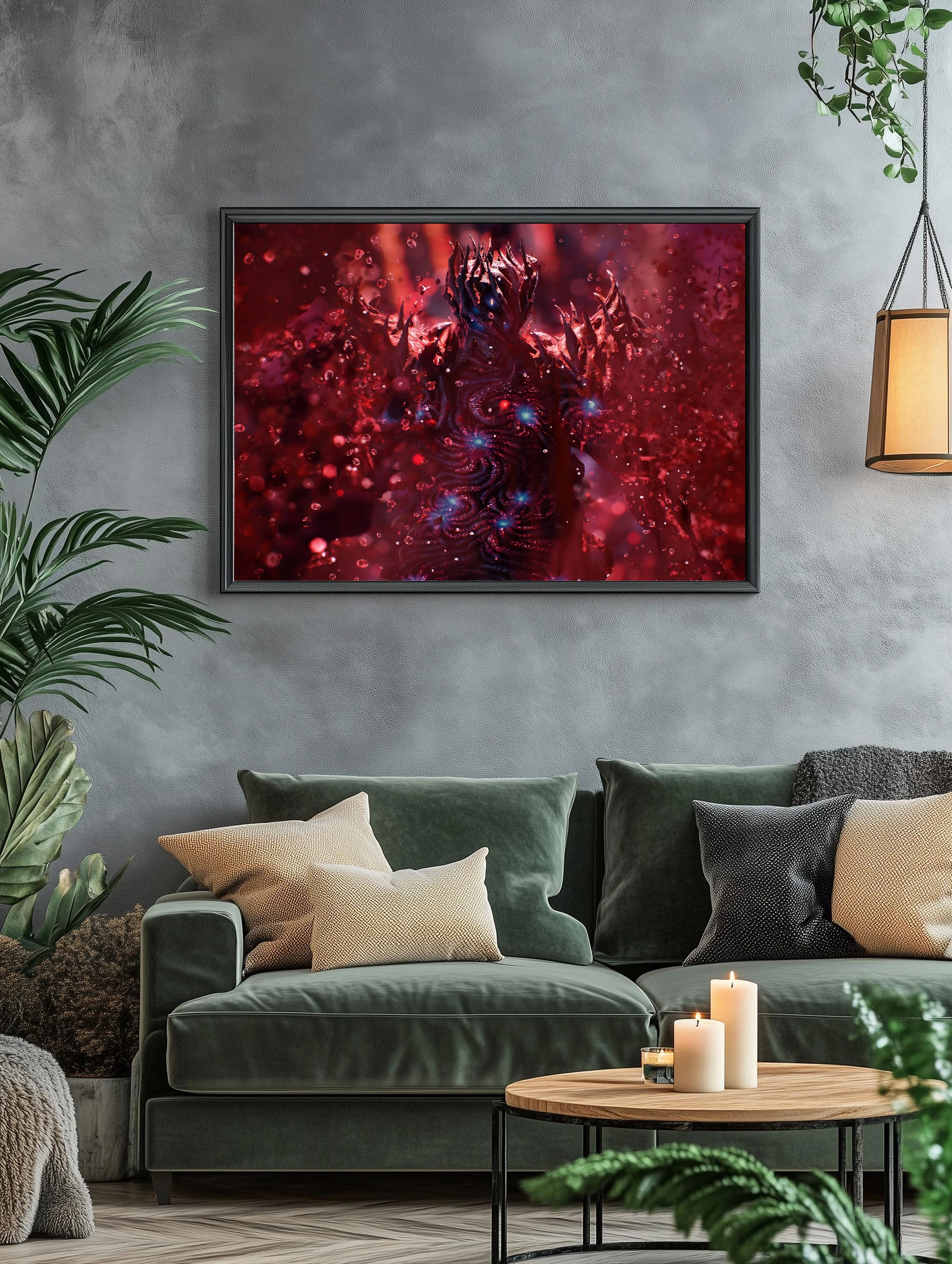 Этот интерьерный постер представляет собой изображение загадочного существа, выполненного в тёмных и огненных оттенках. Картина на холсте наполнена мистическим настроением и глубокими деталями, где доминируют красные и тёмные цвета с вкраплениями синего. Такой художественный плакат отлично подойдет для современного искусства для стен в гостиной или офисе, создавая атмосферу загадочности и силы.