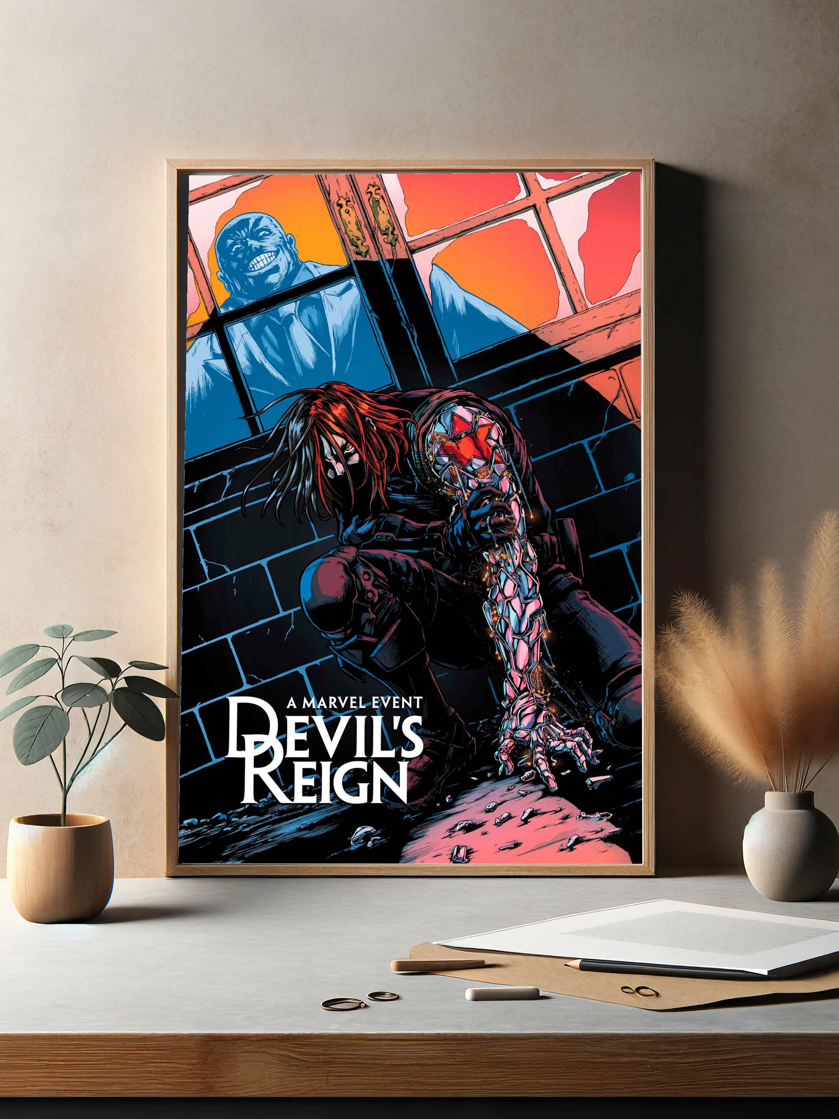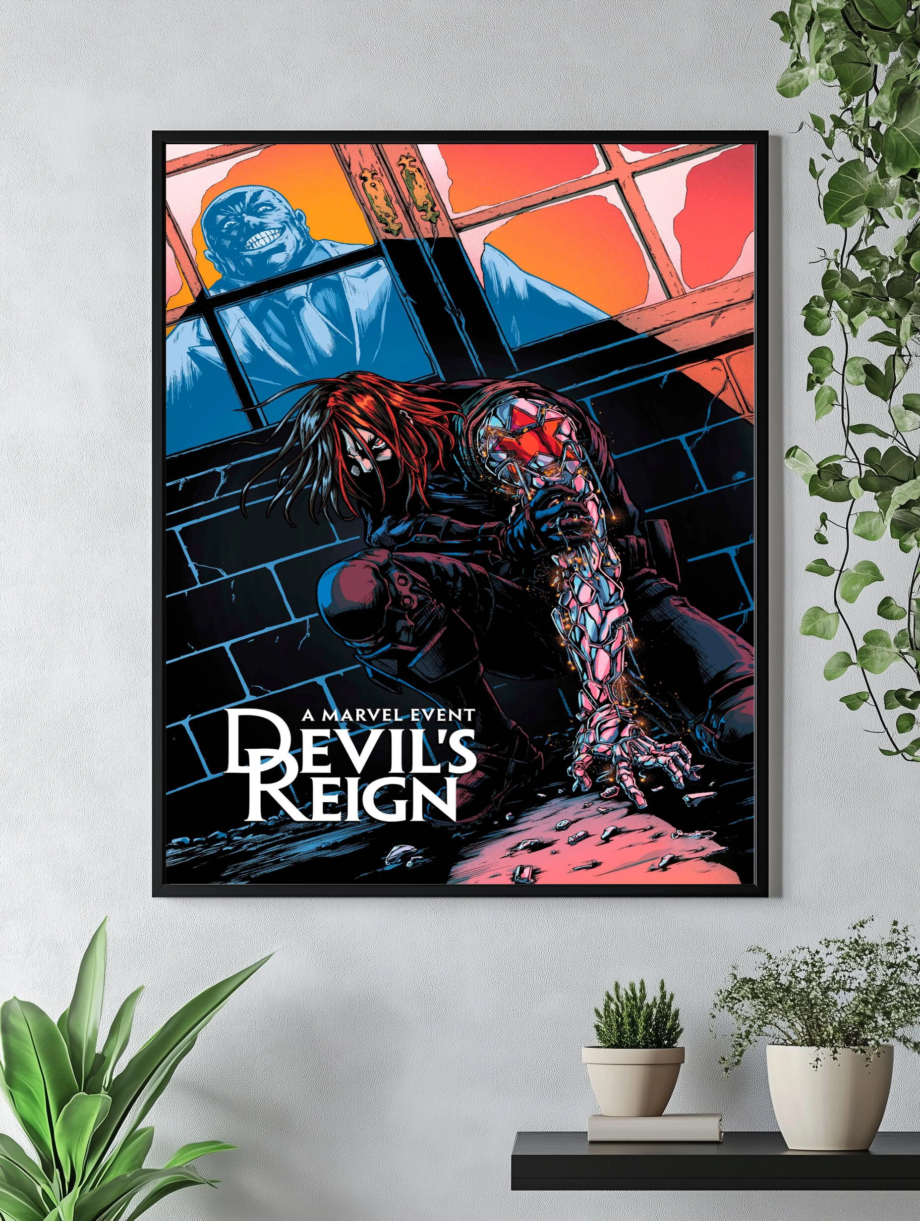 Декоративный плакат в стиле комиксов Marvel «Devil’s Reign» с динамичным изображением персонажа, вероятно Сэрена или Карателя, на фоне городского пейзажа с красным заходящим солнцем. Контраст красного и синего создаёт мрачное и напряжённое настроение, идеально для современного интерьера и поклонников Marvel.