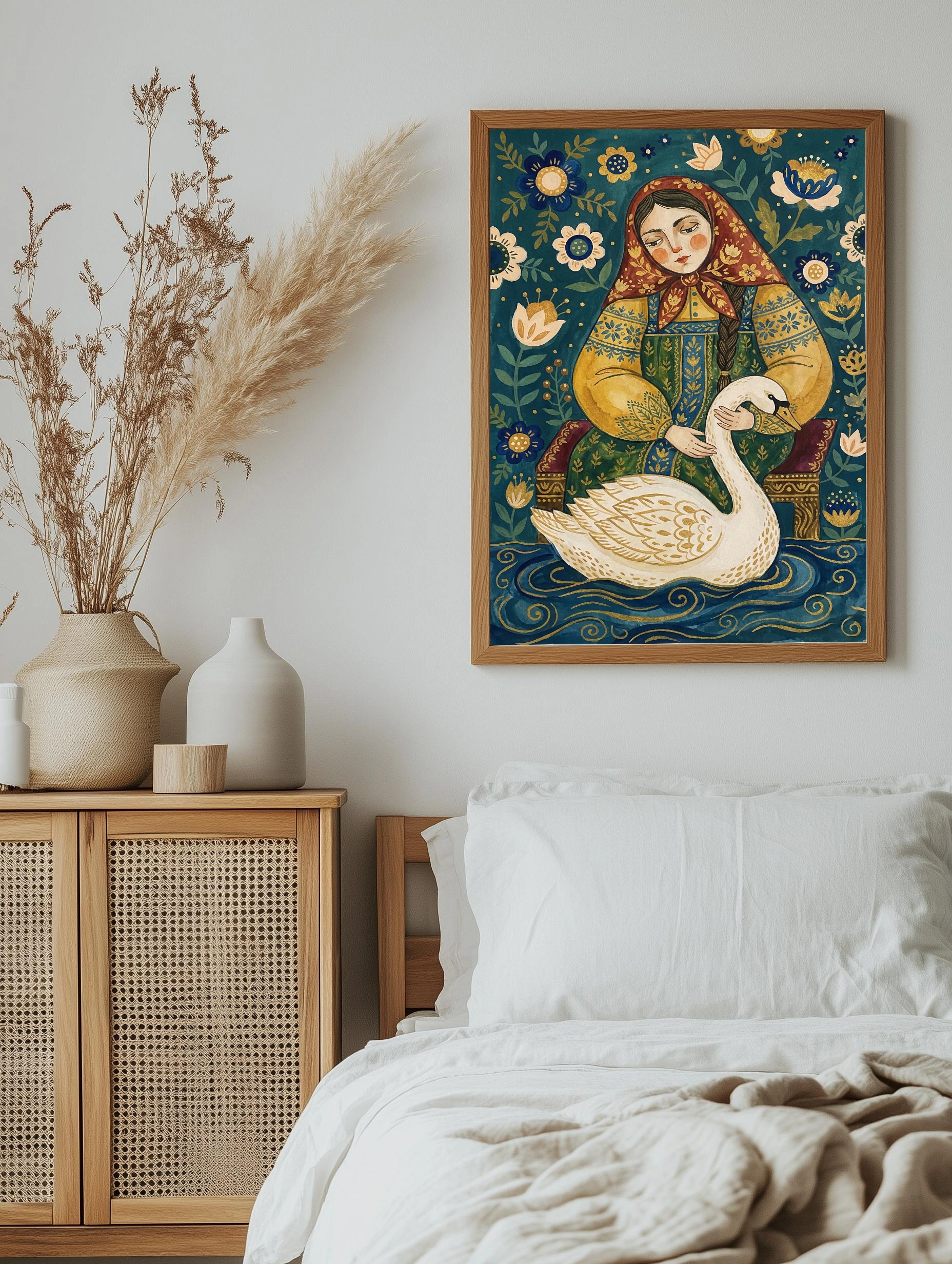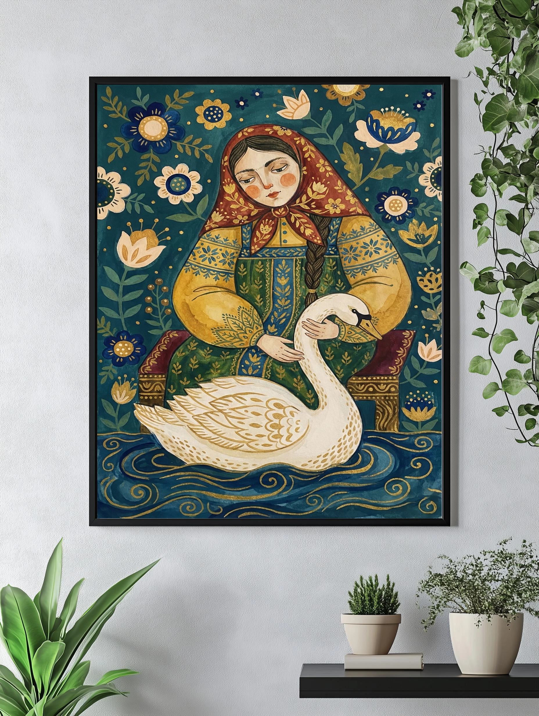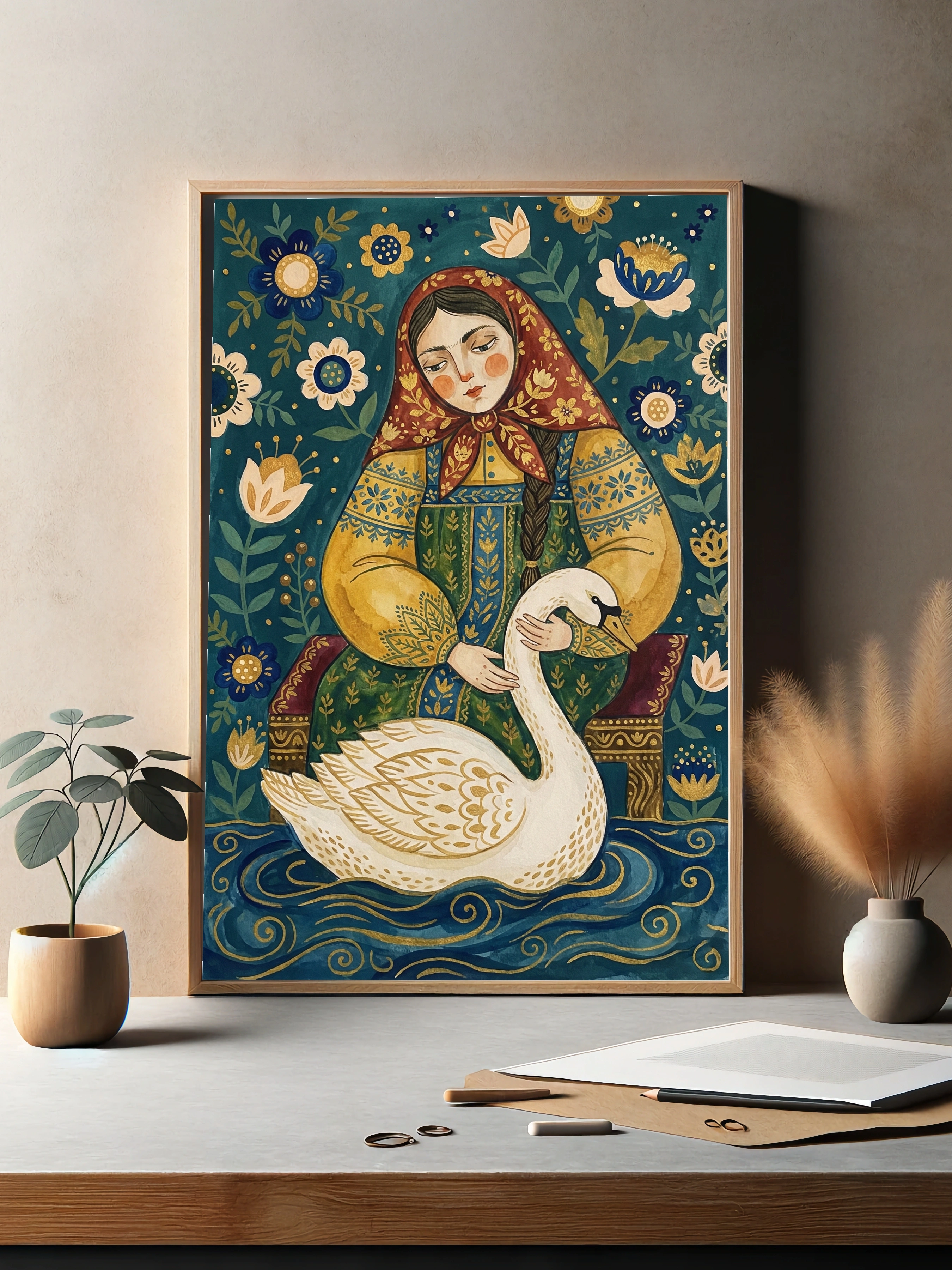 Картина изображает девушку в русском народном костюме с ярко выраженными деталями вышивки, держащую белого лебедя на фоне украшенного цветочными мотивами узора. Стилистика напоминает традиционную русскую живопись с современным акварельным исполнением, создавая атмосферу уюта и тепла для гостиной или спальни. Этот интерьерный арт идеально подходит для тех, кто ценит фольклор и уникальный настенный декор.
