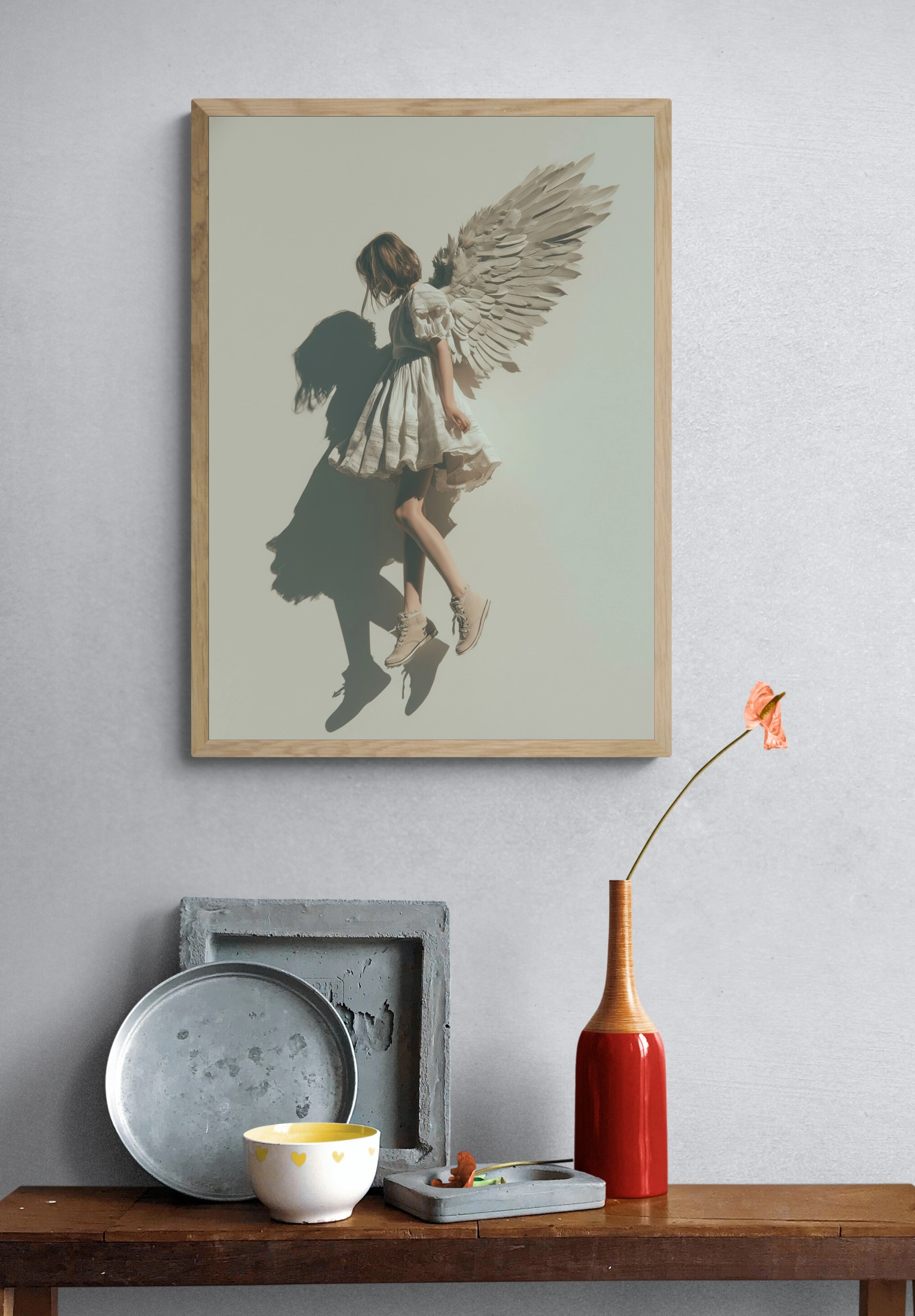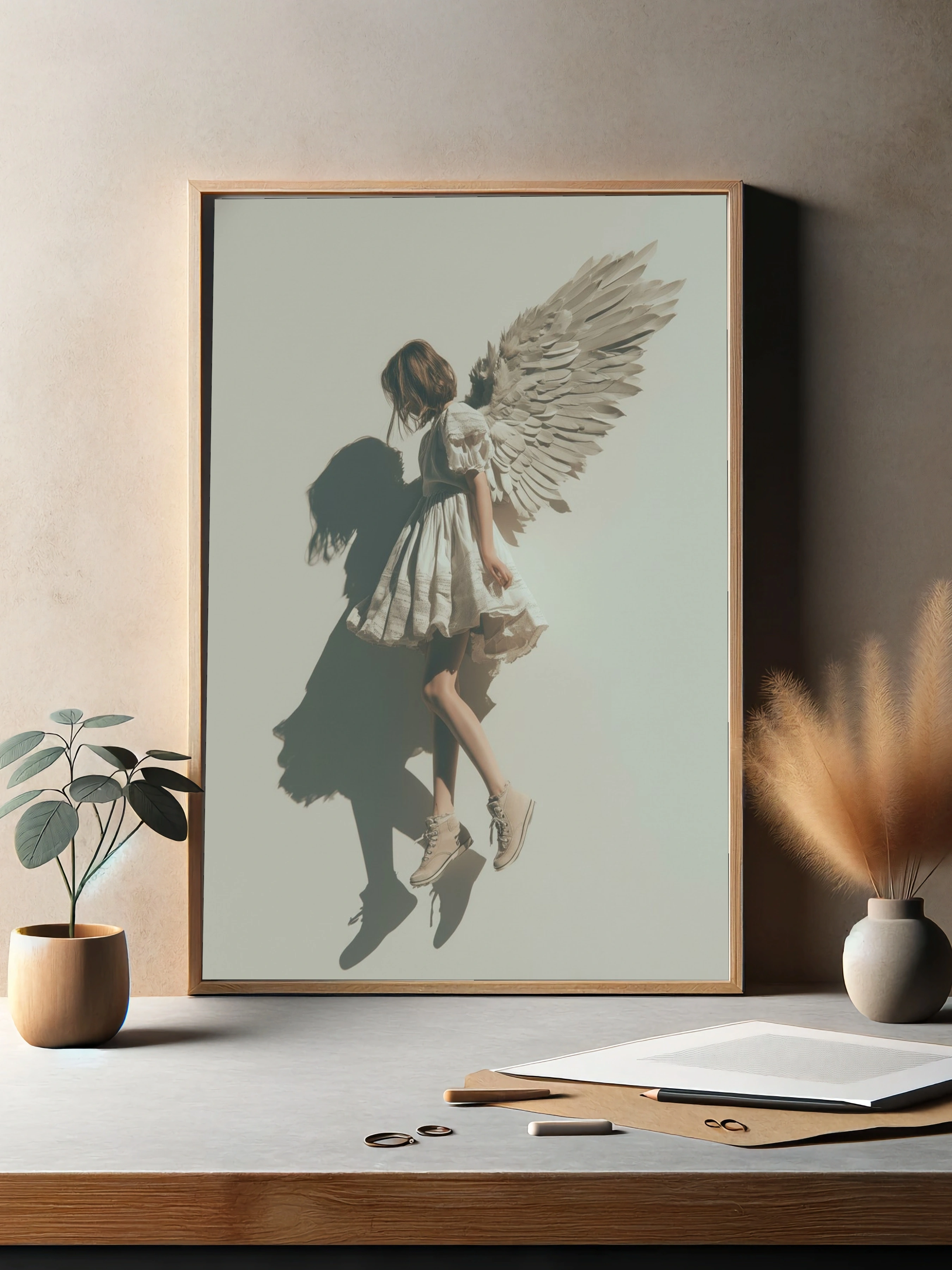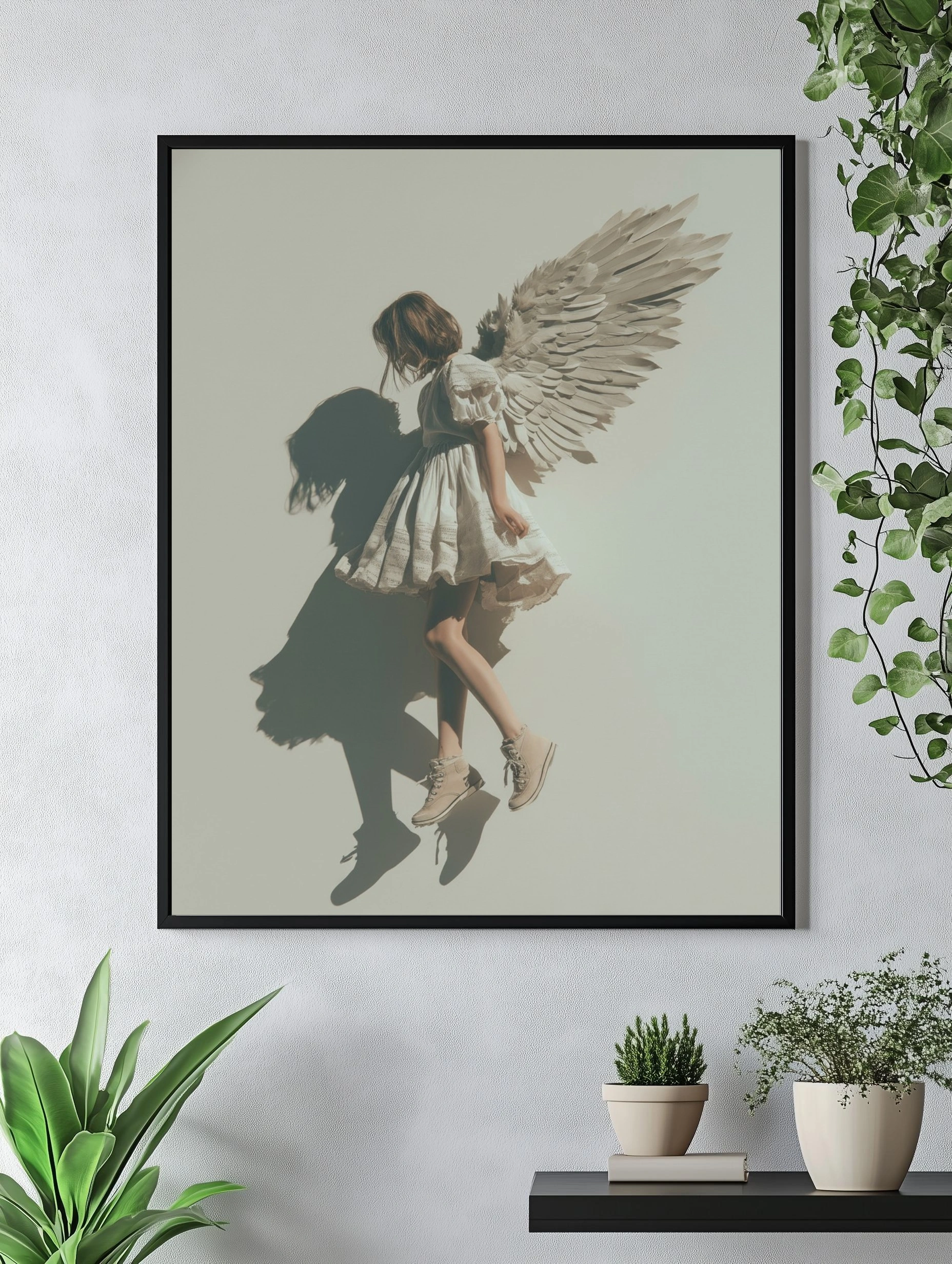 Этот постер запечатлевает волшебный момент, где девушка в белом платье с пышными рукавами словно парит в воздухе. Её ангельские крылья, выполненные из бумаги, создают эффект легкости и невесомости, а тень, отбрасываемая на стену, добавляет глубину и загадочность. Нежные оттенки белого и бежевого подчеркивают чистоту и невинность образа, создавая атмосферу мечты и вдохновения. Этот постер станет идеальным акцентом в спальне или детской комнате, привнося в интерьер нотки романтики и фантазии. Он привлечет внимание молодежи и креативщиков, ищущих уникальные решения для своего пространства.