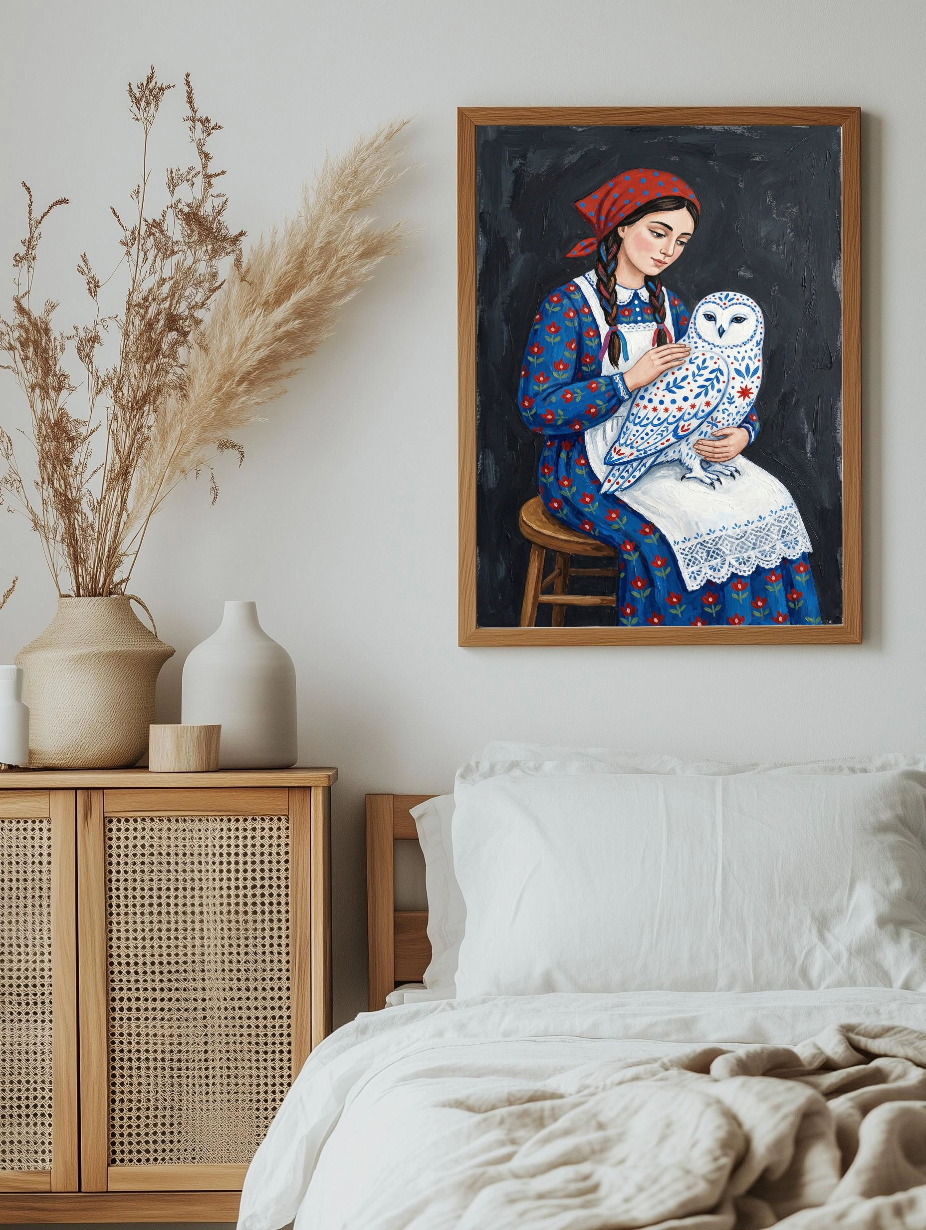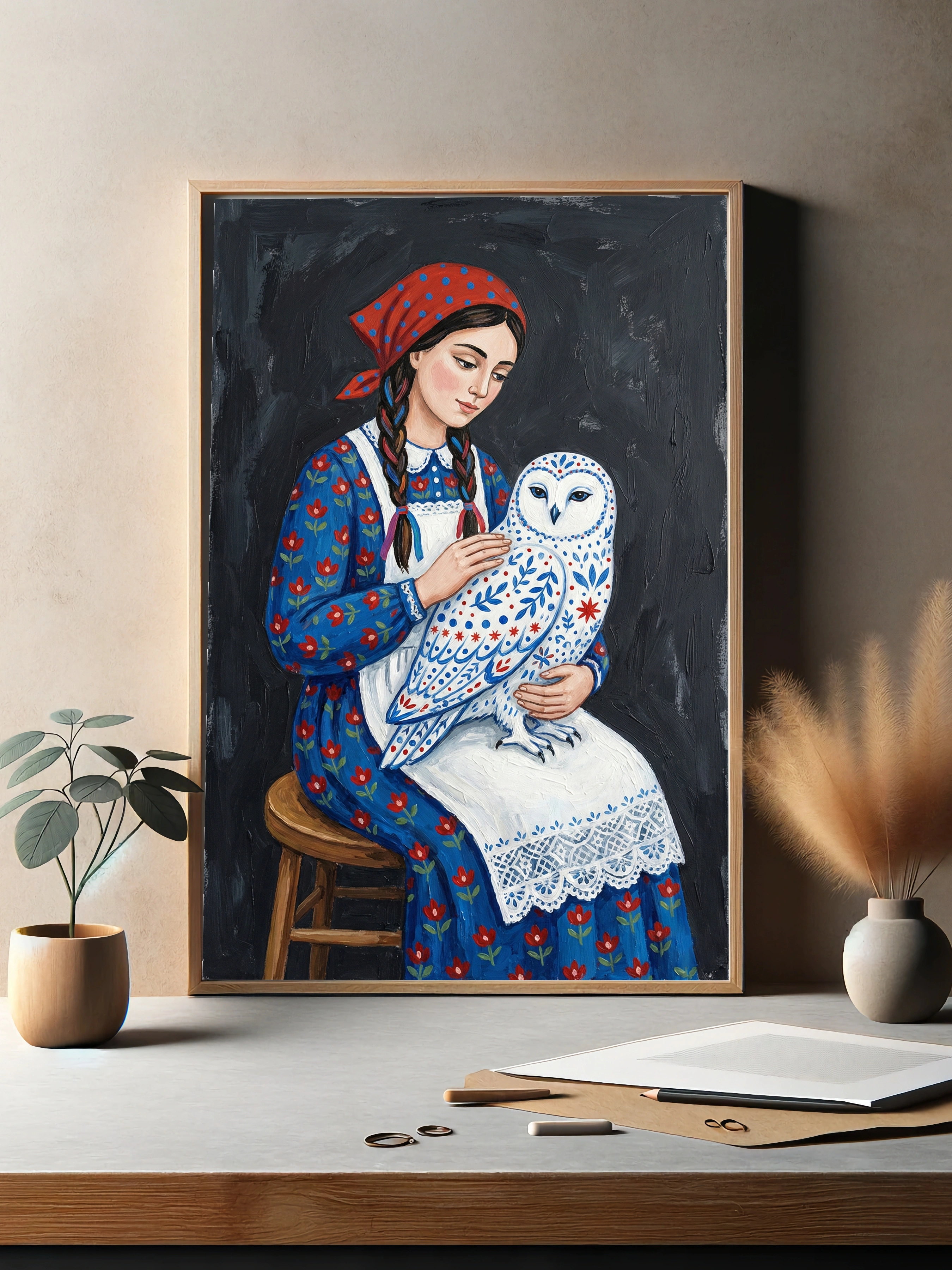 На изображении показана девушка в синем традиционном платье с красными цветочными узорами и красной повязкой в горошек. В руках у неё белая сова с ярким синим и красным орнаментом. Фон тёмный, создаёт контраст и подчёркивает героев. Работа выполнена в стиле современной живописи с элементами народного искусства. Это декоративный интерьерный арт для стен, подчеркивающий связь человека и природы.