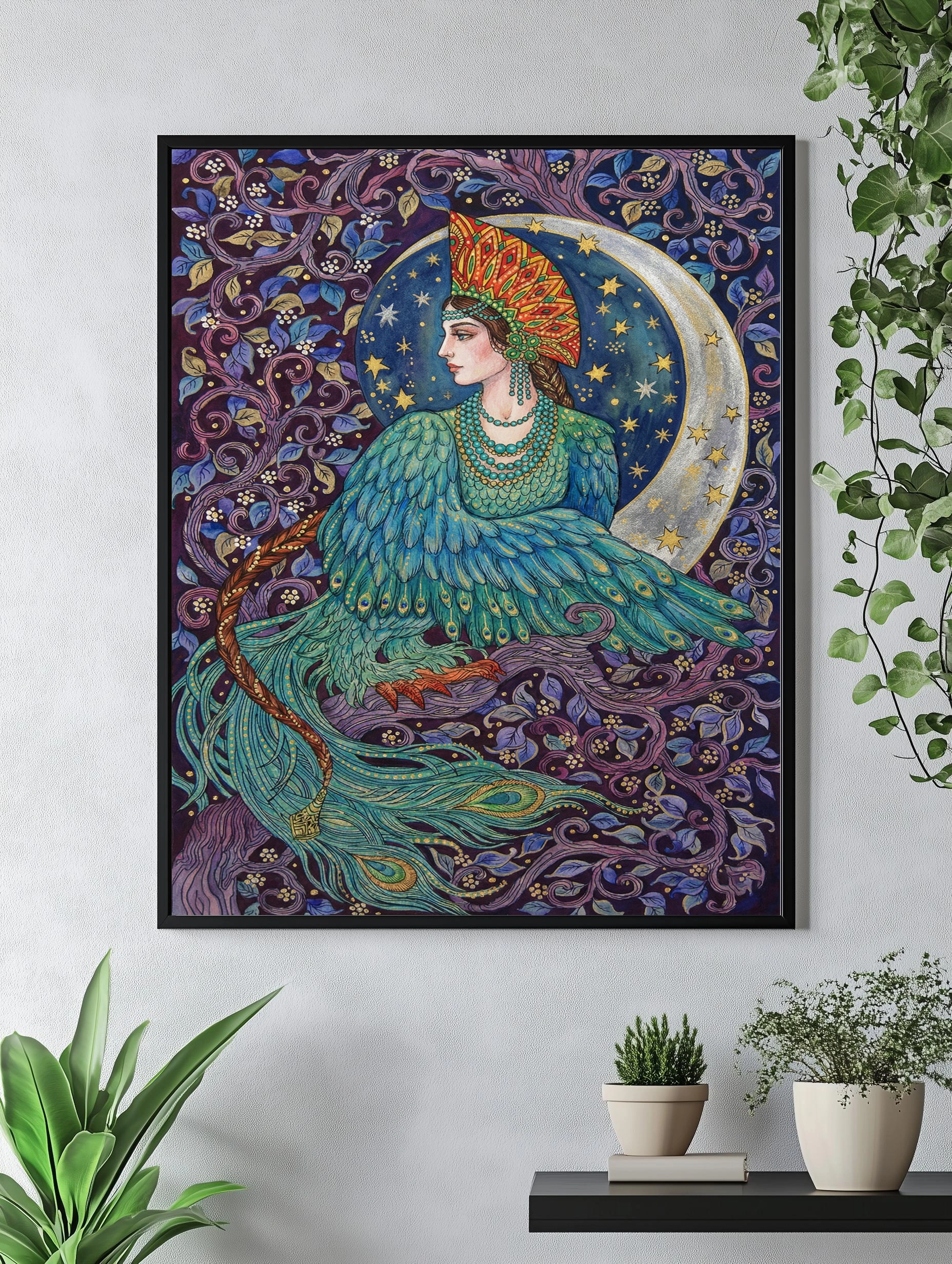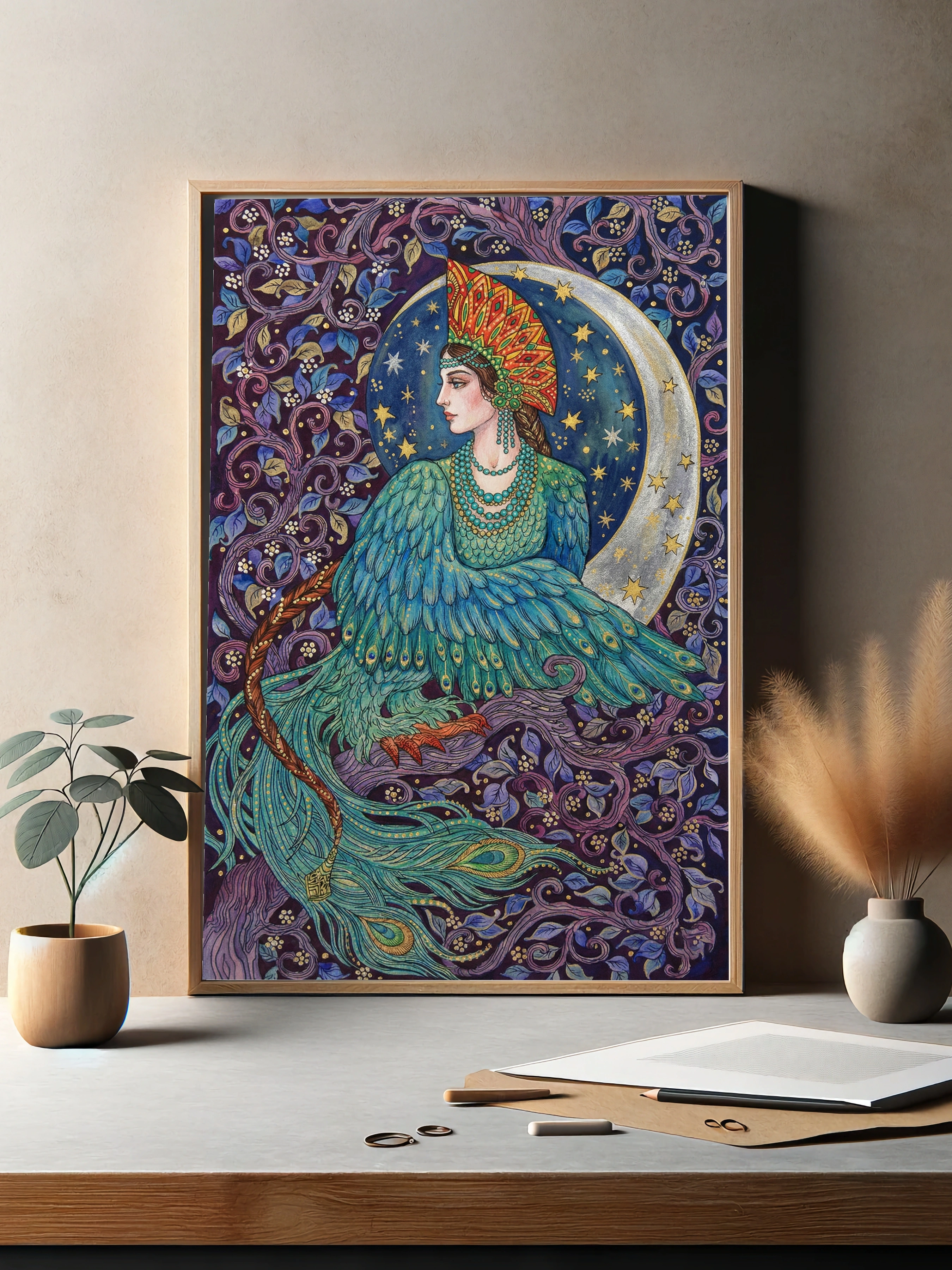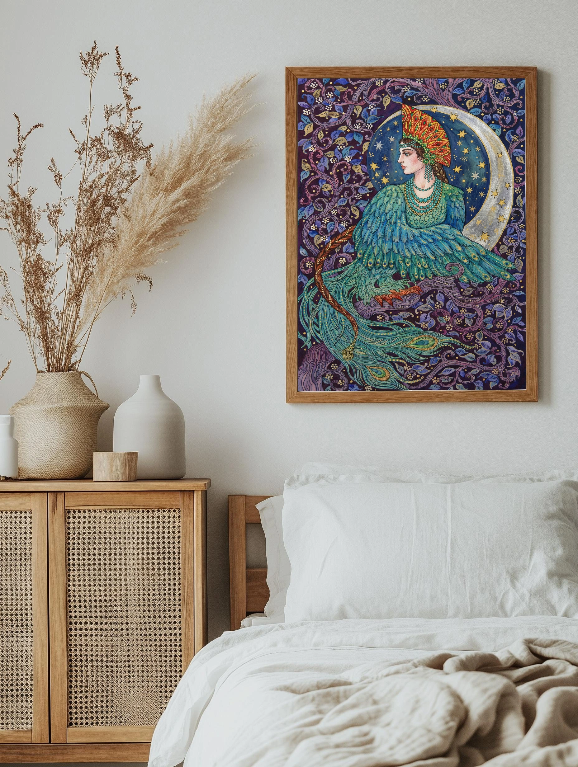 Декоративный плакат в стиле ар-нуво с изображением женщины в образе птицы с ярким пернатым платьем, украшенной экзотическим головным убором. Фон выполнен в тёмно-фиолетовых и синих тонах с растительными элементами и серебристой луной, создавая атмосферу магии и загадочности. Такое интерьерное искусство прекрасно дополнит спальню или гостиную, добавив изысканности и сказочности.