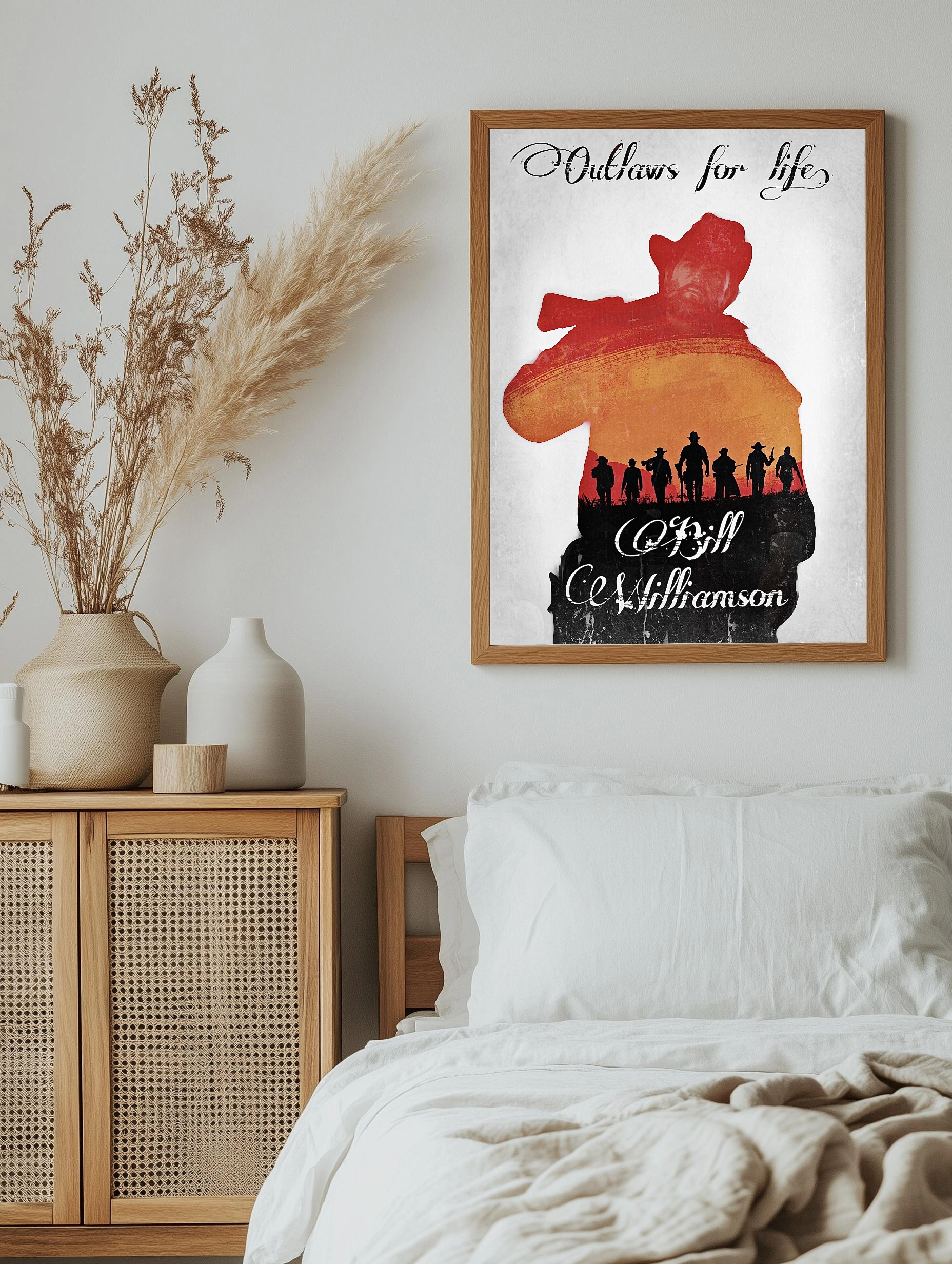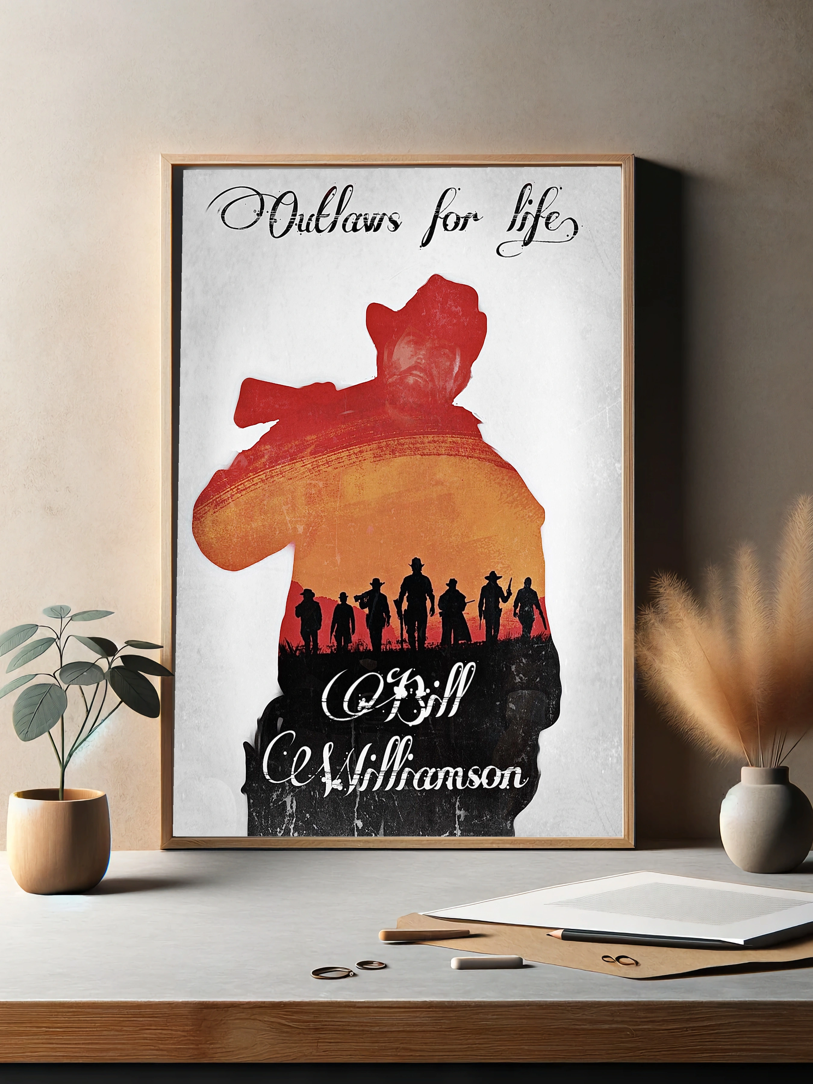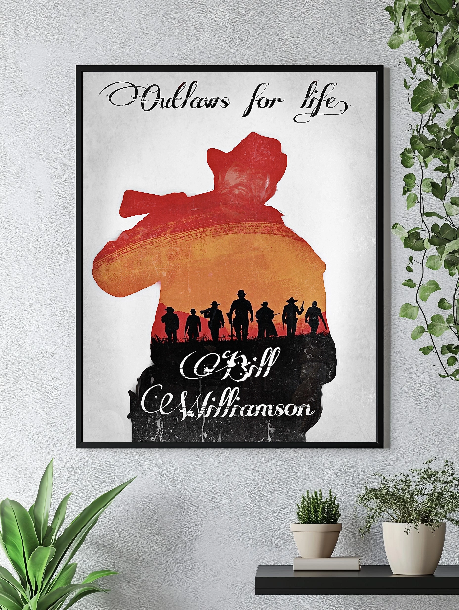 Интерьерный постер с изображением знакового персонажа Билл С. Уильямсон из вселенной Red Dead Redemption. В композиции преобладают силуэты ковбоев на фоне заката, создавая атмосферу Дикого Запада и темы законопреступности. Этот художественный плакат отлично подойдет для стильного декора стен и уникальной картины для гостиной или офиса.