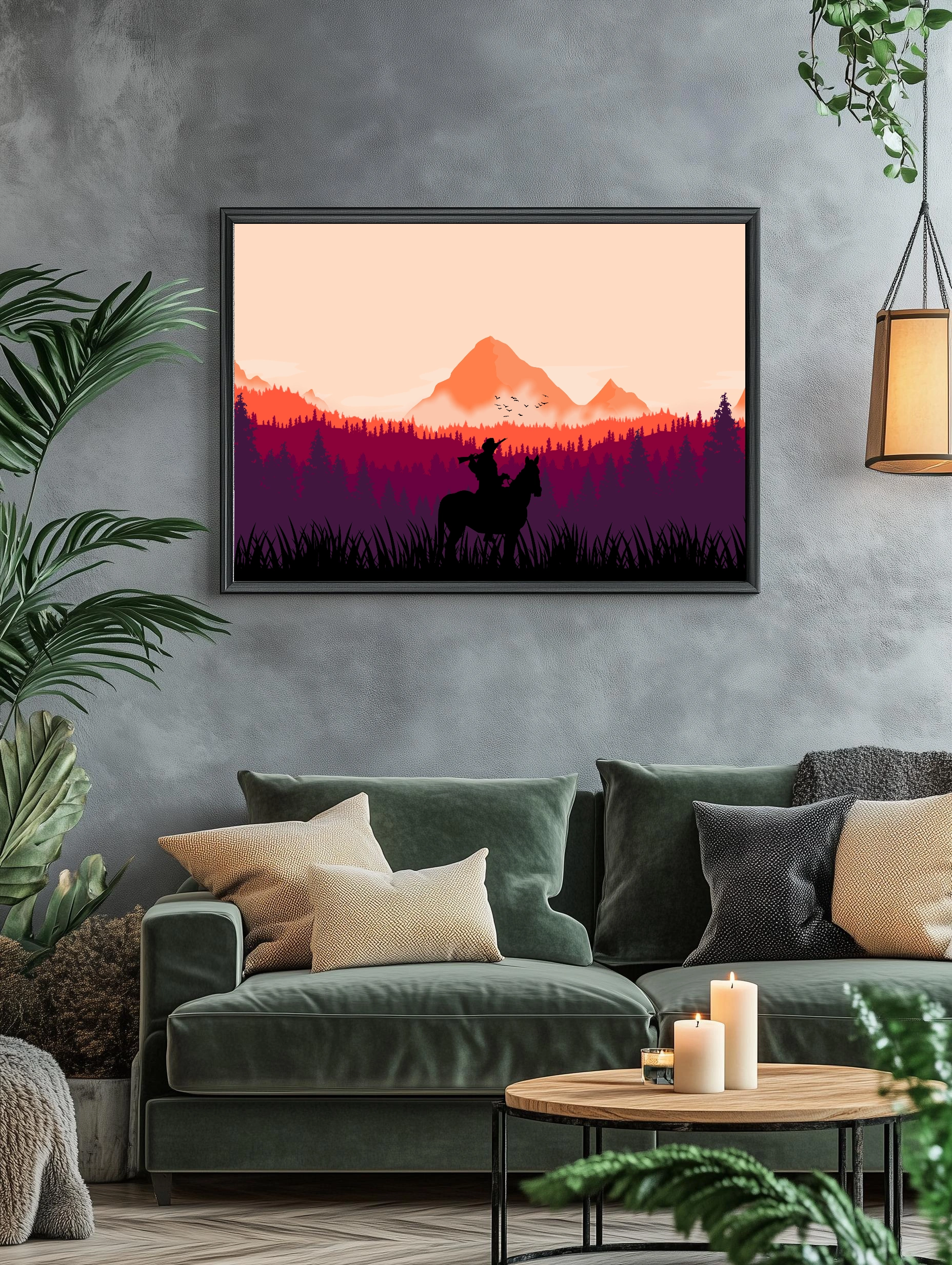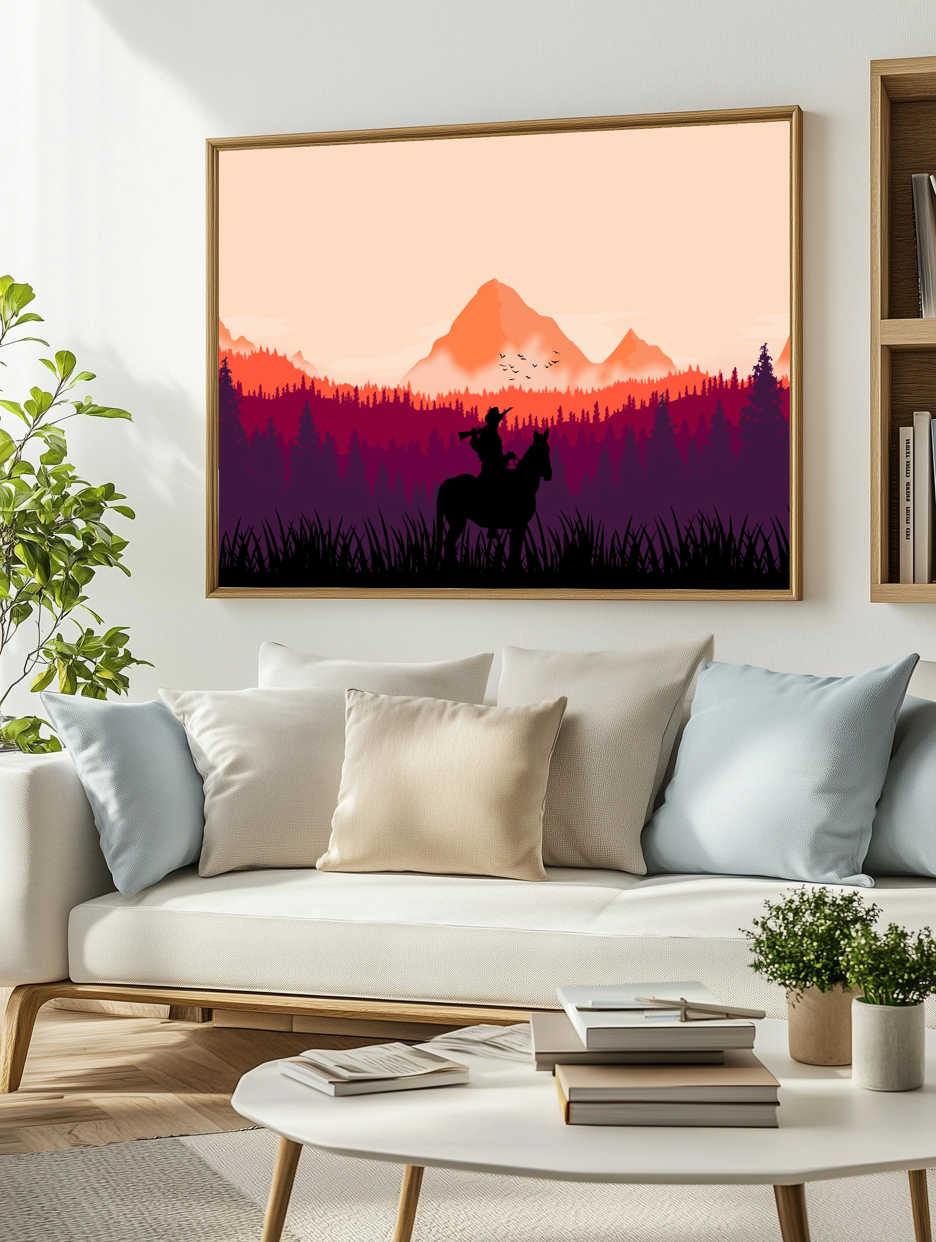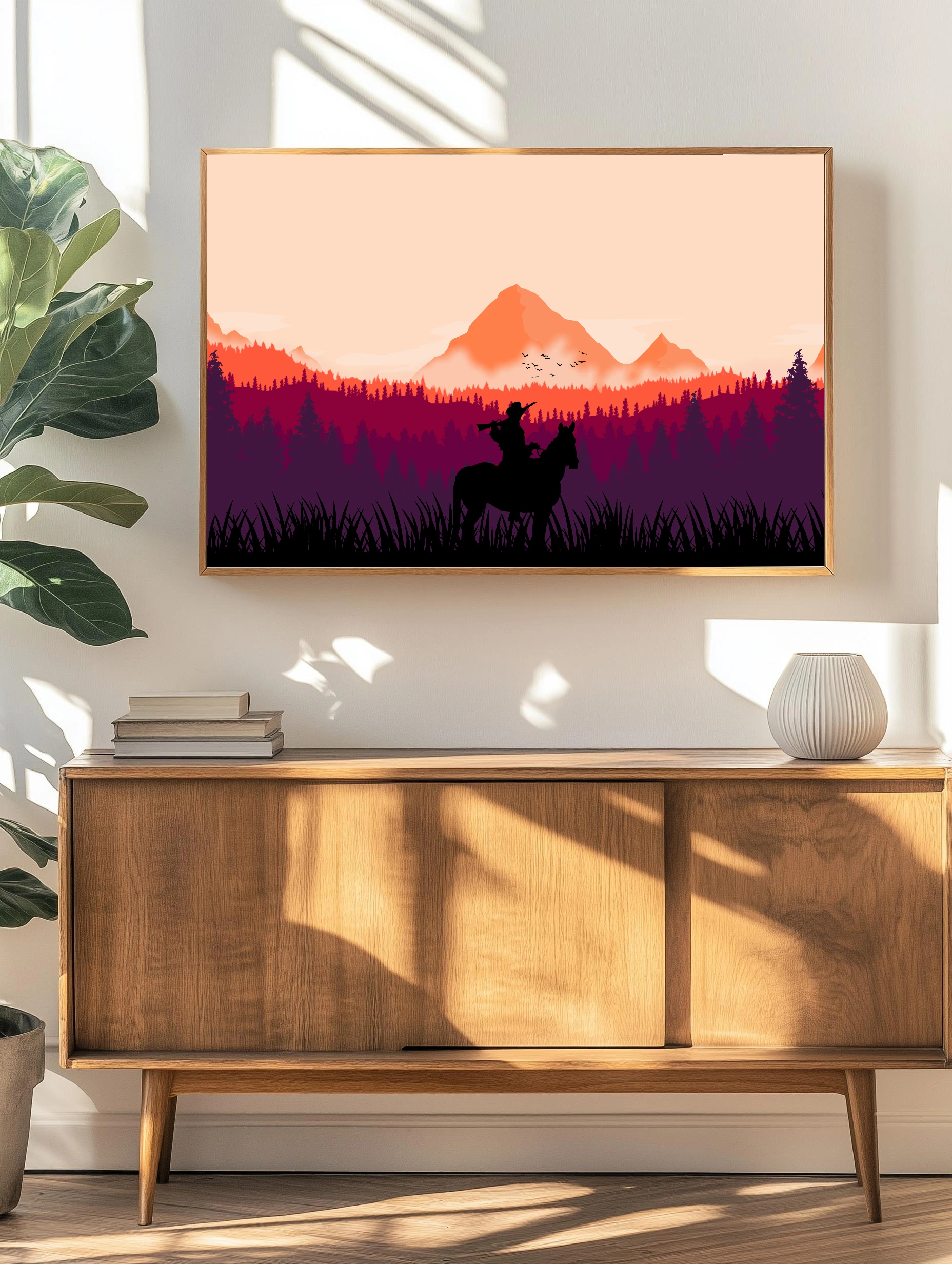 Изображение представляет собой силуэт ковбоя на лошади на фоне живописных гор и леса, выполненное в стиле минимализма с акцентом на контраст. Основные цвета — теплые оттенки оранжевого и красного, создающие атмосферу заката и спокойствия. Идеально подходит как интерьерное искусство для гостиной или спальни, стильный декор стен и уникальные картины для дома.