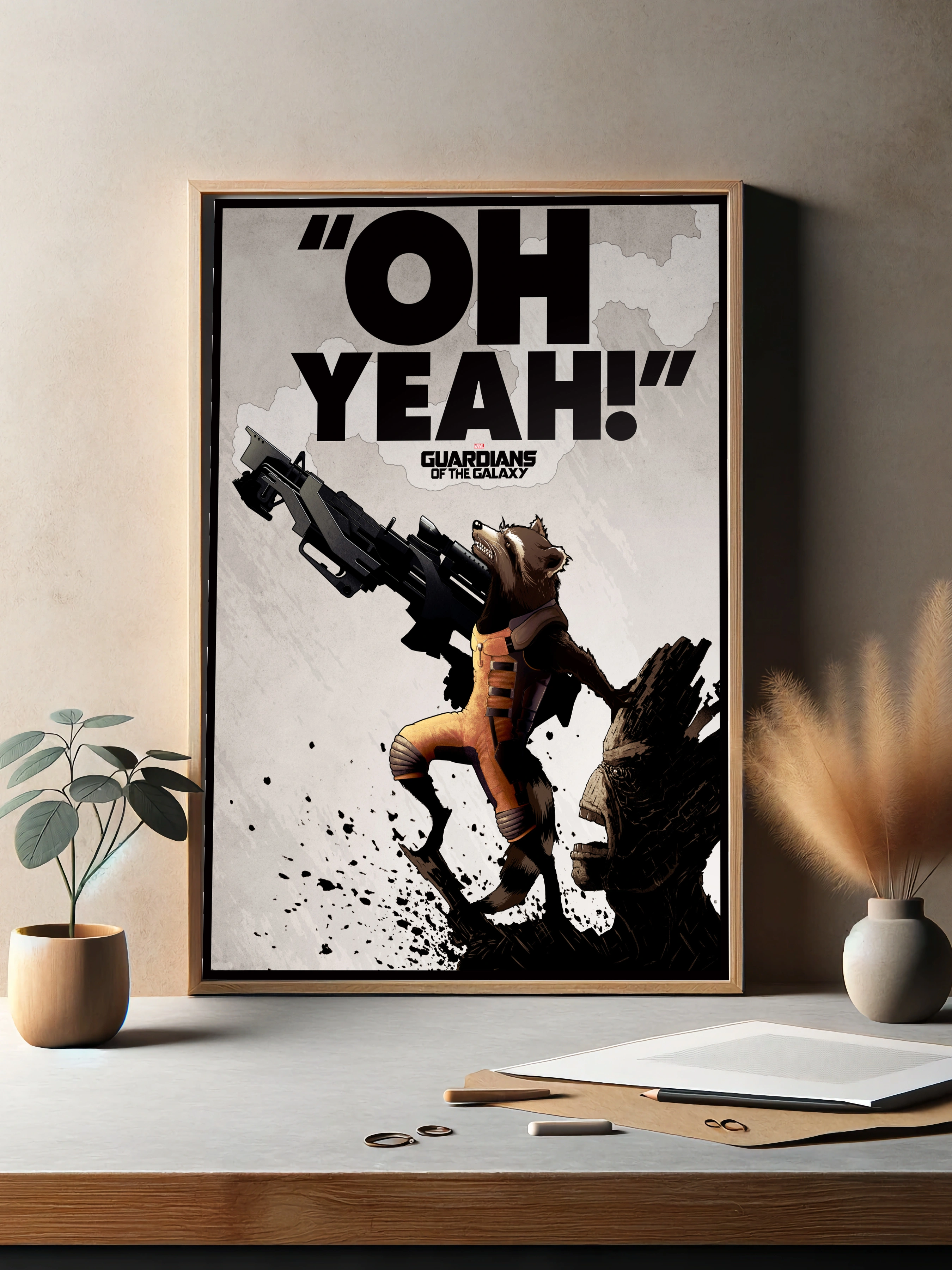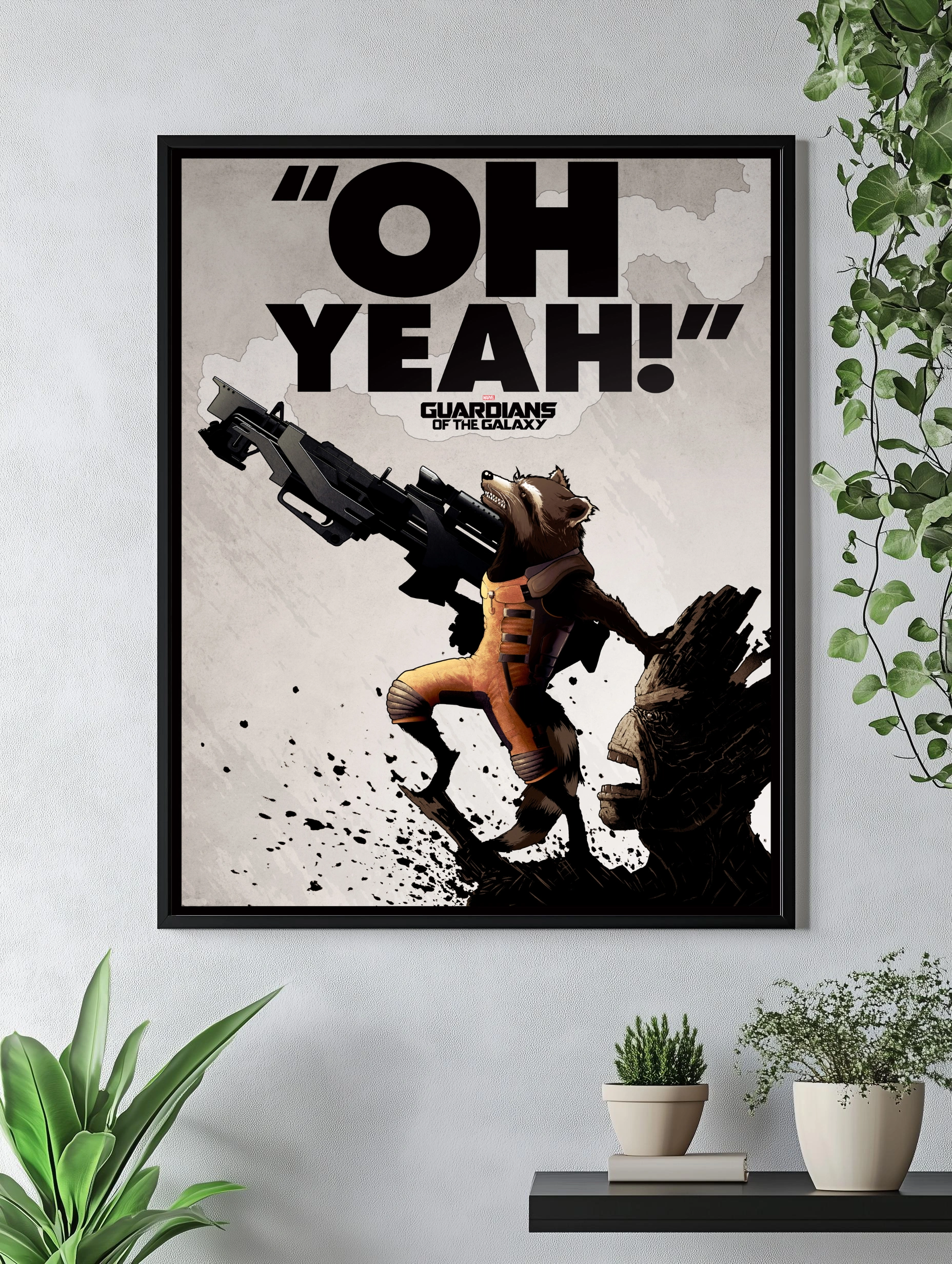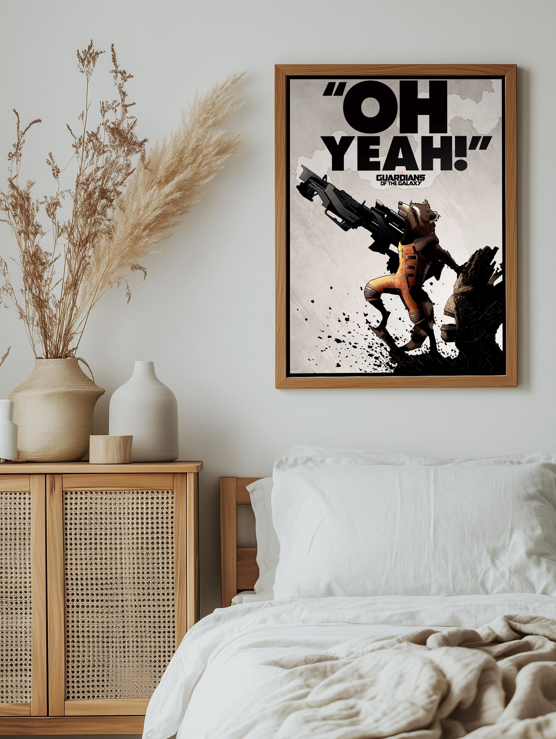 Декоративный плакат представляет Ракету — персонажа из фильма и комиксов Marvel «Стражи Галактики». Он изображён в динамичной позе с огромным оружием, рядом его друг Грут. Фон выполнен в светло-серых тонах, акцент на тёмных силуэтах и фирменной надписи «Oh Yeah!». Это уникальное интерьерное искусство для фанатов Marvel и современного декоративного декора.