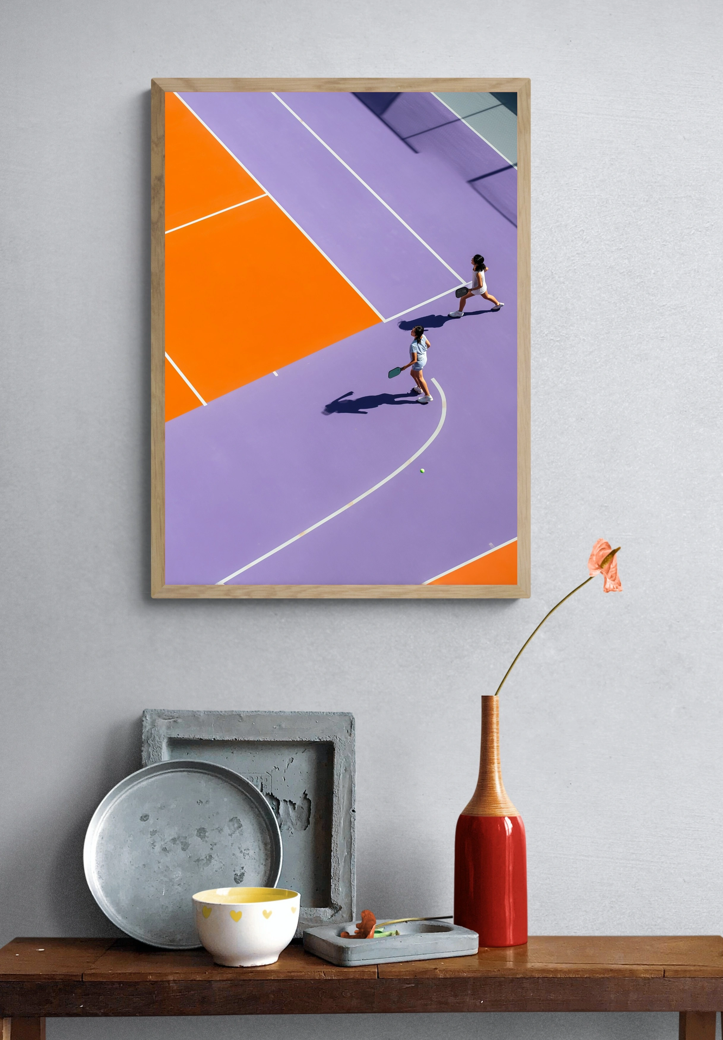 Погрузитесь в мир активного отдыха с этим ярким постером, изображающим двух игроков на теннисном корте. Они уверенно движутся по ярким полям оранжевого и фиолетового цветов, создавая динамичную атмосферу. Каждый шаг подчеркивается четкими белыми линиями, разделяющими корты, а солнечный свет добавляет яркости и энергии. Этот постер не только украсит ваш интерьер, но и вдохновит на занятия спортом. Идеально подходит для спортивных залов, офисов или игровых комнат, он привлечет внимание молодежи и активных людей, стремящихся к здоровому образу жизни.