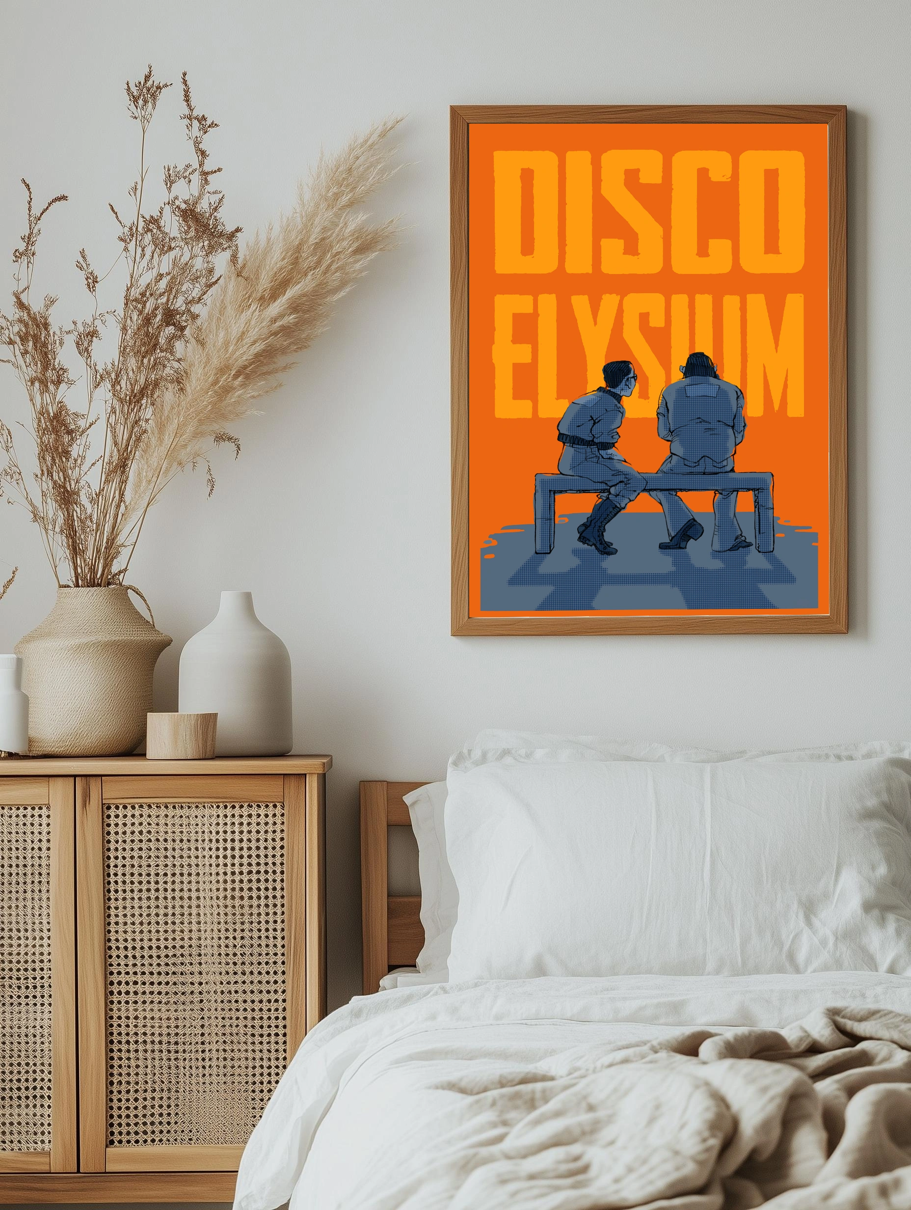 Яркий интерьерный арт с преобладанием оранжевого и синего цветов представляет двух мужчин, сидящих на скамейке спиной к зрителю на фоне крупной надписи DISCO ELYSIUM. Этот художественный плакат в стиле комикса создает атмосферу уюта и интриги, идеально вписываясь в современный интерьер гостиной или офиса.