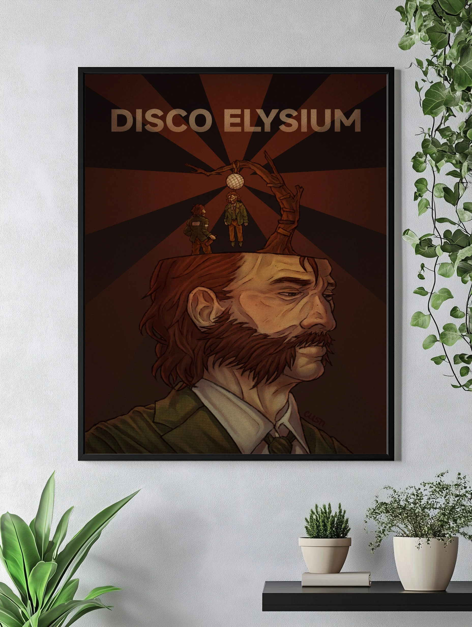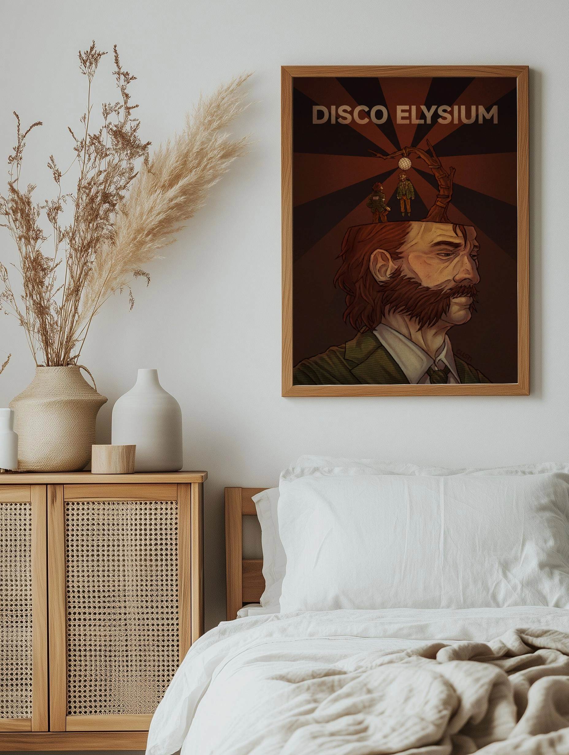 Изображение представляет собой художественный плакат с персонажами из известной видеоигры Disco Elysium. На постере изображён крупный портрет главного героя с густыми бакенбардами, а в центре композиции — сцена с двумя персонажами и деревом с диско-шаром. Цветовая палитра выдержана в тёплых коричневых и бежевых тонах, создавая атмосферу загадочности и глубины, идеально подходящую для современного интерьера и стильного декора стен.