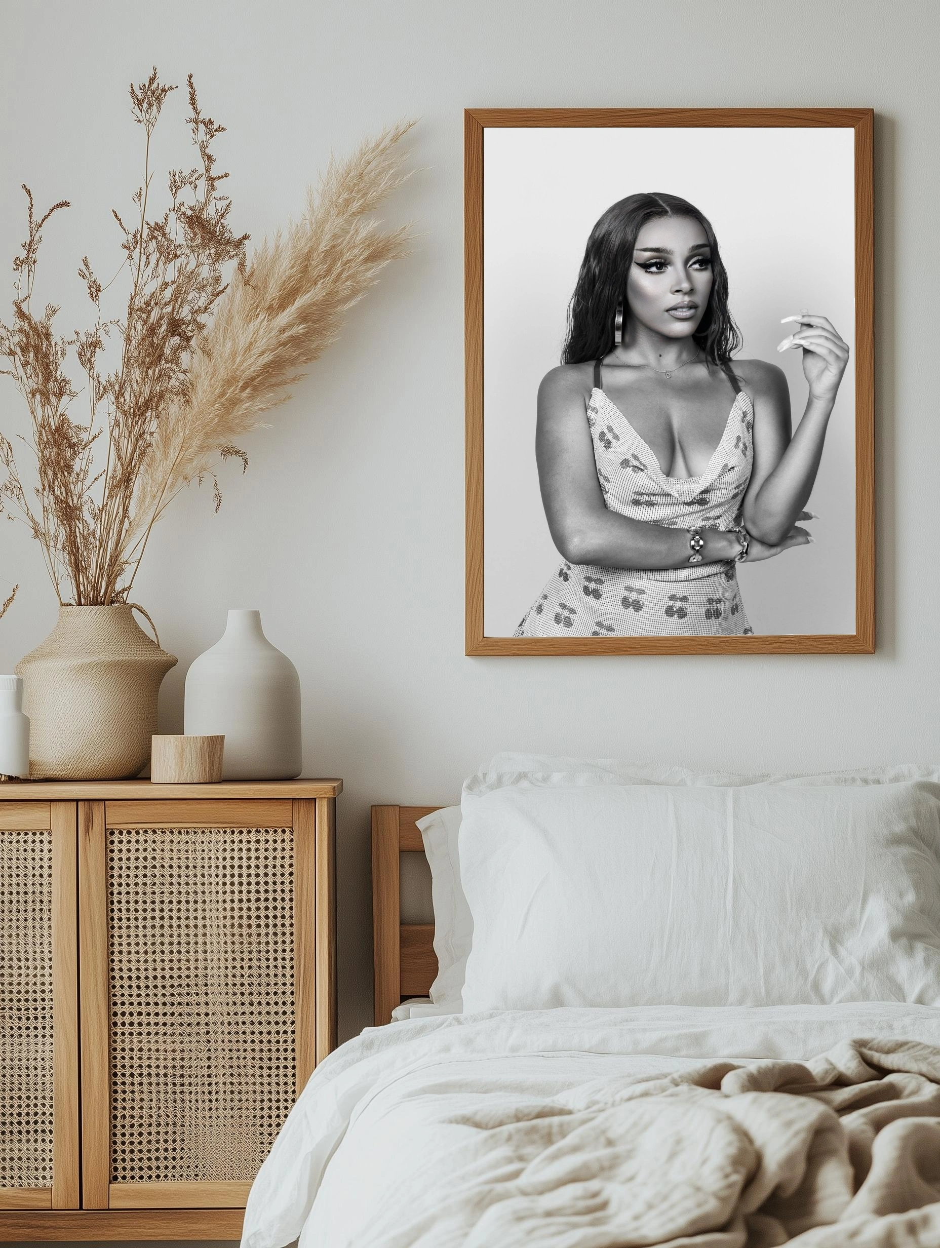 Изображение представляет собой черно-белую фотографию женщины в стильном платье с узором из вишен. Внимание акцентируется на выразительном макияже с акцентом на глаза, крупные серьги и элегантную позу. Это интерьерный арт с тонким чувством стиля, идеально подходящий для украшения гостиной или офиса, создающий атмосферу утончённости и современного искусства для стен.