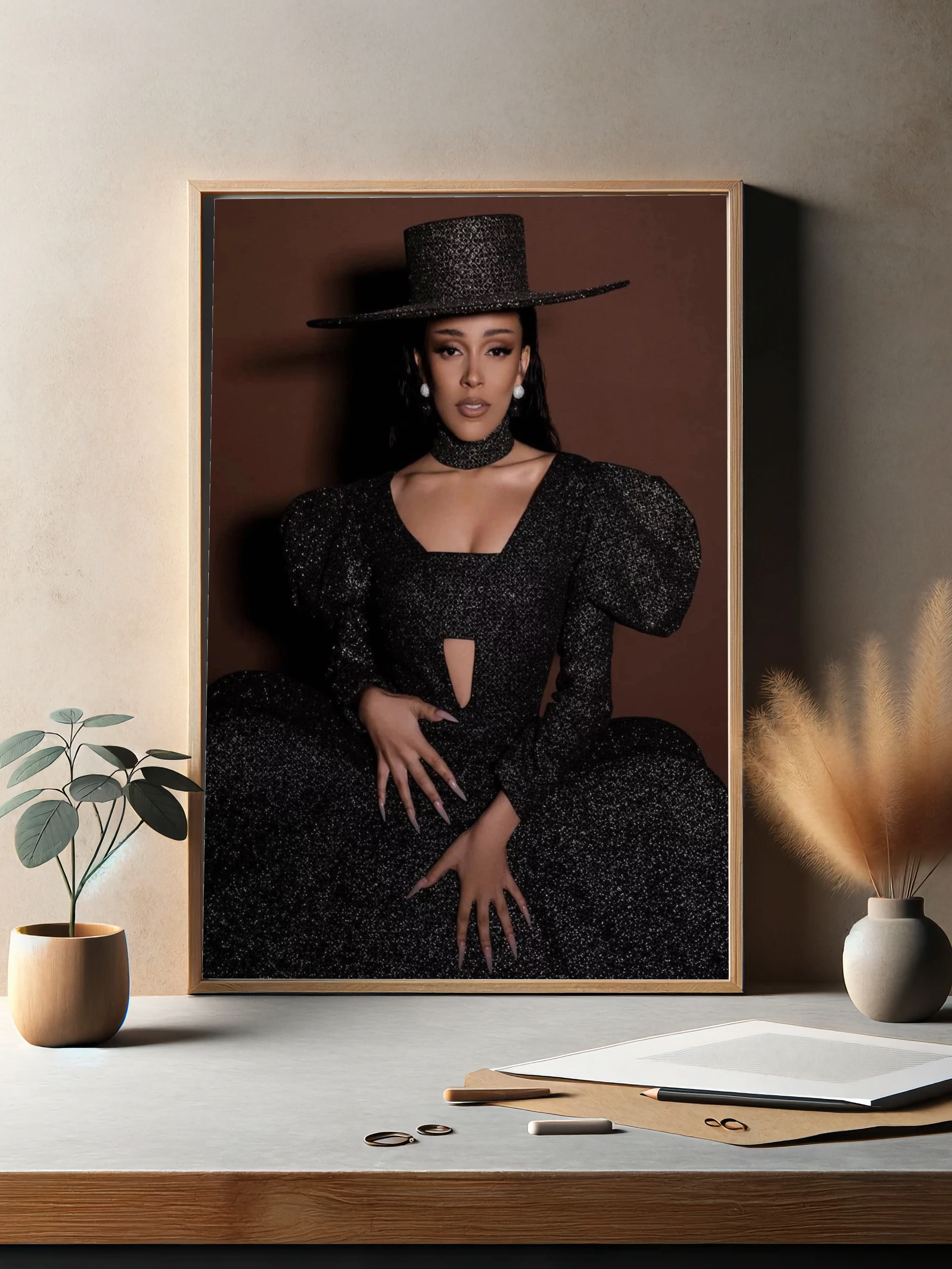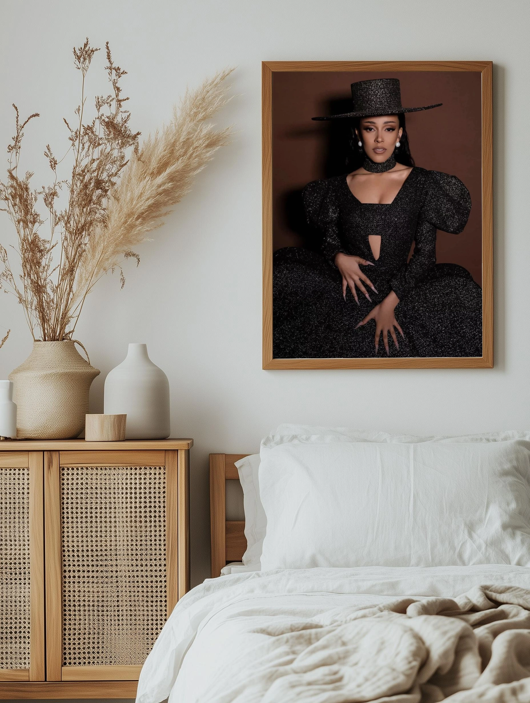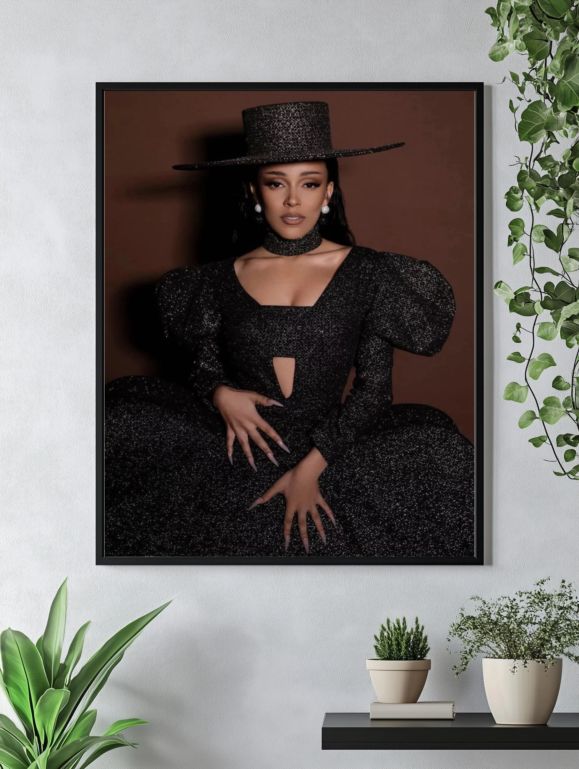 На изображении изображена женщина в элегантном черном платье с объемными рукавами и глубоким вырезом, дополненная широкополой черной шляпой и жемчужными серьгами. Фон нейтральный, коричневого оттенка, что подчеркивает утонченность и гламурность образа. Этот интерьерный декор идеально подходит для создания стильного акцента в гостиной или офисе, сочетая современное искусство и декоративный плакат с уникальным дизайном.