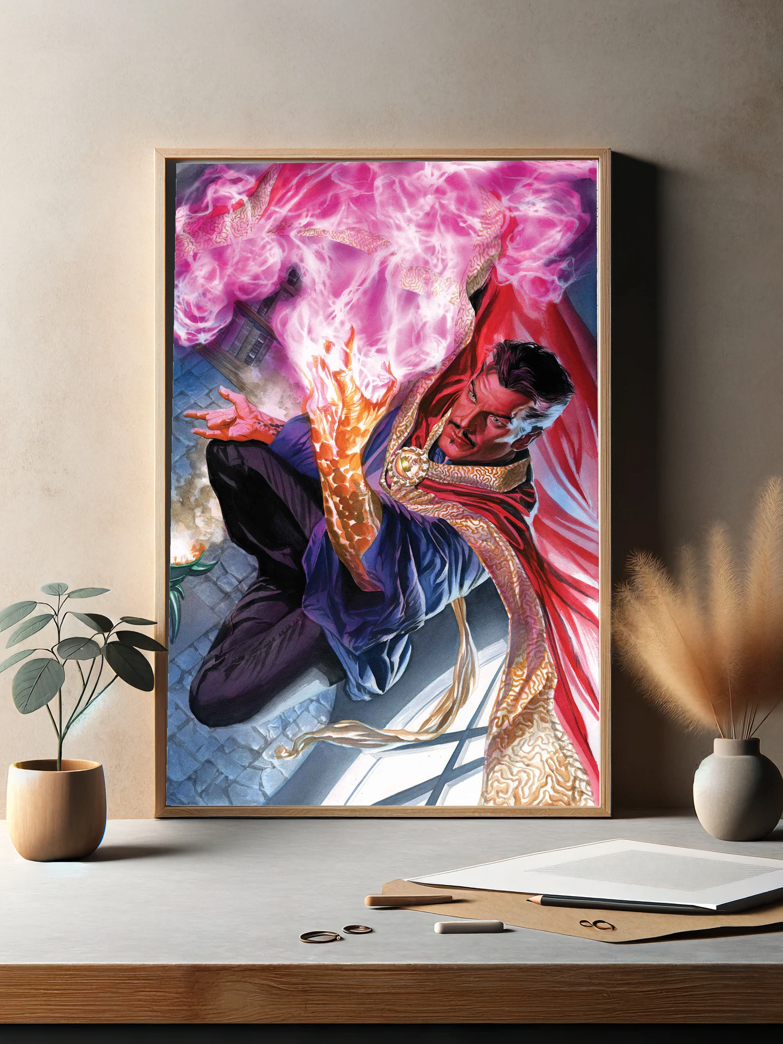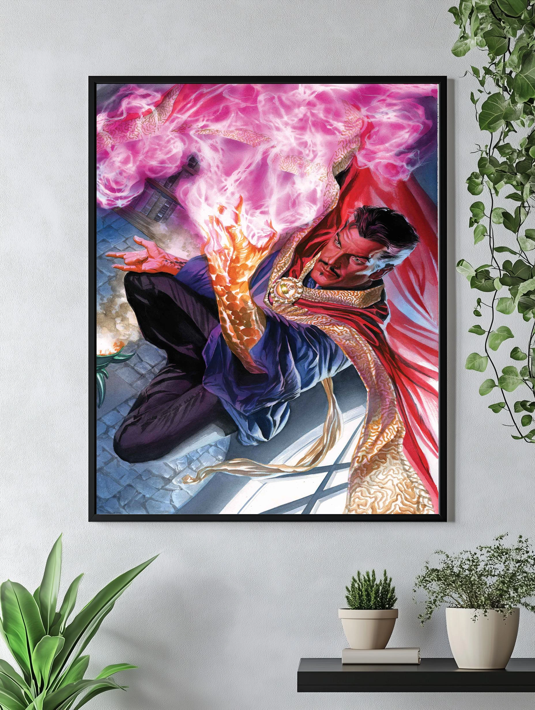 Яркое художественное изображение Доктора Стрэнджа в движении вызова магии с огненными и светящимися эффектами. Картина для гостиной или офиса отражает динамику и мистический характер персонажа Marvel в насыщенных красных, розовых и синих тонах. Идеально подойдет как стильный декор стен и современное искусство для интерьера.