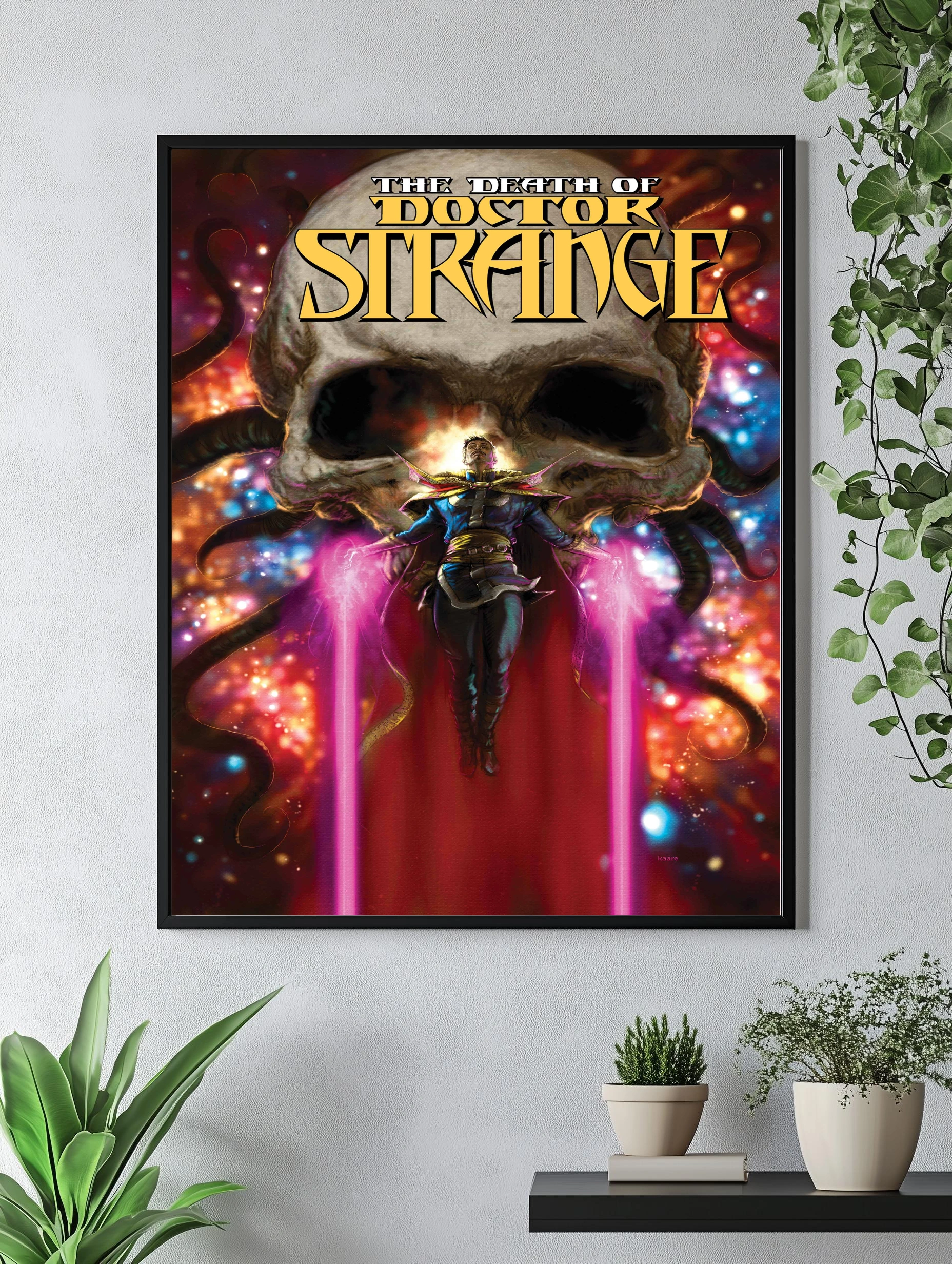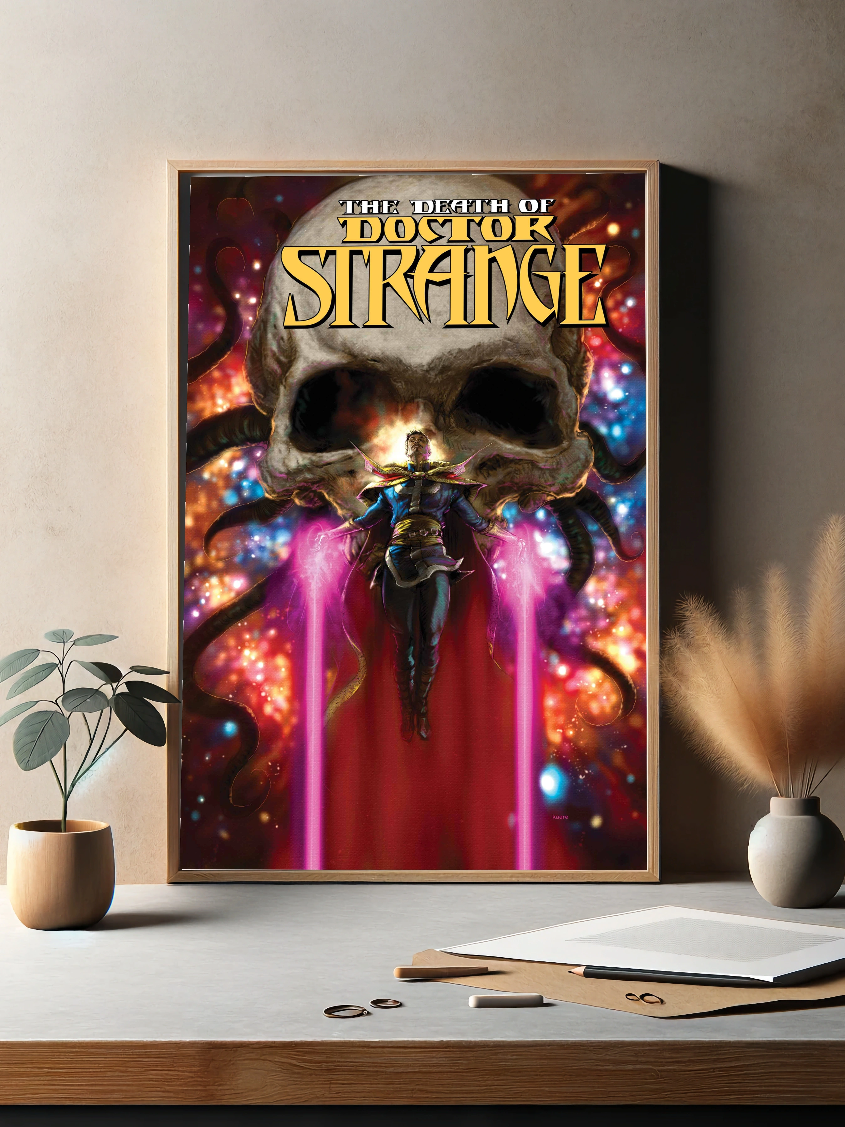 Красочное изображение Доктора Стрэнджа, героя вселенной Marvel, парящего на фоне огромного черепа и мистических огней. Этот интерьерный художественный плакат передает атмосферу магии, борьбы и драматизма. Идеальное современное искусство для стен, подходящее для спальни или гостиной.