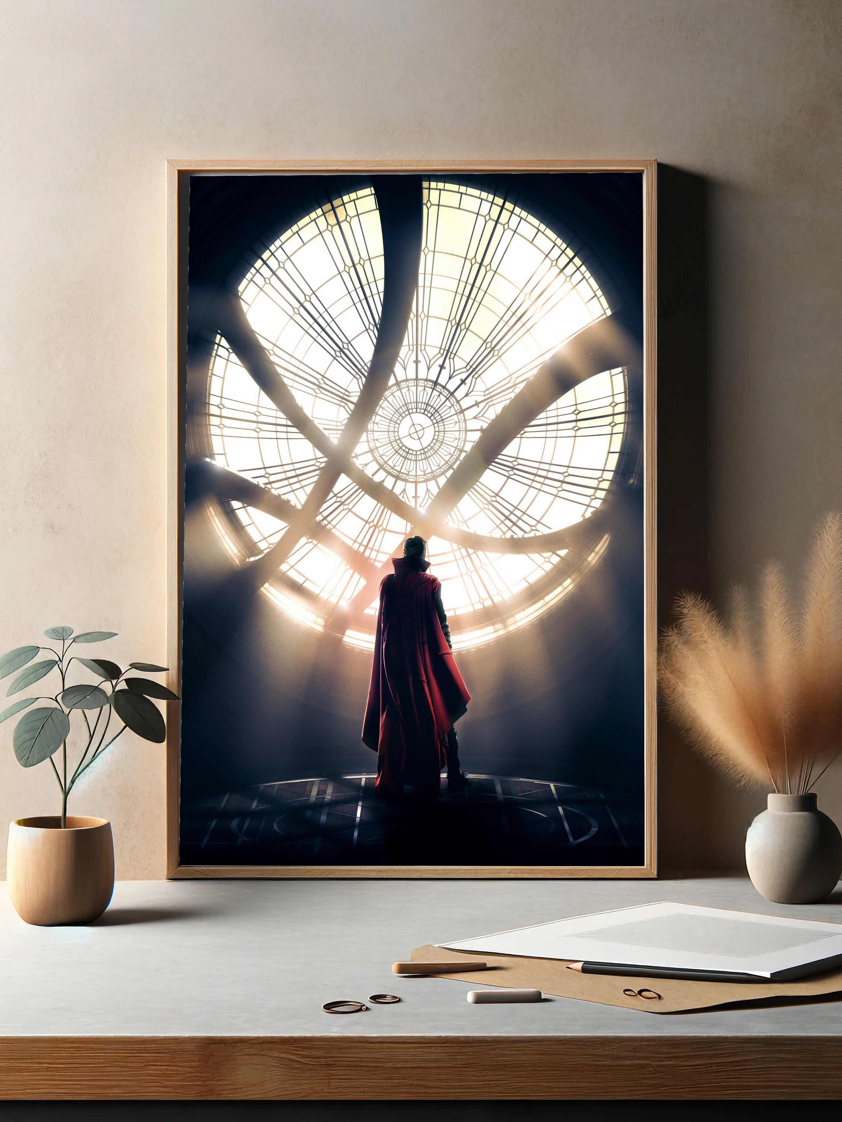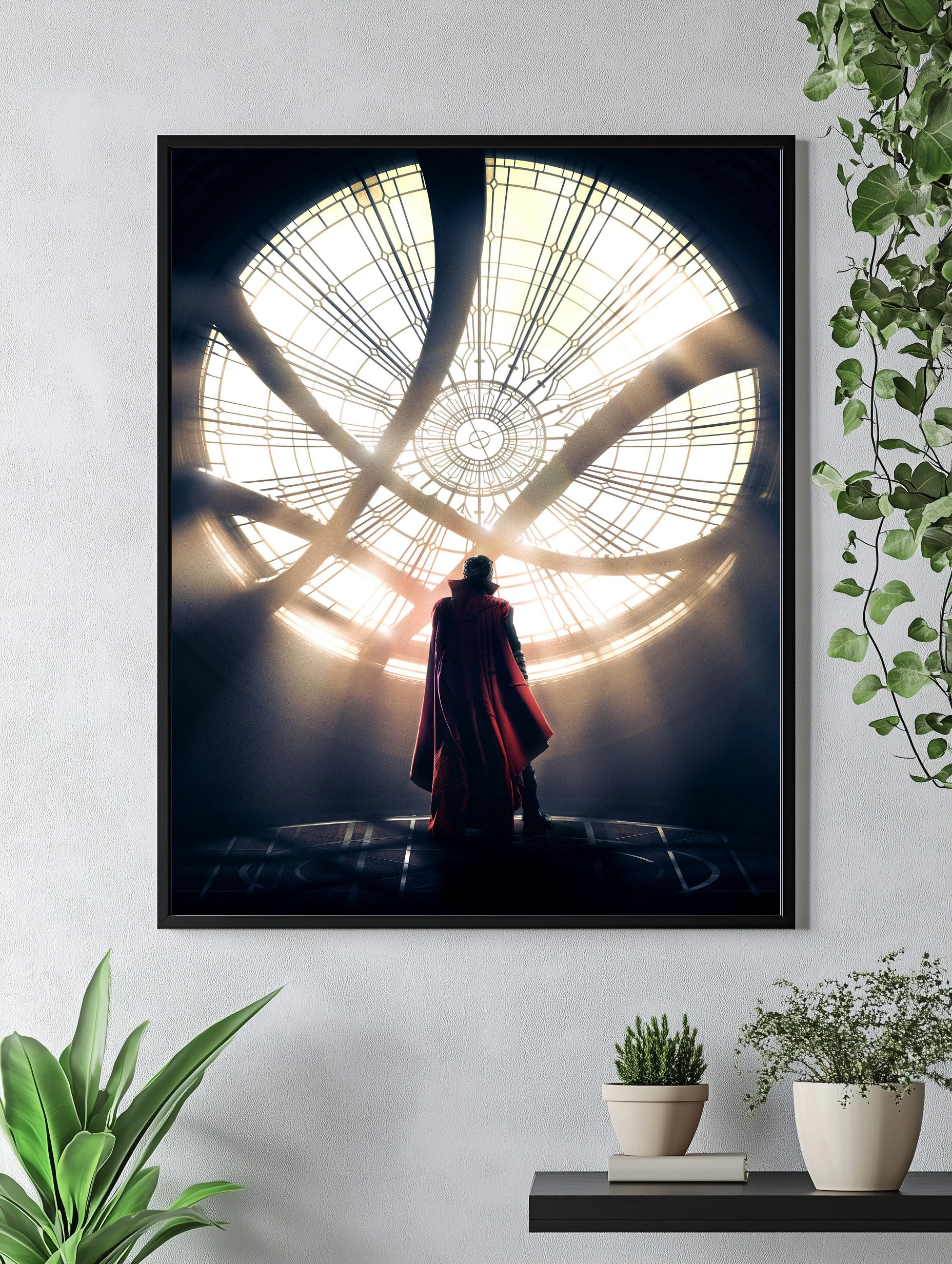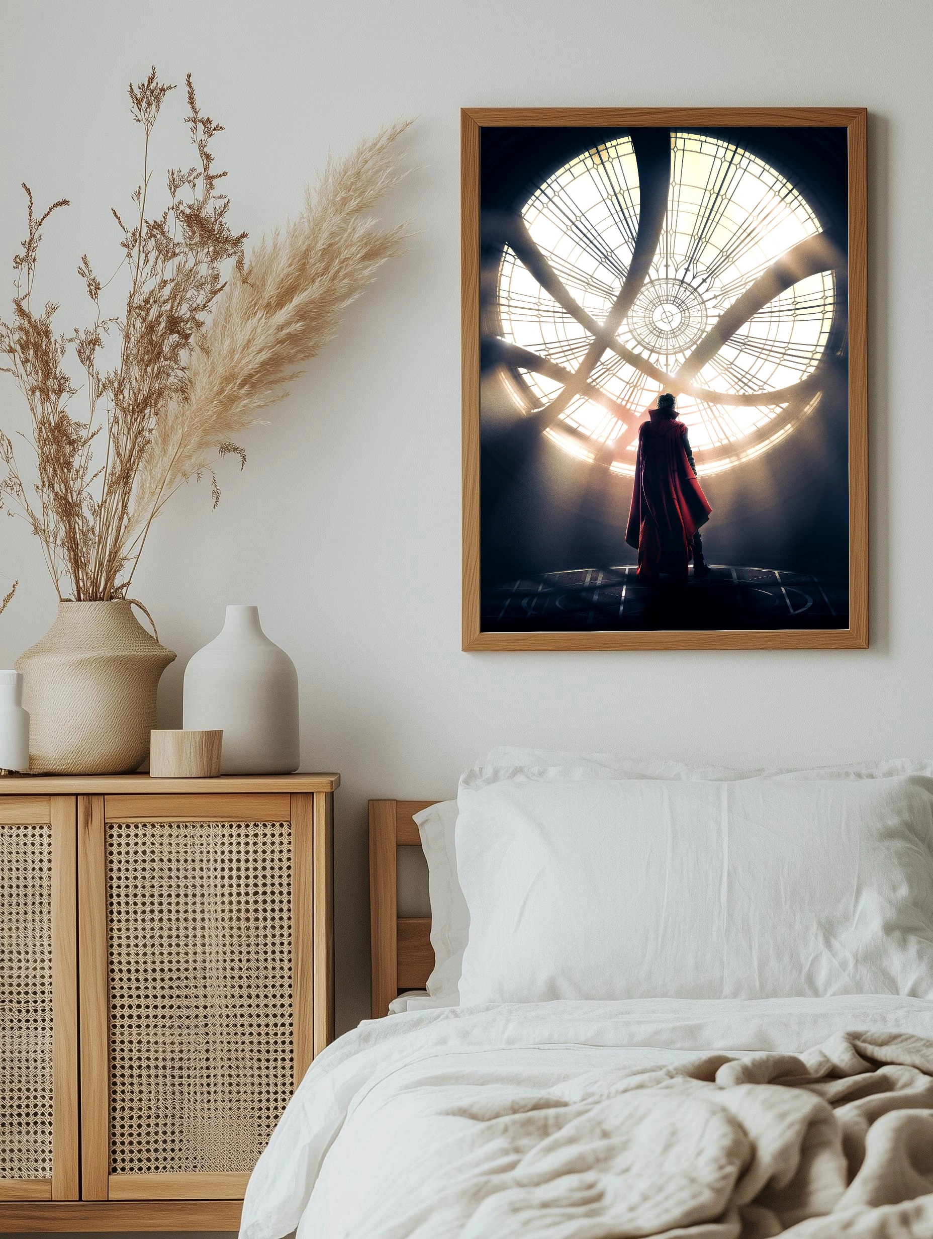 Изображение представляет Доктора Стрэнджа — известного персонажа Marvel в его культовом красном мантии, стоящего в мистическом зале с огромным сверкающим стеклянным куполом над головой. Свет, проходящий через купол, создаёт мистическую и волшебную атмосферу, идеально подходящую для интерьера, добавляя современное искусство для стен и стильный декор. Этот художественный плакат прекрасно подойдёт как картина для гостиной или офиса, придавая помещению уникальные энергетические вибрации.
