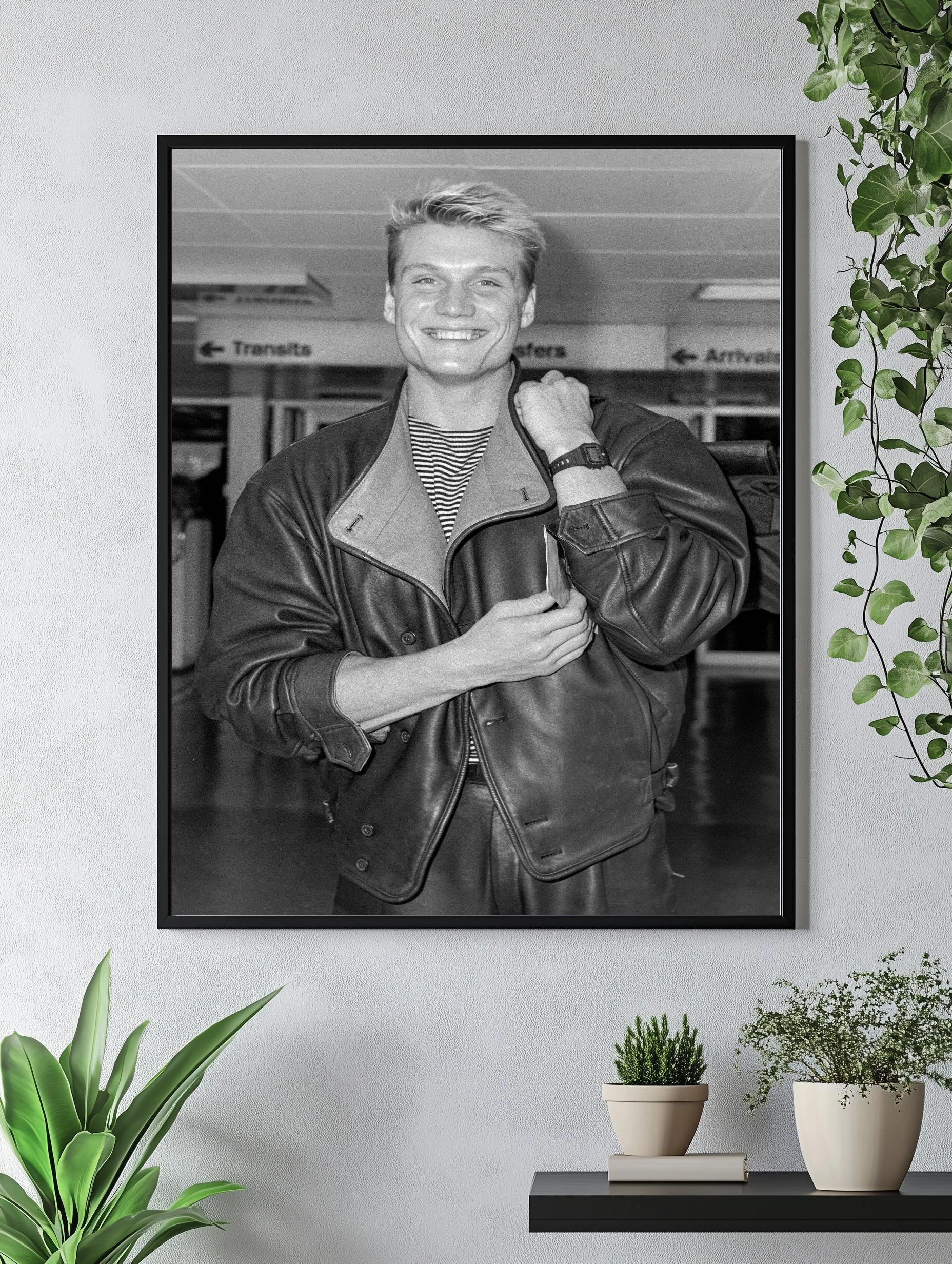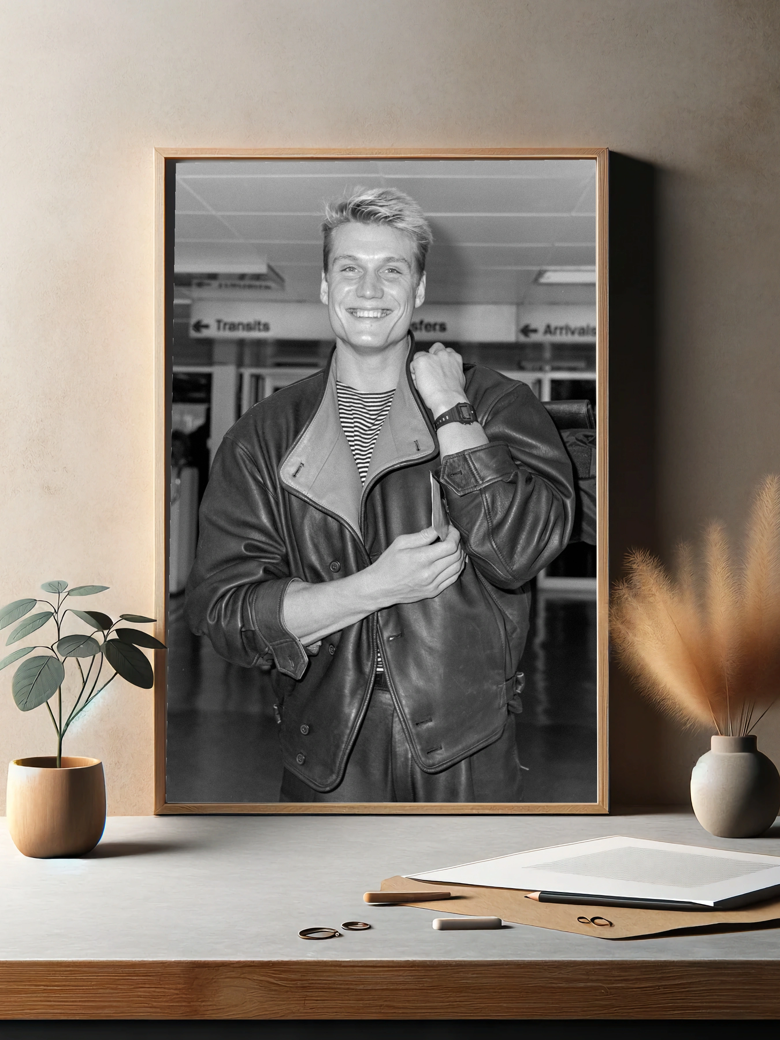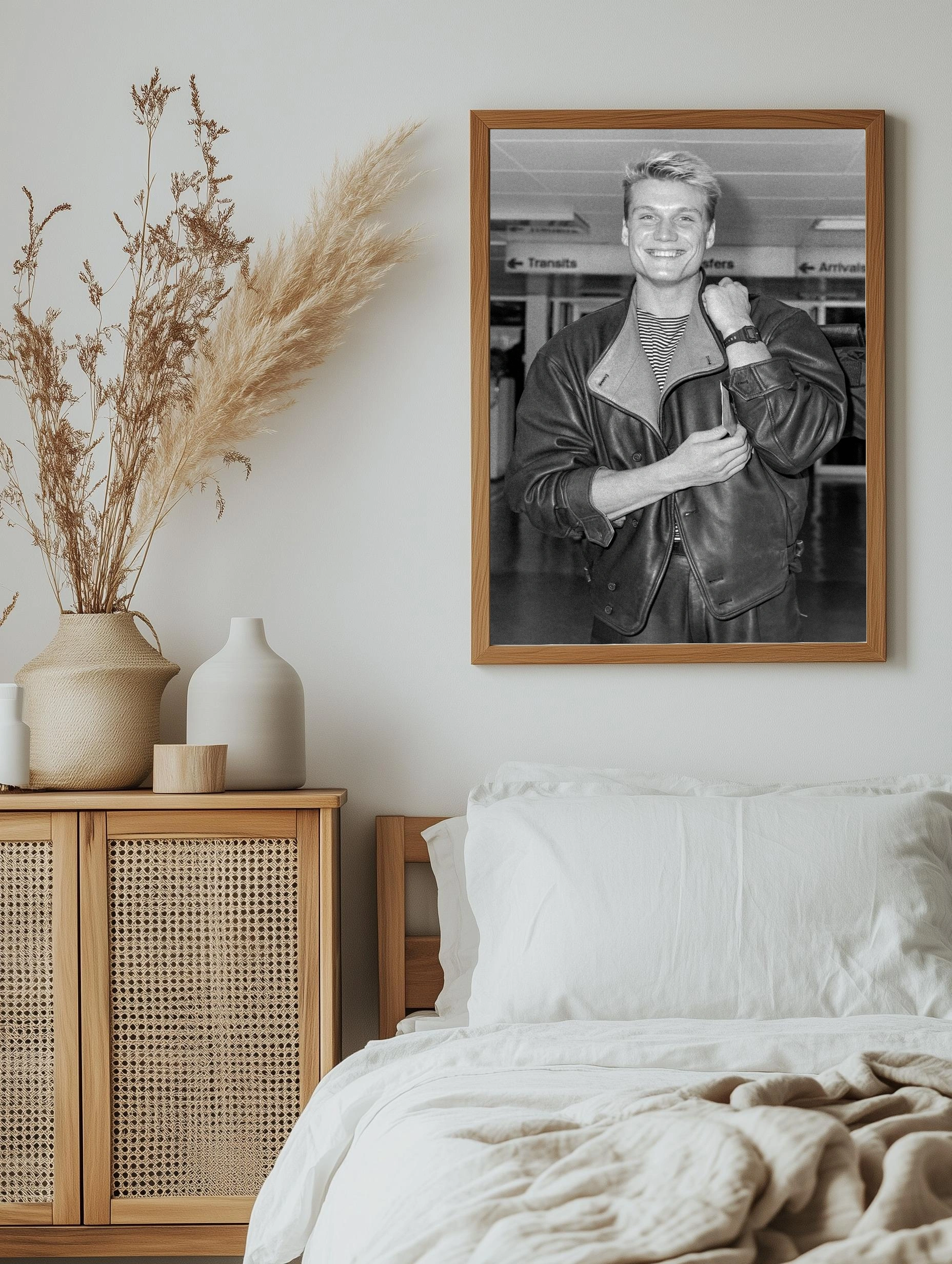 Черно-белая фотография молодого мужчины с широкой улыбкой, одетого в кожаную куртку поверх полосатой футболки. Фон — интерьер аэропорта с указателями на транспорты и прилеты. Этот интерьерный арт для стен передает ностальгию и атмосферу 80-х, подходит для оригинального декора офиса или гостиной.