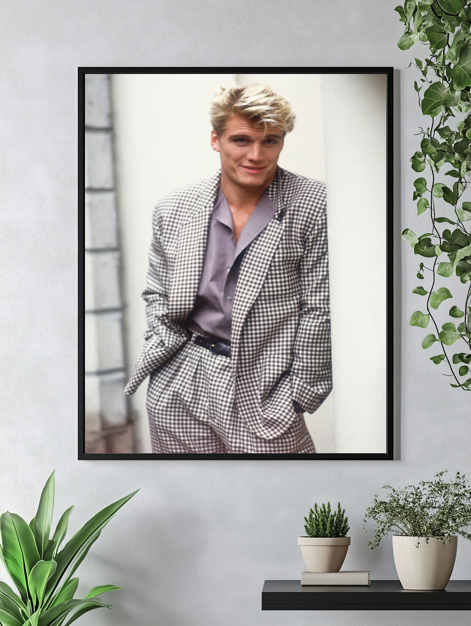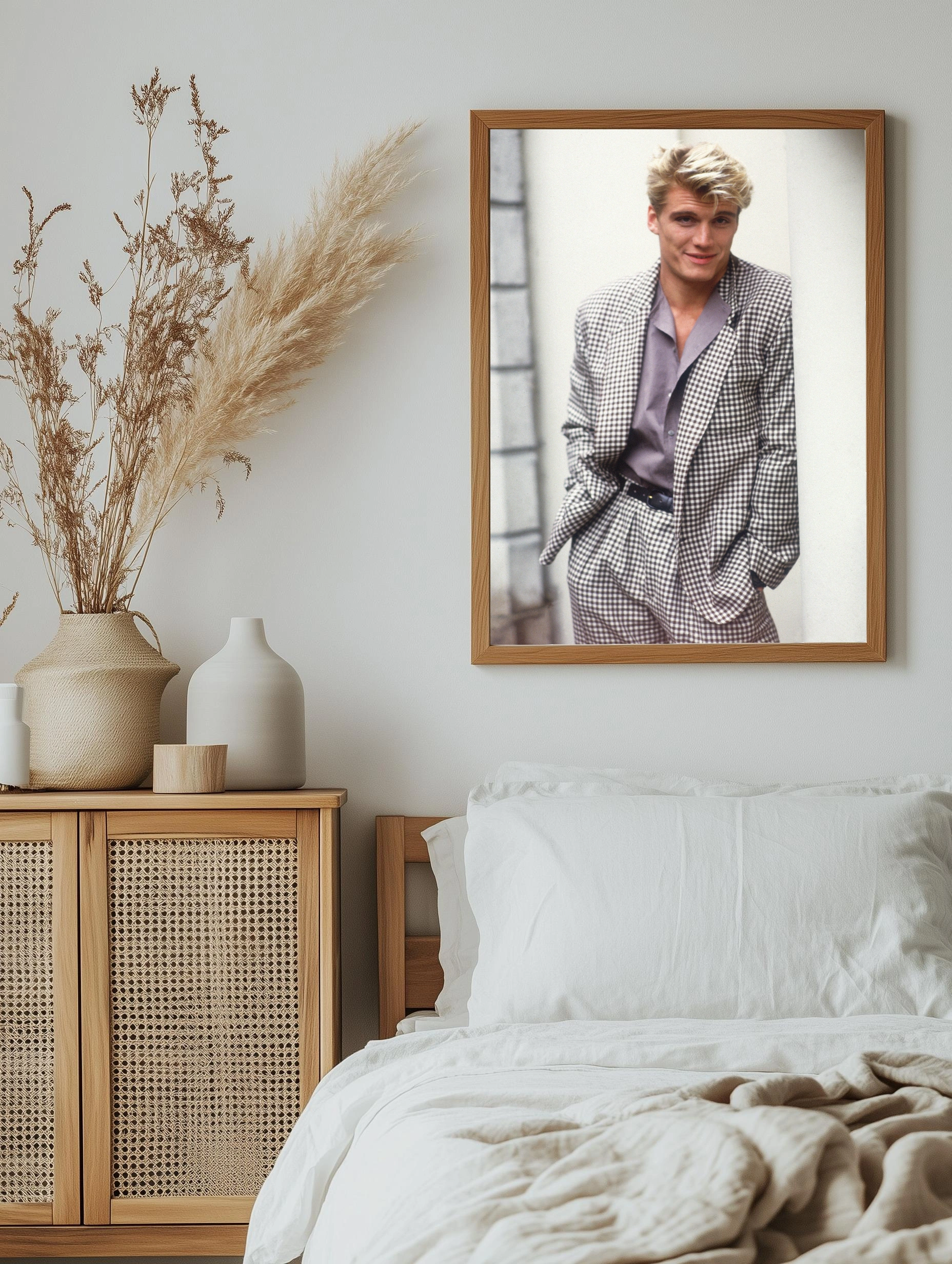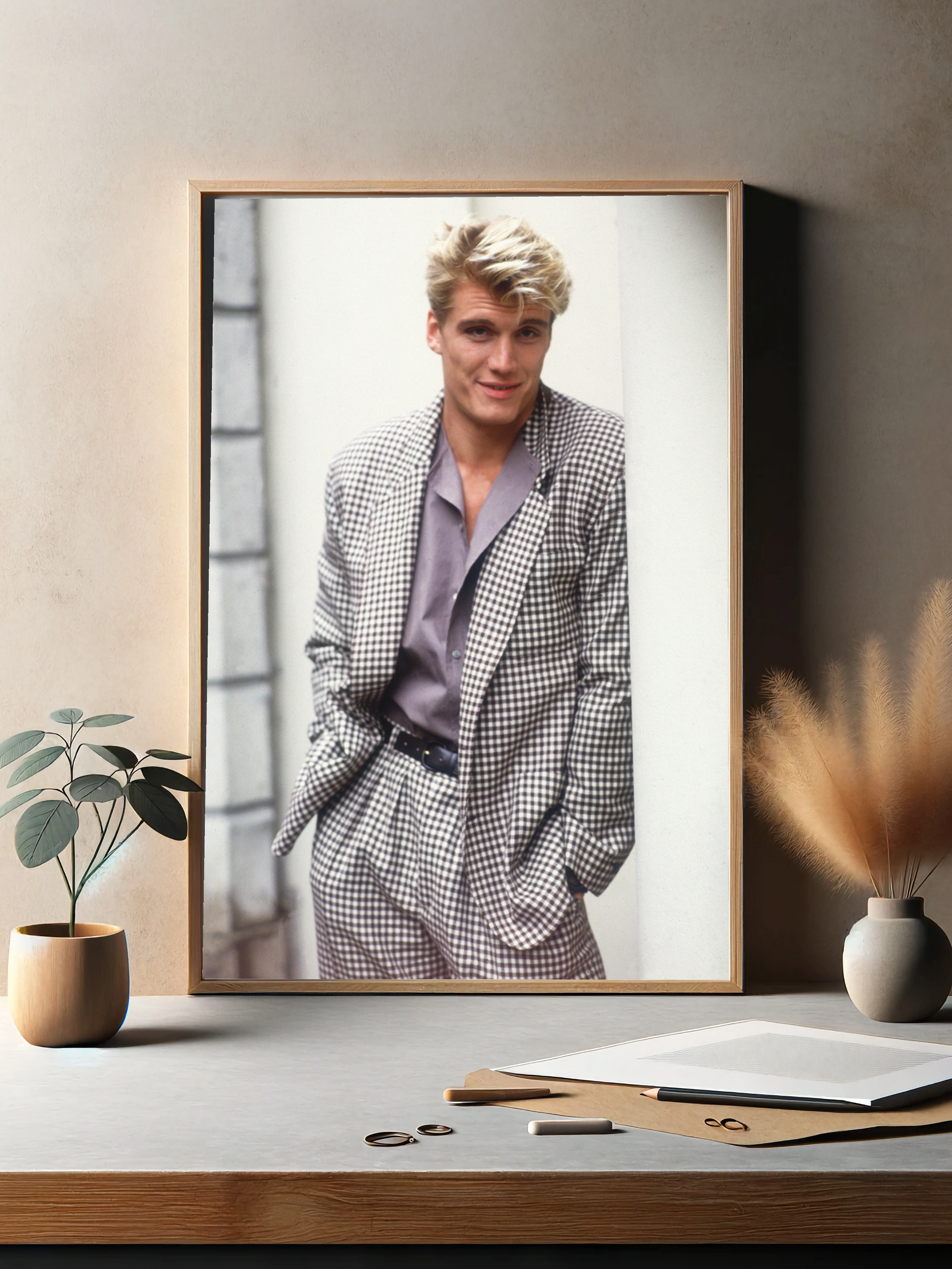 Фотография в стиле ретро 1980-х годов, на которой молодая мужчина в клетчатом костюме с светло-серой рубашкой позирует в повседневной обстановке. Образ наполнен лёгкостью и стилем, подчёркивающим модные тенденции того времени. Идеально для интерьера в стиле винтаж или ретро, декоративный плакат принесёт уникальность и стильный декор стен.