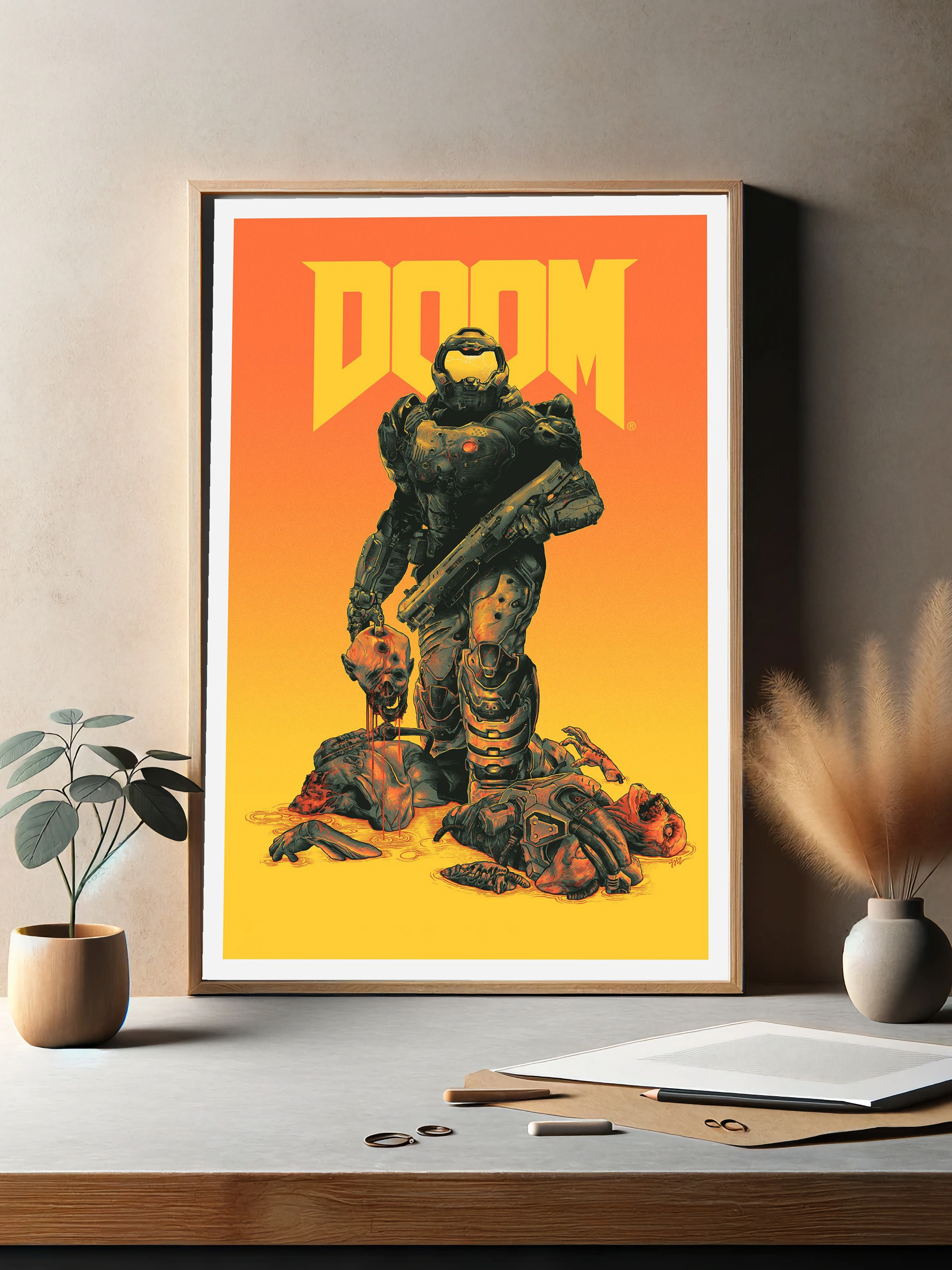Изображение показывает главного героя игры DOOM — Думы Солдата в его характерной броне, держащего окровавленный череп и стоящего на фоне поверженных врагов. Стиль выполнен в мрачной, но детализированной манере с акцентом на динамику и силу. Картина подходит как интерьерный декоративный плакат для поклонников видеоигр и цифрового искусства.