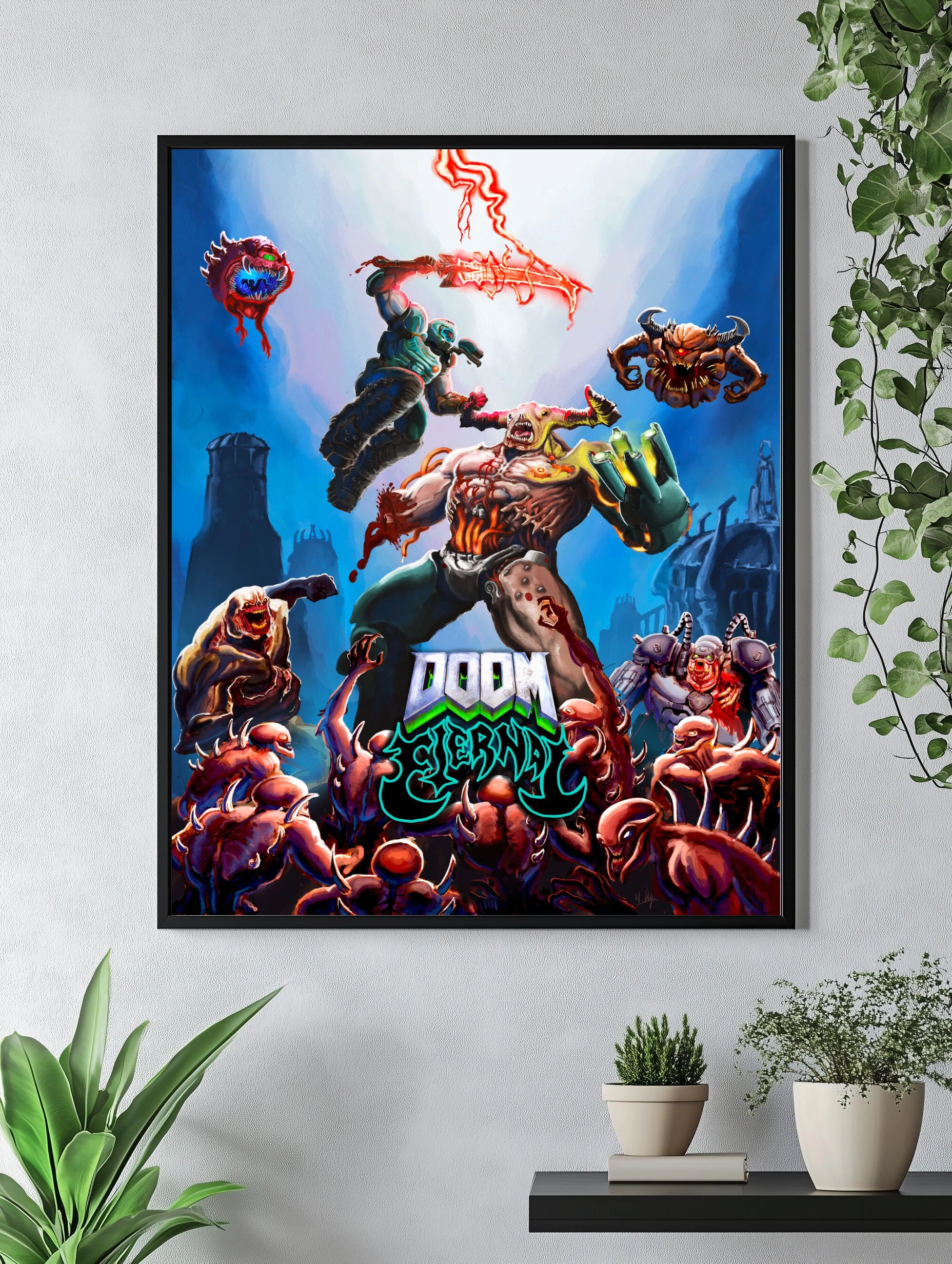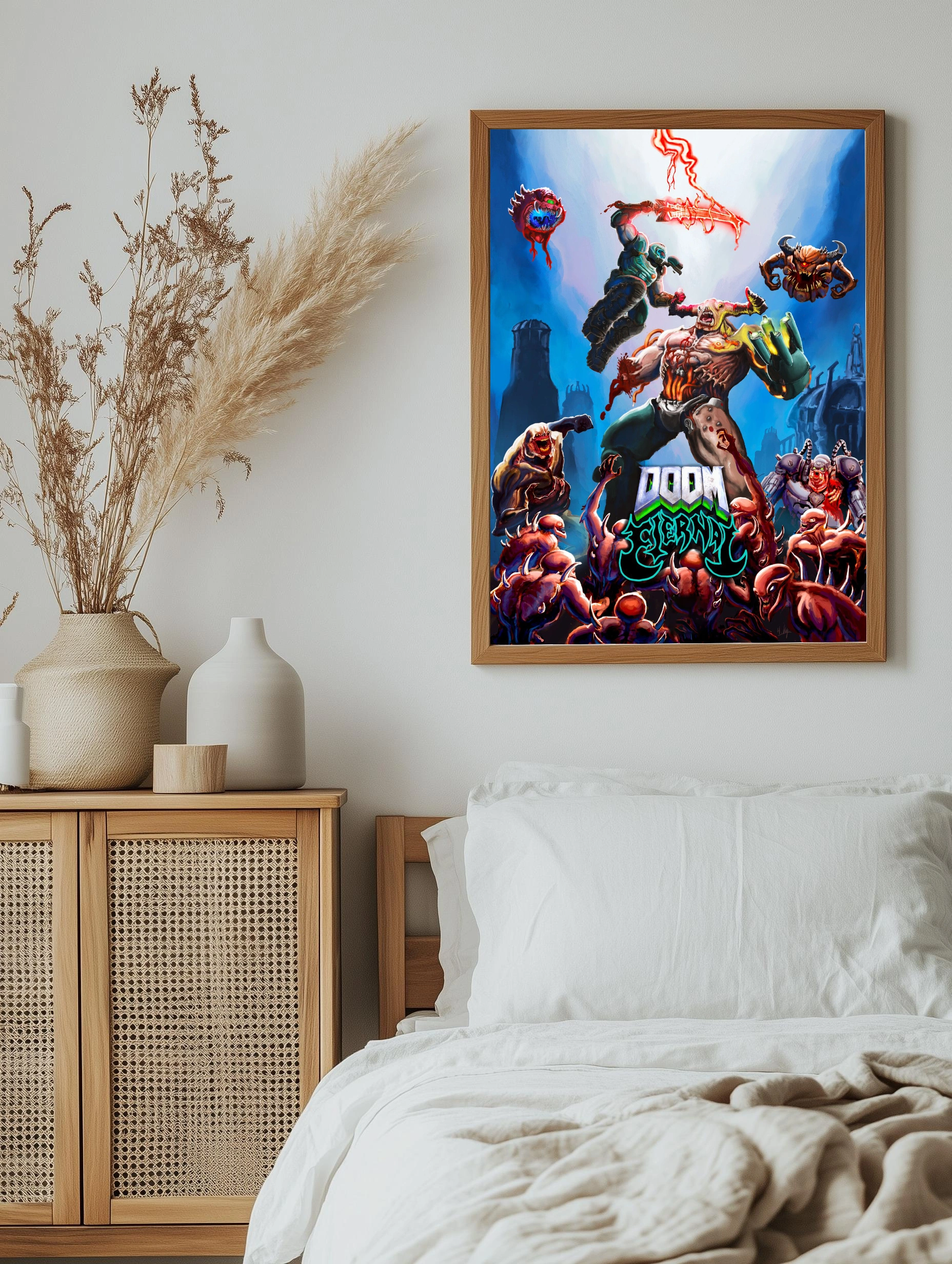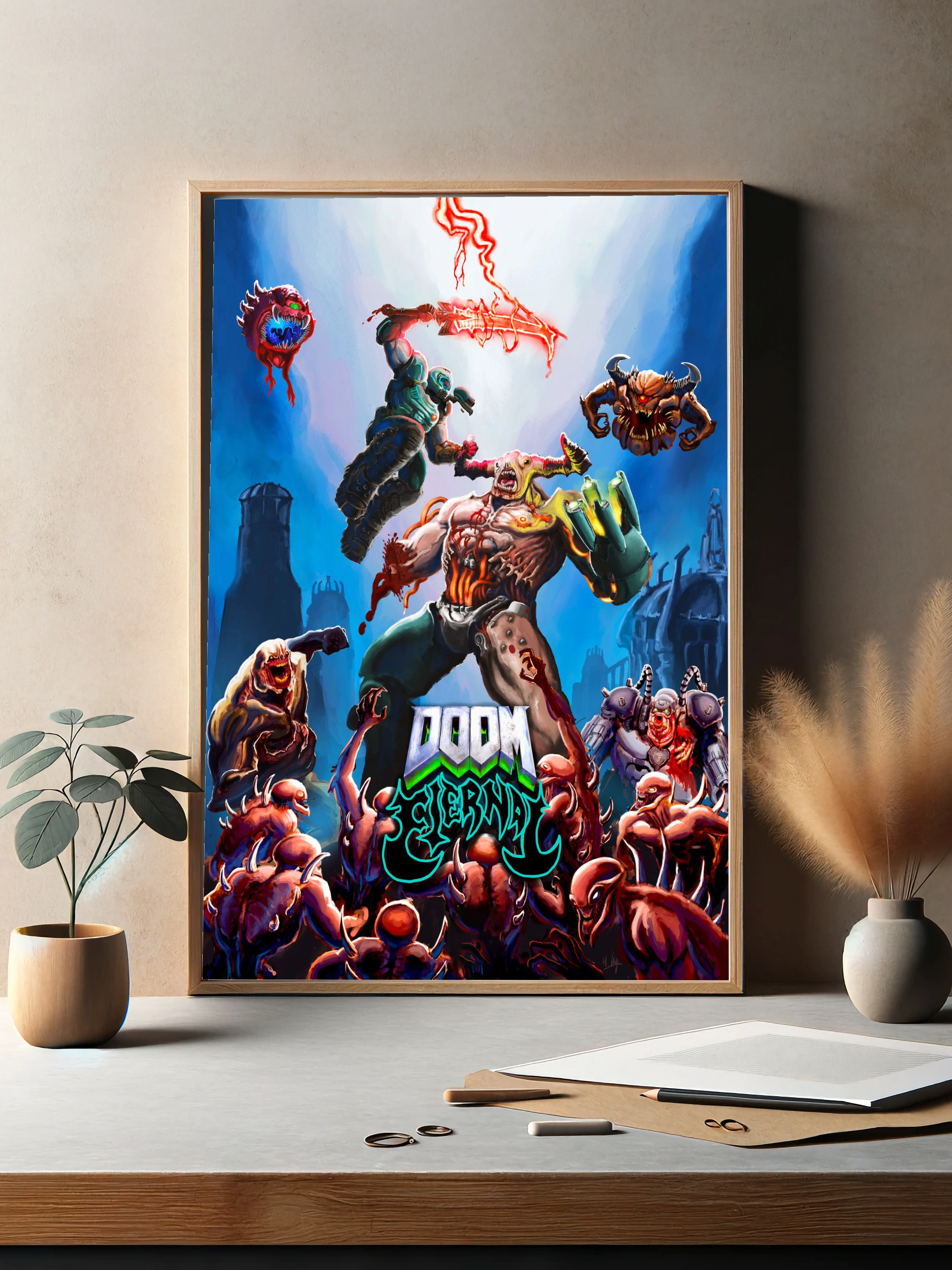 Яркая и динамичная картина, изображающая героя из игры Doom Eternal в битве с многочисленными демонами на фоне разрушенного индустриального пейзажа. Картина насыщена контрастными красными, оранжевыми и синими цветами, передающими атмосферу напряжённого и яростного сражения. Идеальный интерьерный арт для поклонников игр и современного искусства.