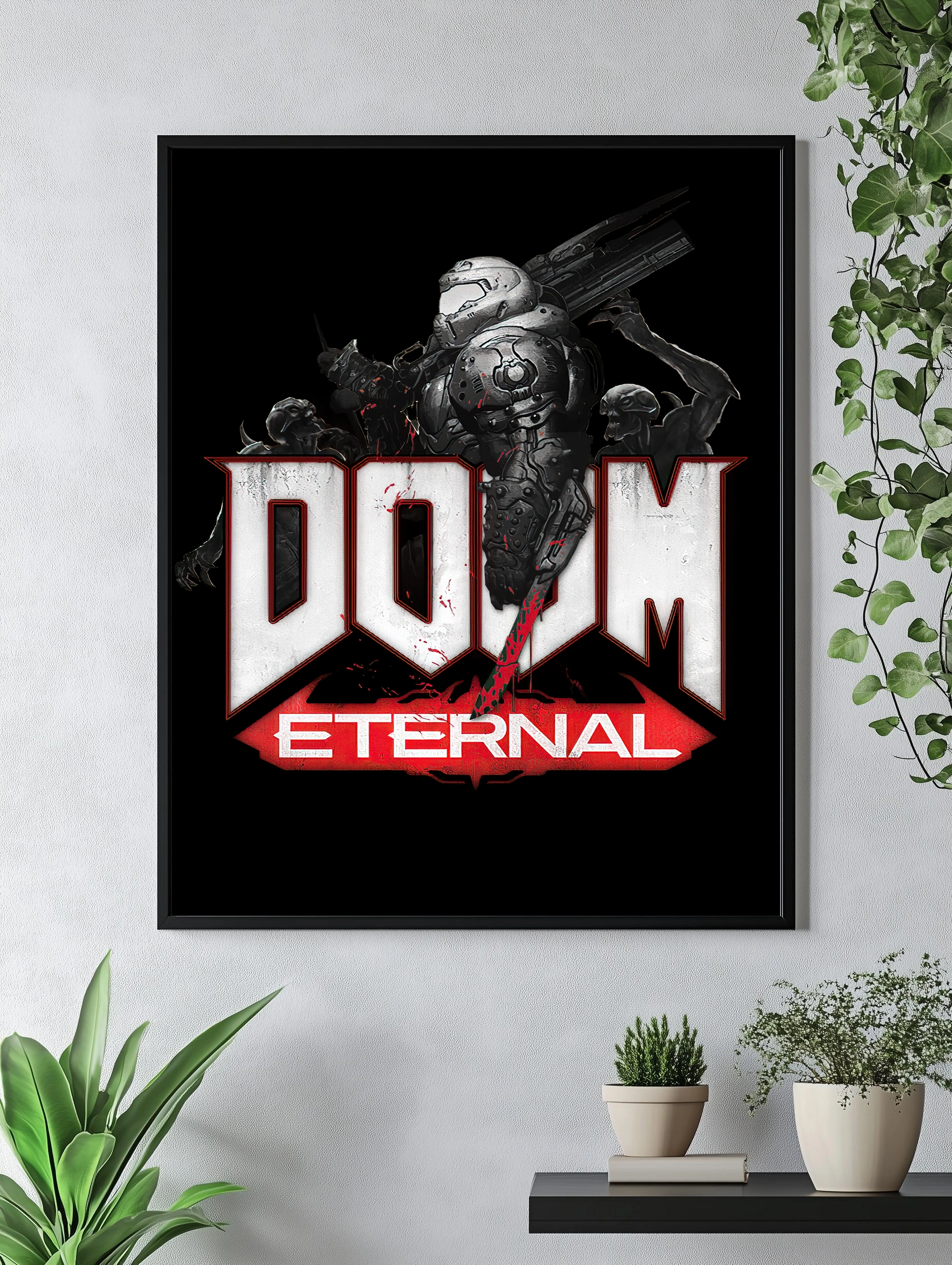 Изображение представляет собой яркую иллюстрацию из игры Doom Eternal — известного шутера. Центральная фигура — вооружённый герой в броне, сражающийся с монстрами. Стиль — мрачный, динамичный, с акцентом на контраст белого, красного и чёрного цветов. Идеально для интерьерного оформления игровой комнаты или офиса.