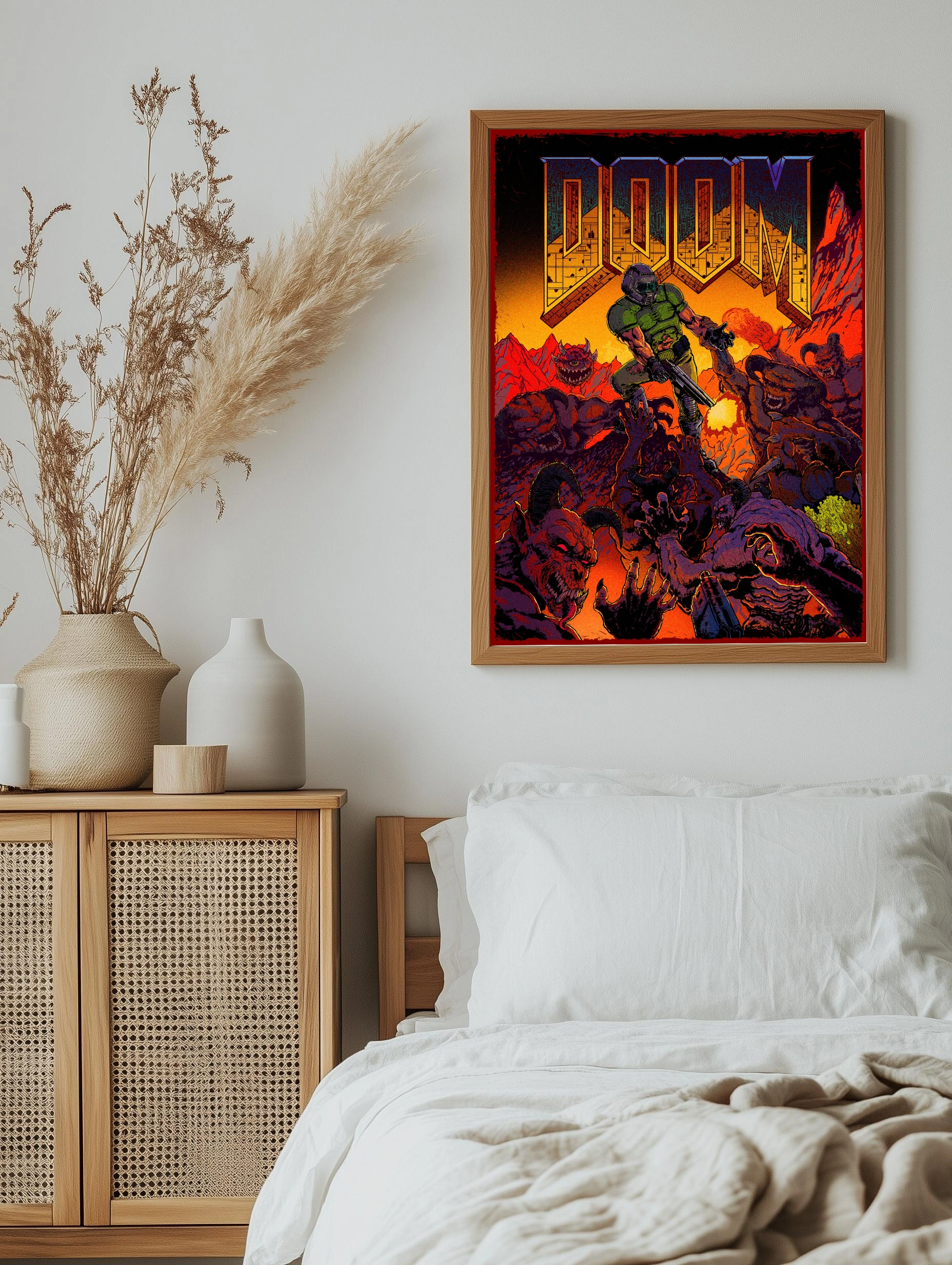 Яркий интерьерный плакат с изображением культового персонажа игры Doom, одетого в зелёную броню и шлем, с дробовиком в руках, сражающегося с многочисленными демонами на фоне огненного пейзажа и красных гор. Стиль выполнен в духе ретро-художественного оформления игр, насыщен красными, оранжевыми и зелёными тонами. Это современное искусство для стен, уникальная картина для гостиной или офиса, наполняющая пространство динамикой и энергией.