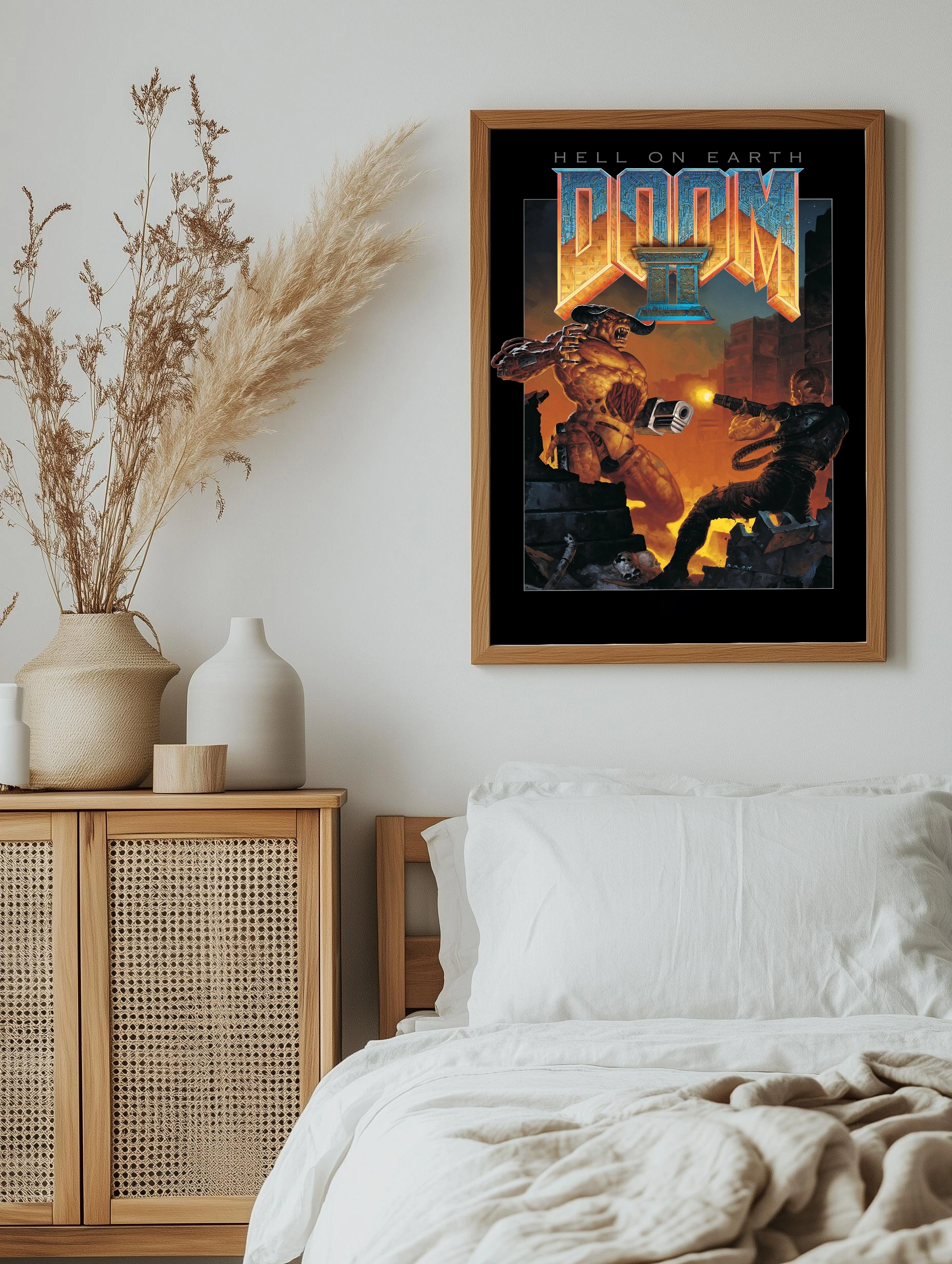 Яркая картина с обложки культовой игры Doom II демонстрирует напряжённую схватку между солдатом и демоном в аду. Огонь, разрушения и динамика боя создают атмосферу хаоса и борьбы, подчеркивая стильное современное искусство для интерьера в жанре видеоигр.