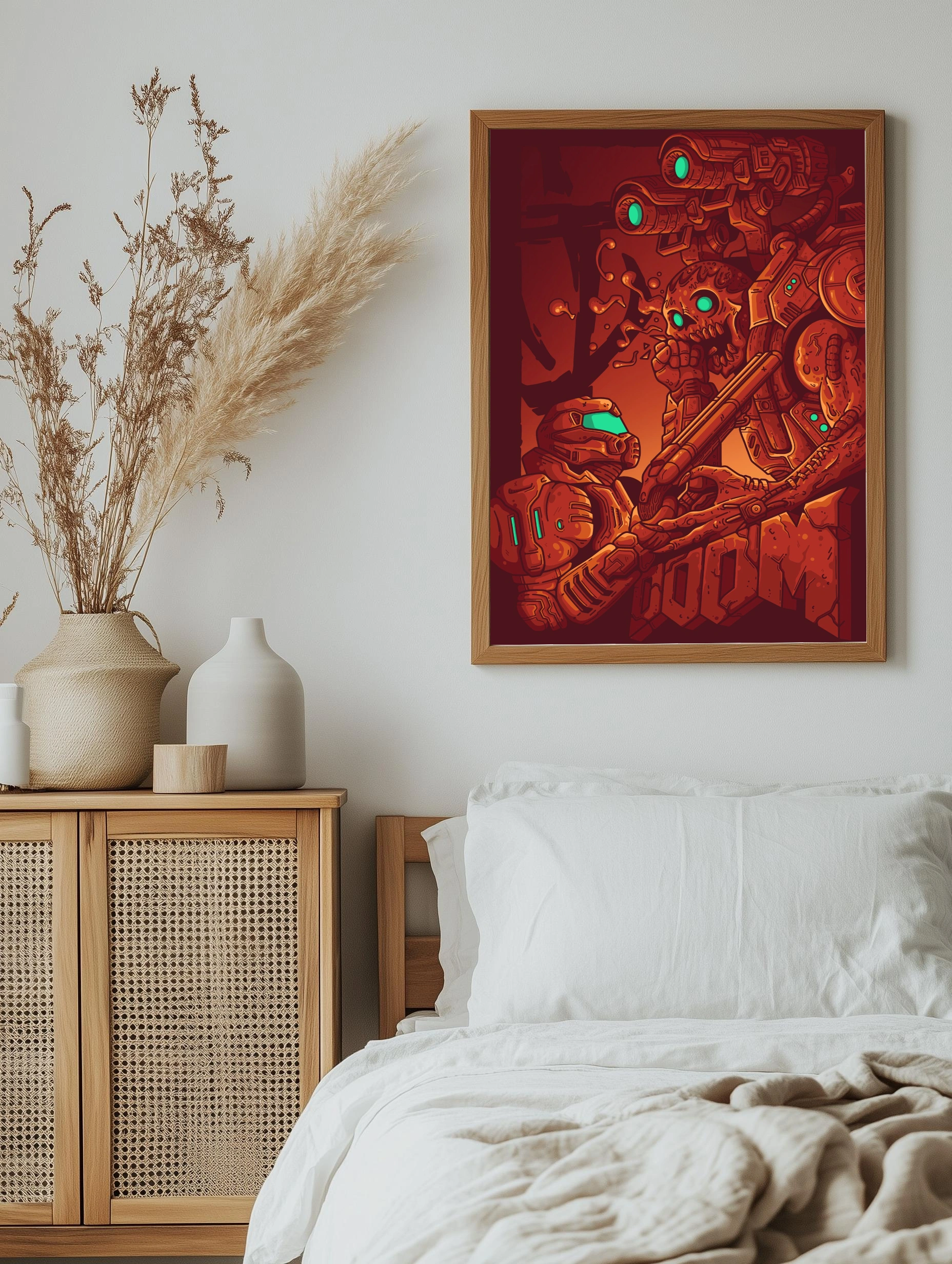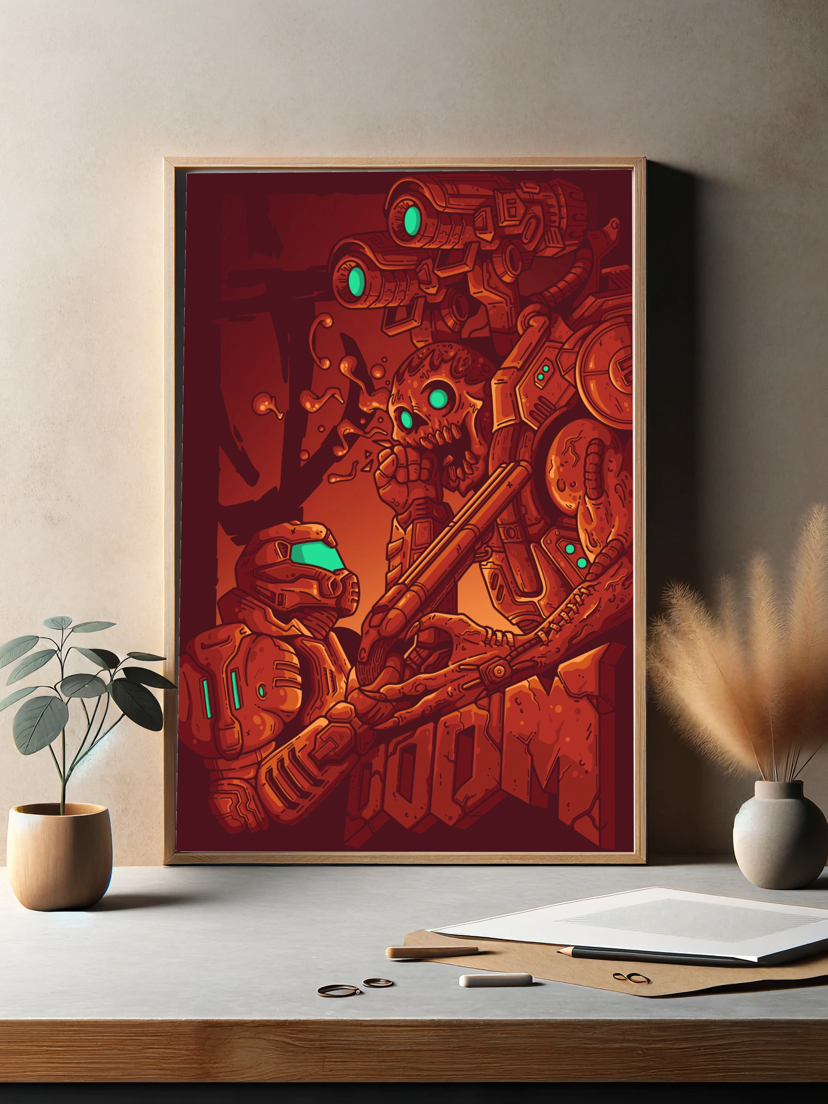 Этот интерьерный художественный плакат выполнен в стиле футуристического киберпанка с элементами хоррора. На изображении — напряжённая сцена вооружённого столкновения между роботом и скелетом с механическими деталями. Основные цвета — тёмно-красный, терракотовый и ярко-голубой. Декоративная картина для гостиной или офиса создаст атмосферу технологического напряжения и современных фантазий.