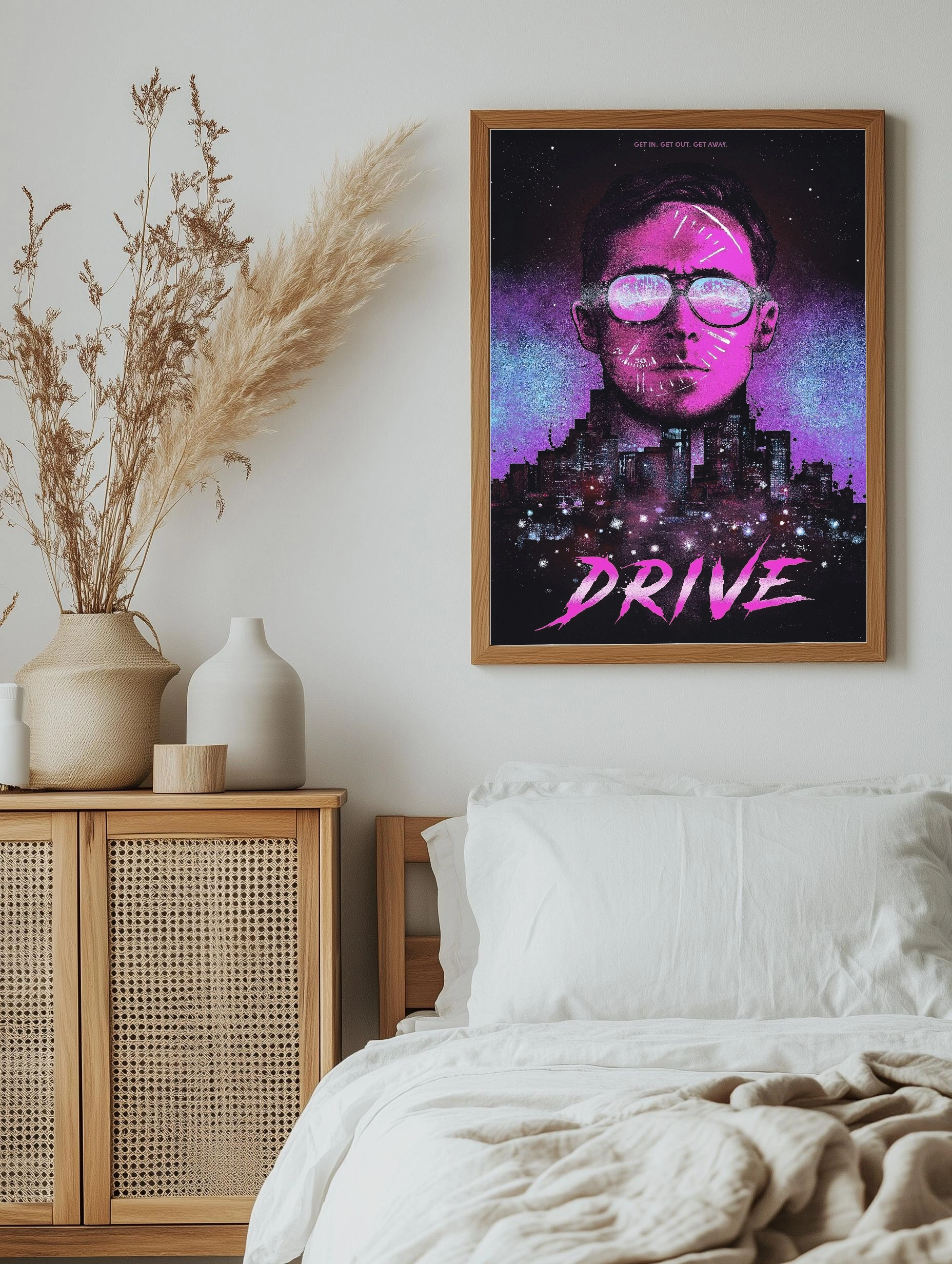 Уникальная картина для гостиной с изображением лица главного героя фильма «Drive» на фоне ночного города в неоновом розовом и синем освещении. Стильный декоративный плакат с ярким контрастом и урбанистическим настроением, идеально подходит как настенный декор для интерьера и создания атмосферы современного искусства.