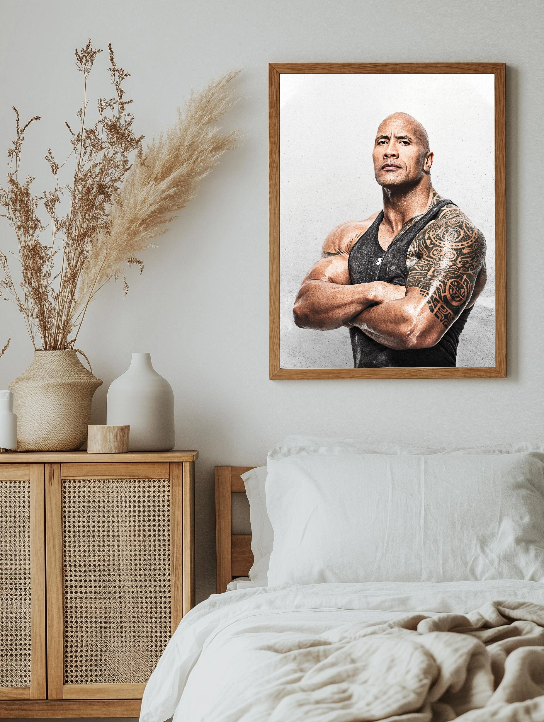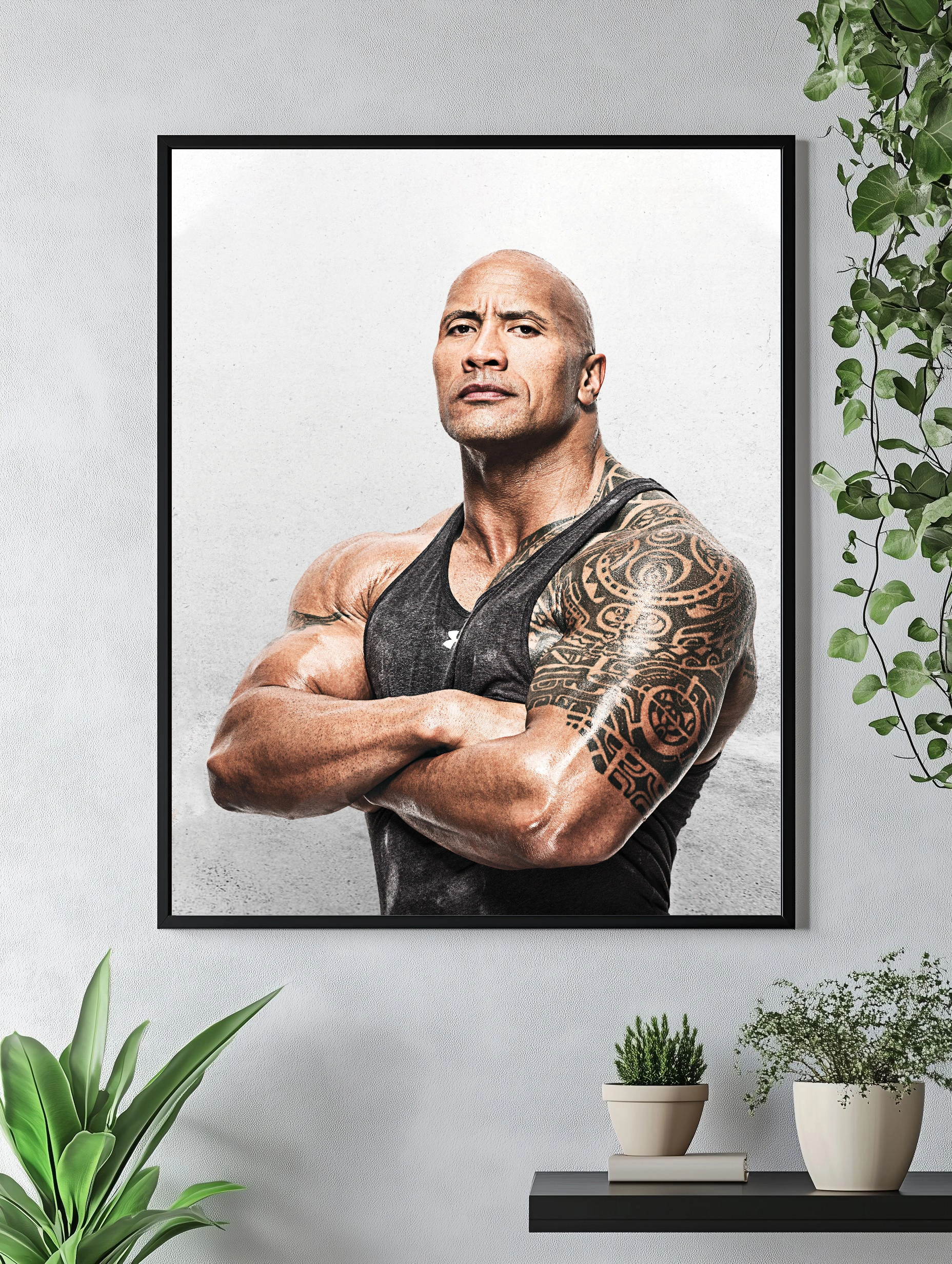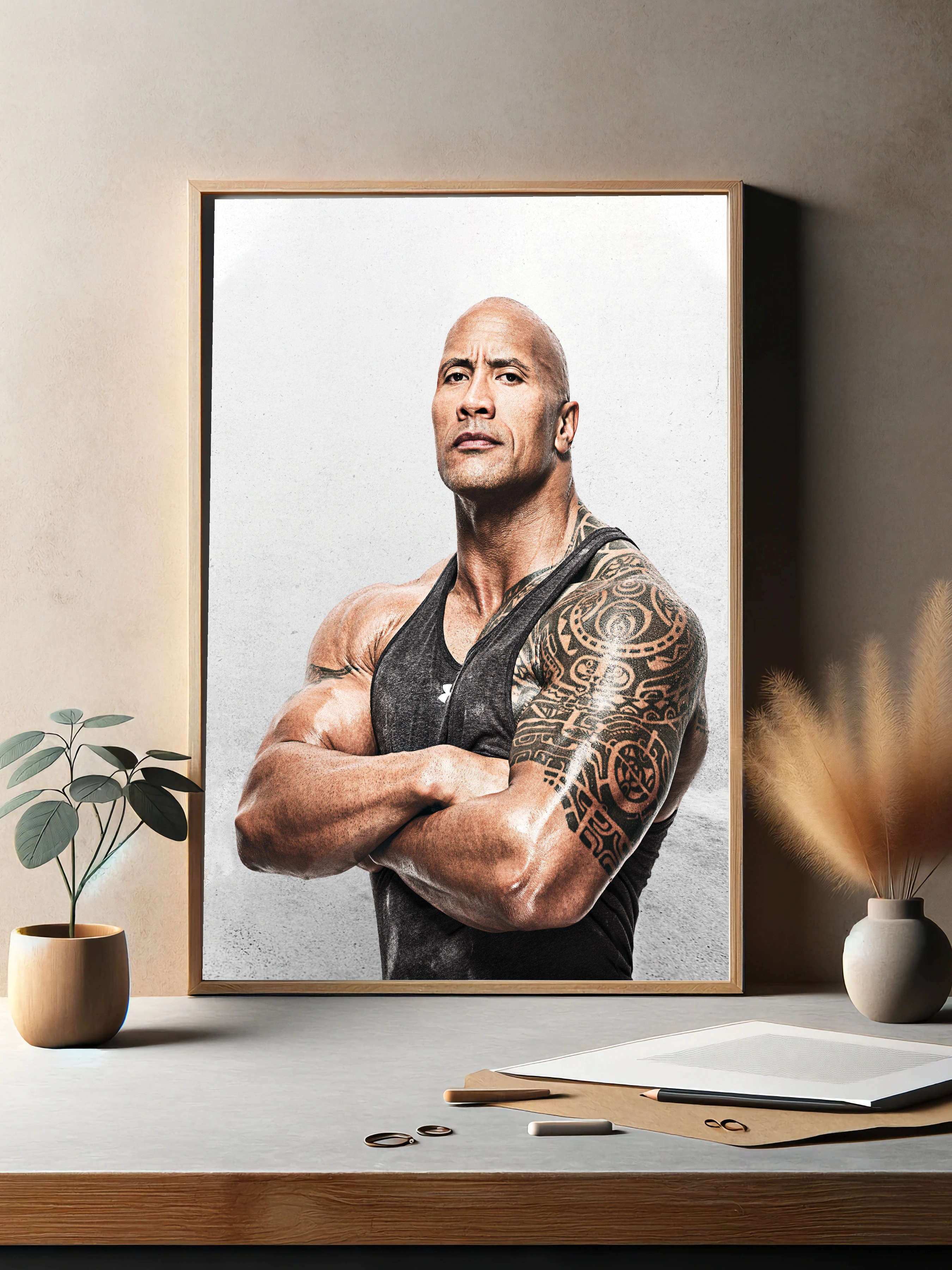 Картина для гостиной с изображением Дуэйна Джонсона, известного как Скала, в спортивной майке. На постере акцент на его мускулистом теле и сложной татуировке на плече. Стиль современного искусства с ярким контрастом и реалистичной детализацией. Идеально подходит как интерьерный постер и декоративный плакат для офиса и дома.
