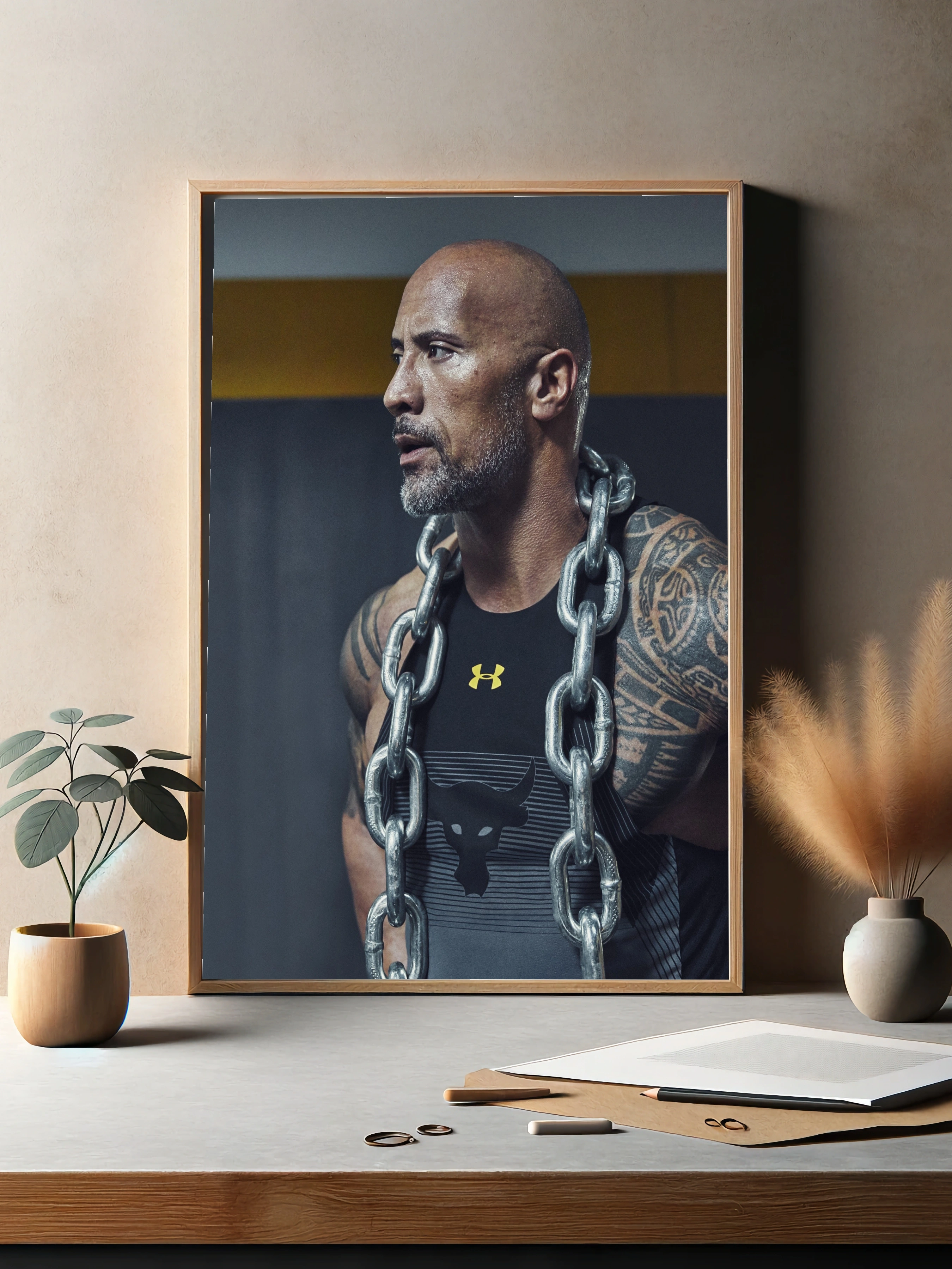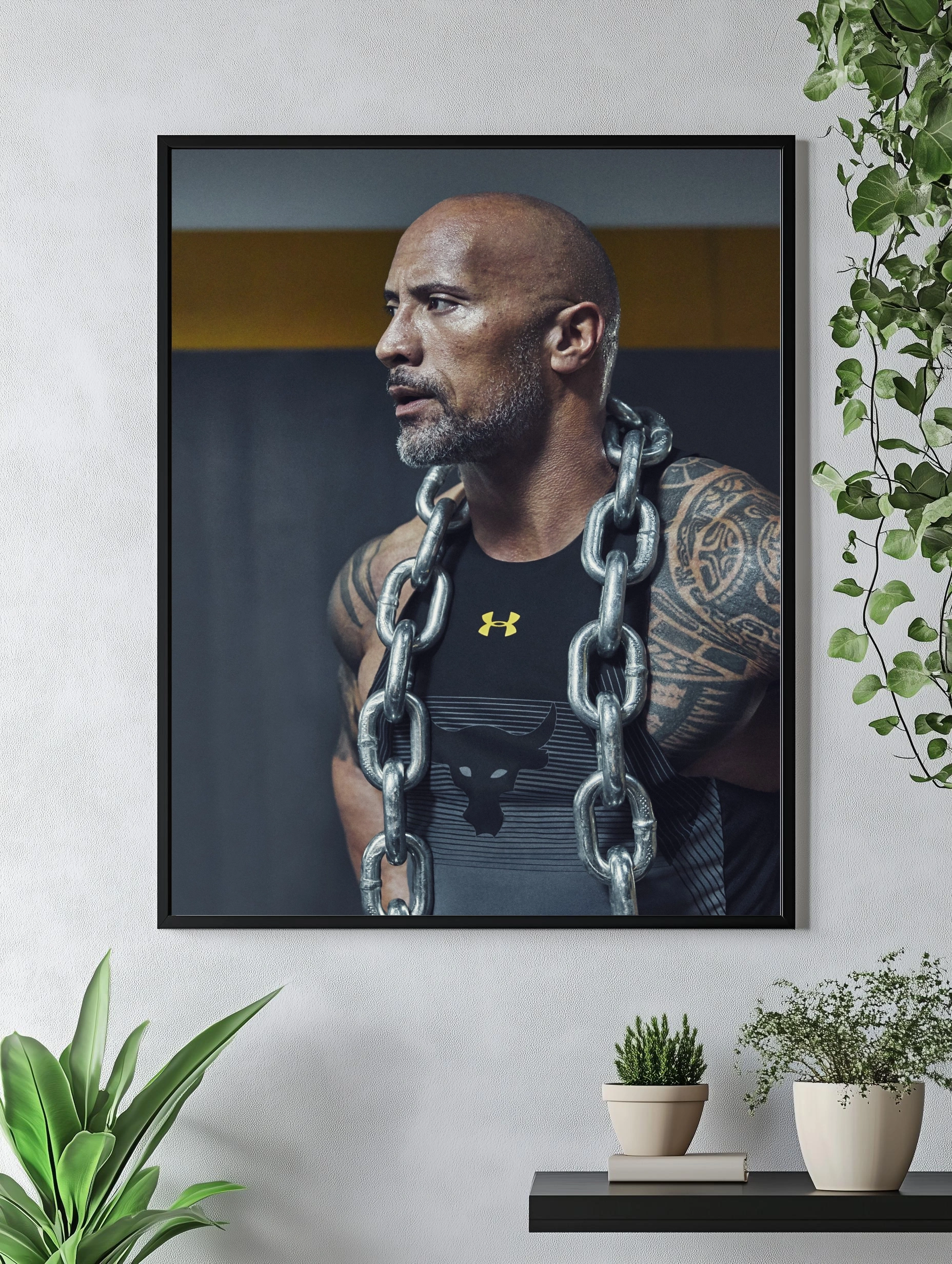 На изображении изображён известный актёр и спортсмен Двейн Джонсон (The Rock), который держит крупную металлическую цепь на плечах. Стиль фотографии напоминает фитнес-съёмку с акцентом на физическую мощь и мужественность. Основные цвета — тёмный фон с оттенками серого и жёлтого логотипа. Это декоративный плакат и картина для гостиной или спортивного зала, отлично подойдет как стильный интерьерный декор с энергией и вдохновением.