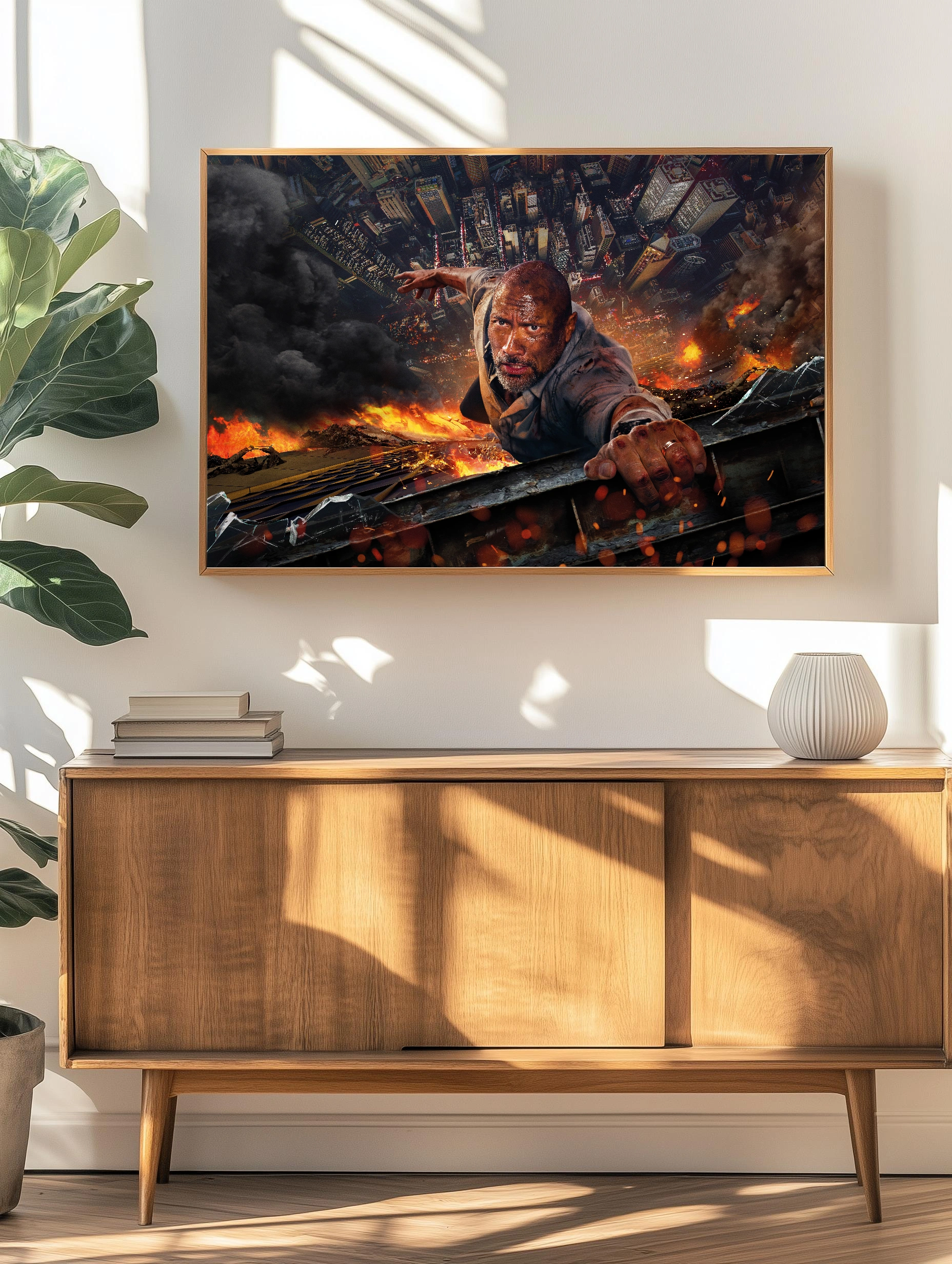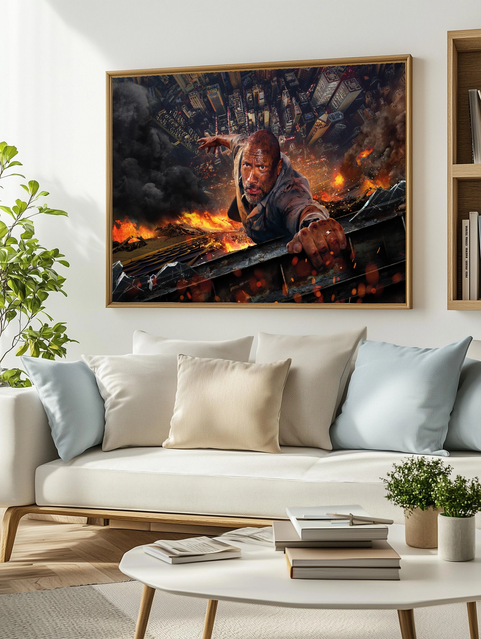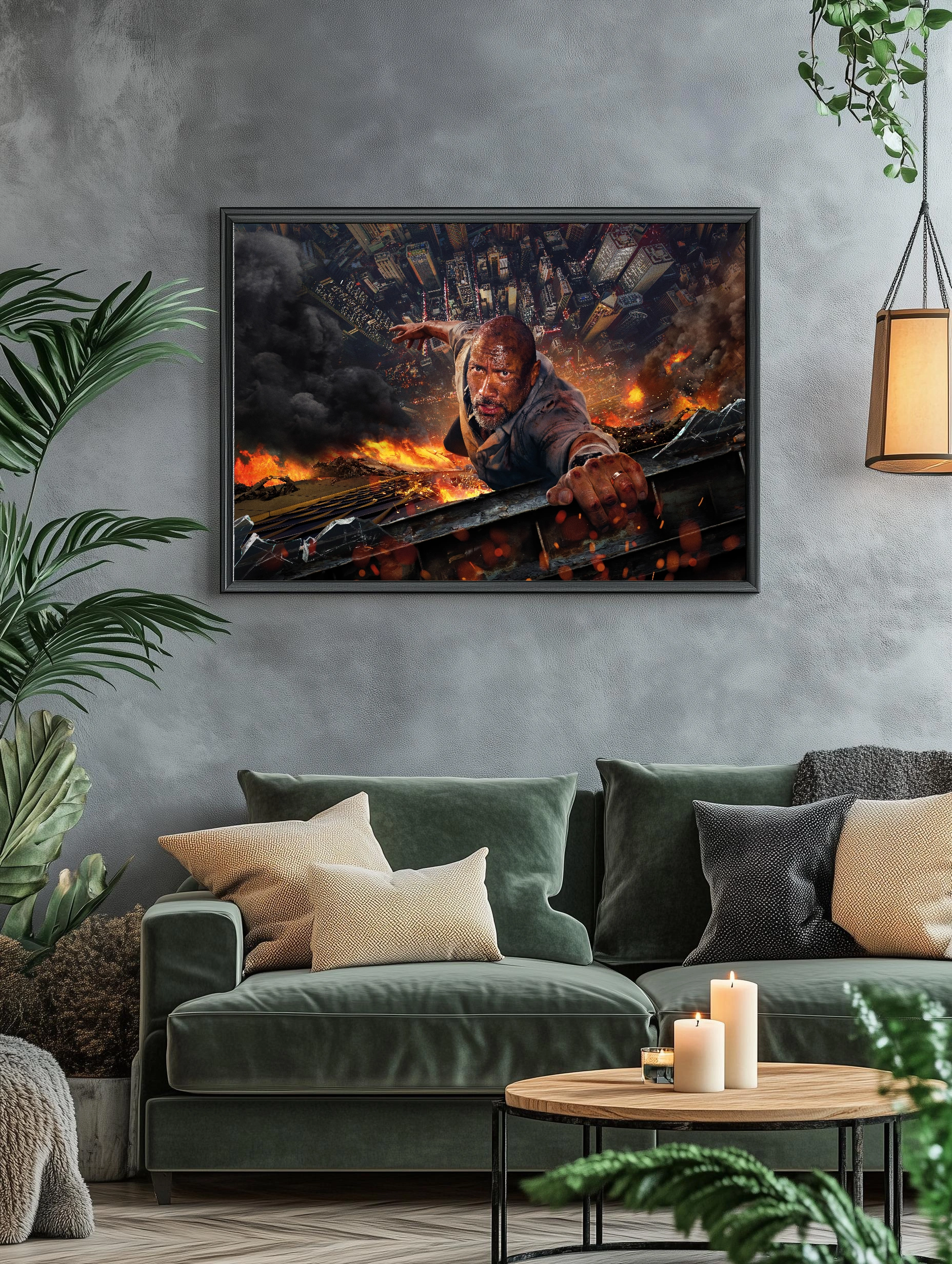 Динамичная картина с изображением Дуэйна Джонсона, цепляющегося за край разрушенного здания на фоне ночного мегаполиса, погружённого в пламя и дым. Этот интерьерный постер передаёт напряжённую атмосферу экшена и борьбы за выживание, идеально подходящий для декоративного оформления стен и создания стильного декора.