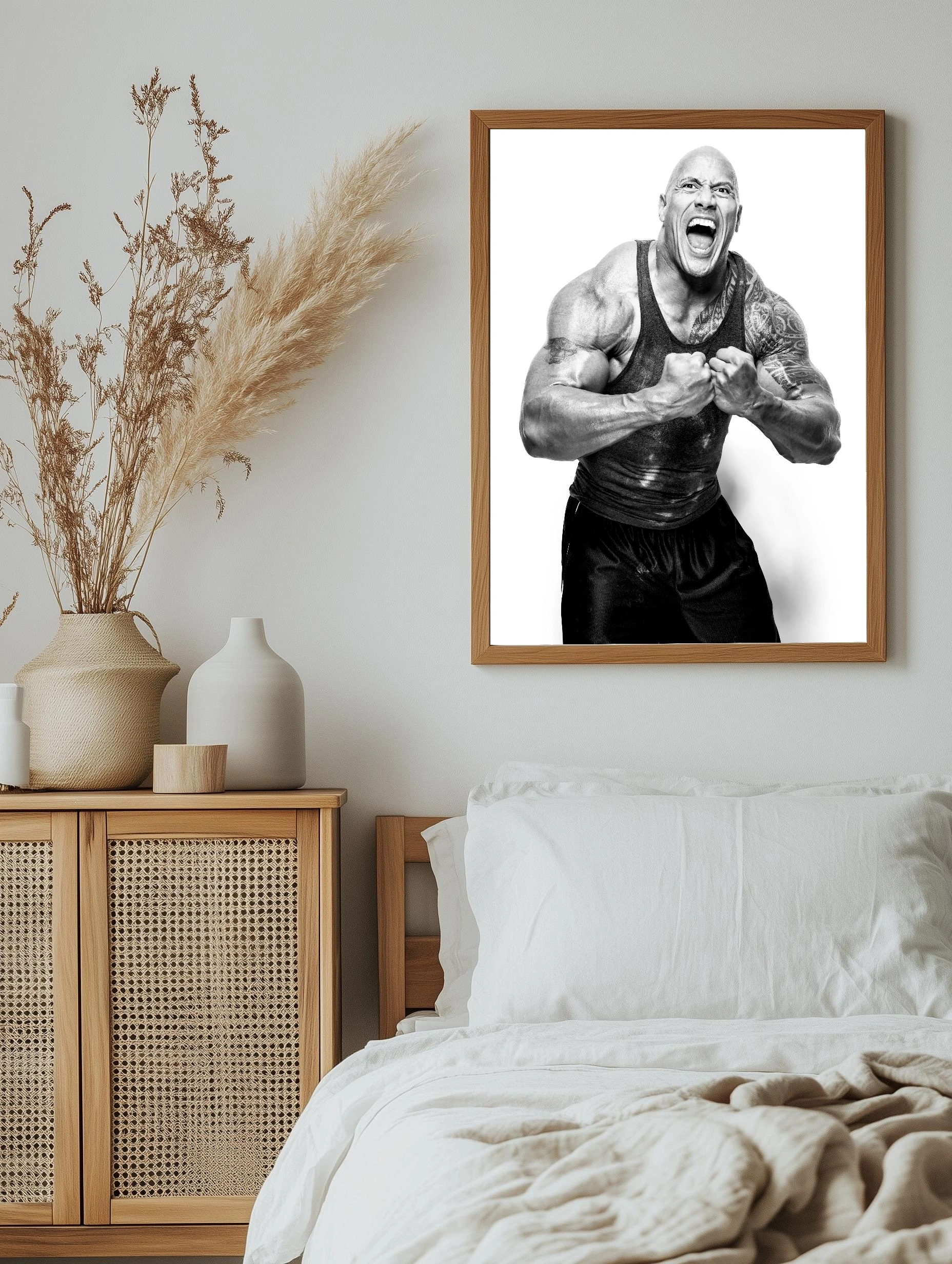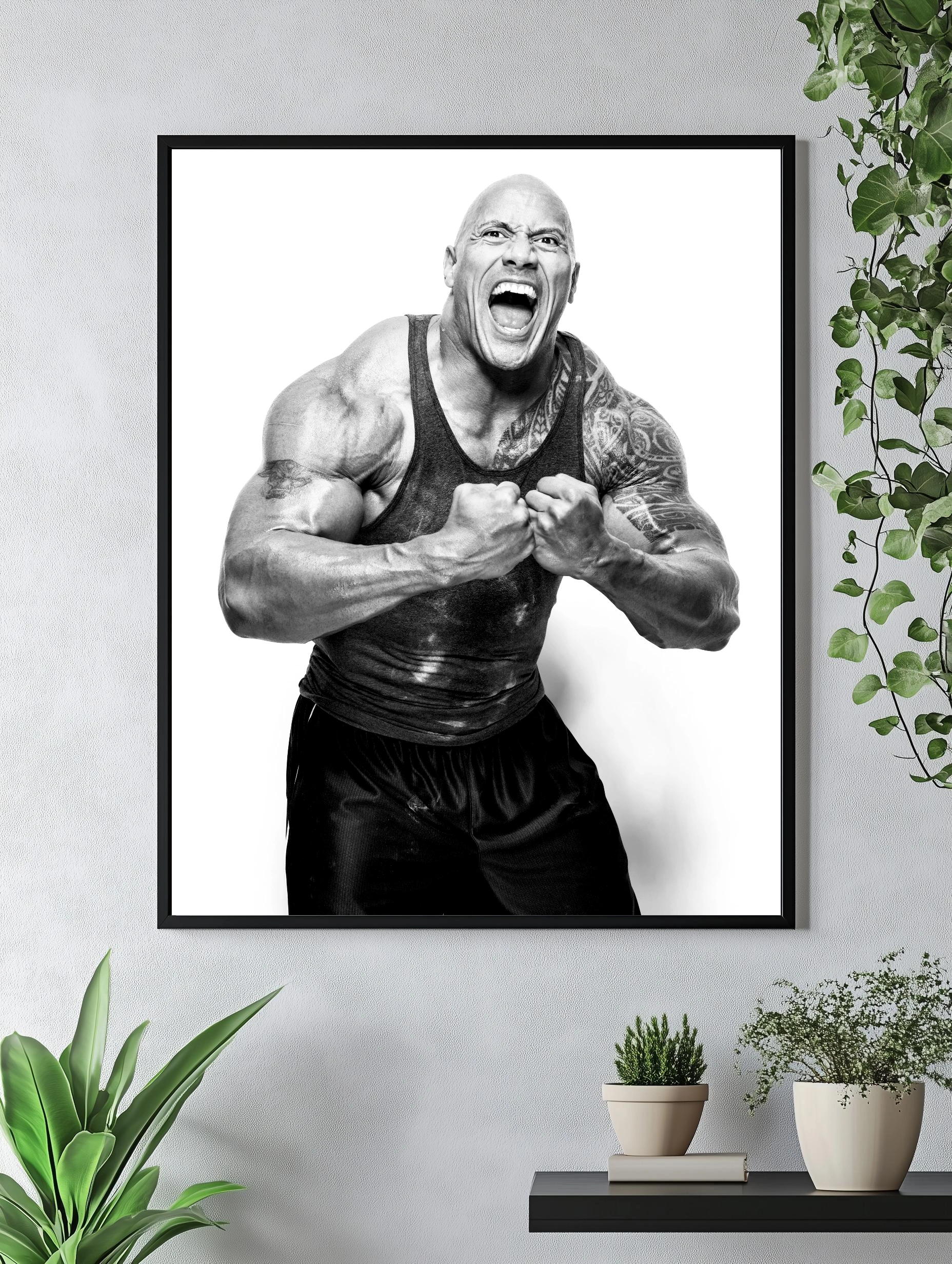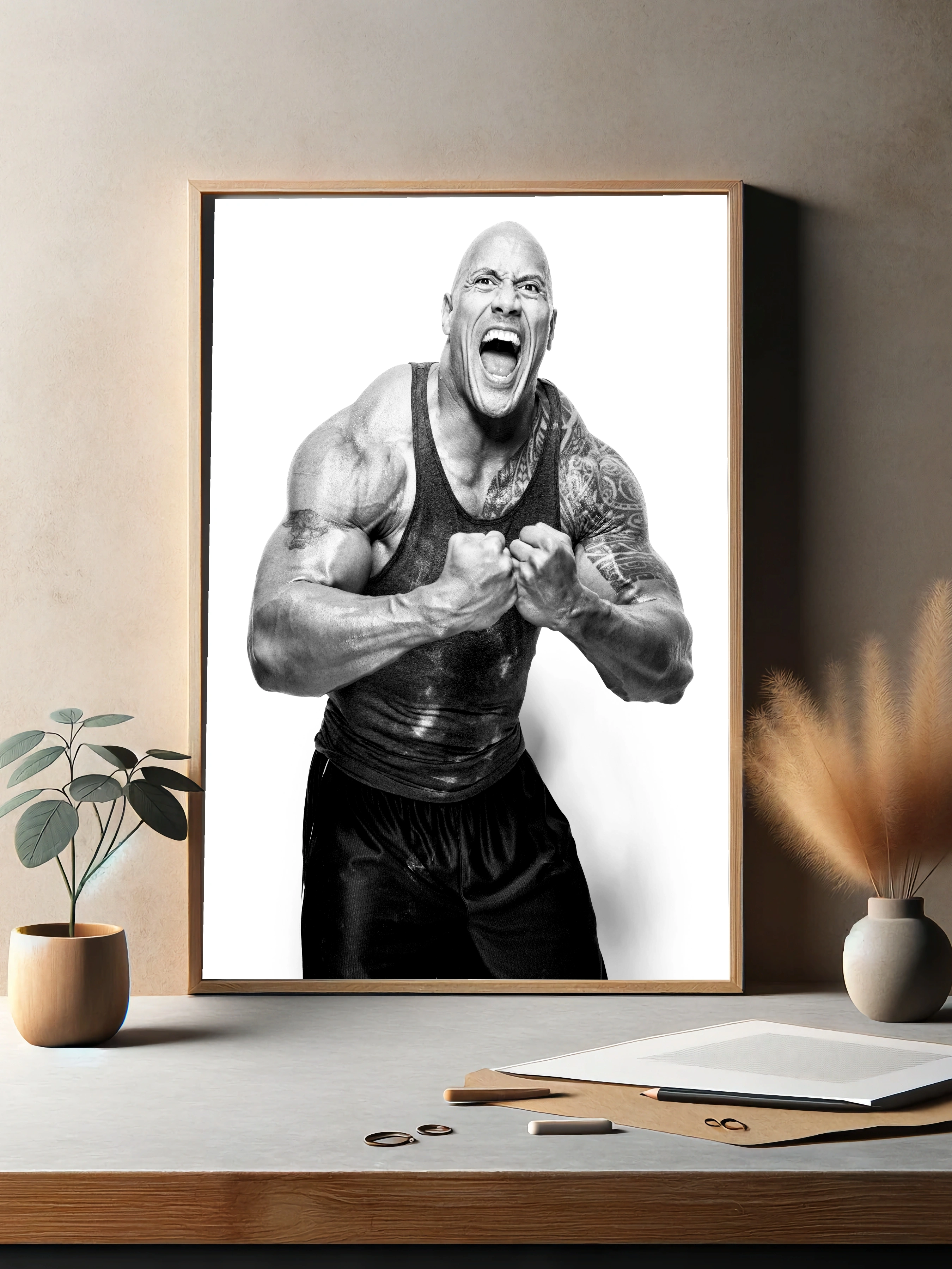 Чёрно-белое изображение мускулистого мужчины в майке, демонстрирующего силу и решимость в эмоциях. Стиль фотографии подчёркивает мощную мускулатуру и татуировки на руке, создавая эффект современного искусства для стен. Такой интерьерный постер идеально подойдёт для гостиной или спортзала, отражая динамику и энергию.