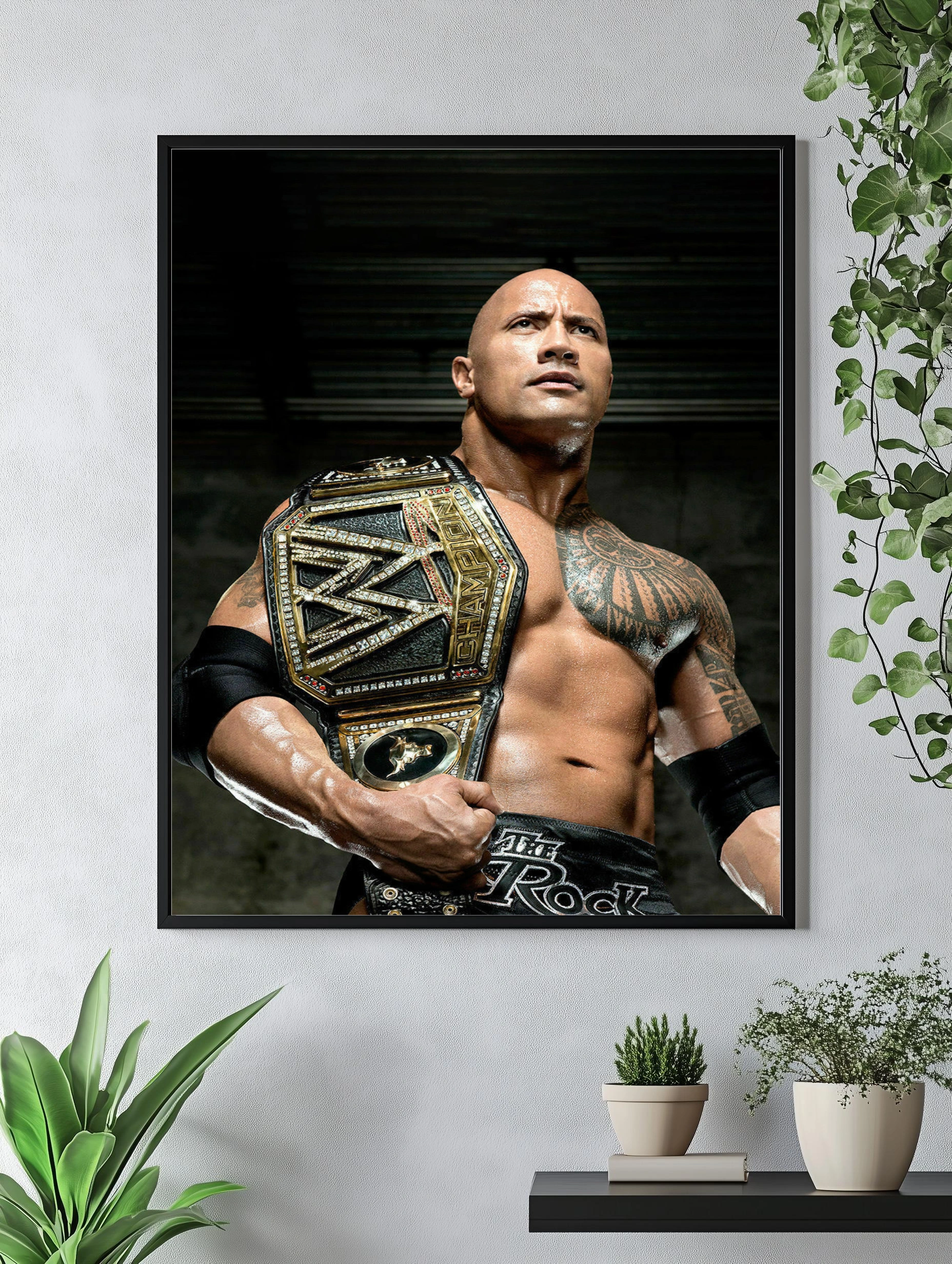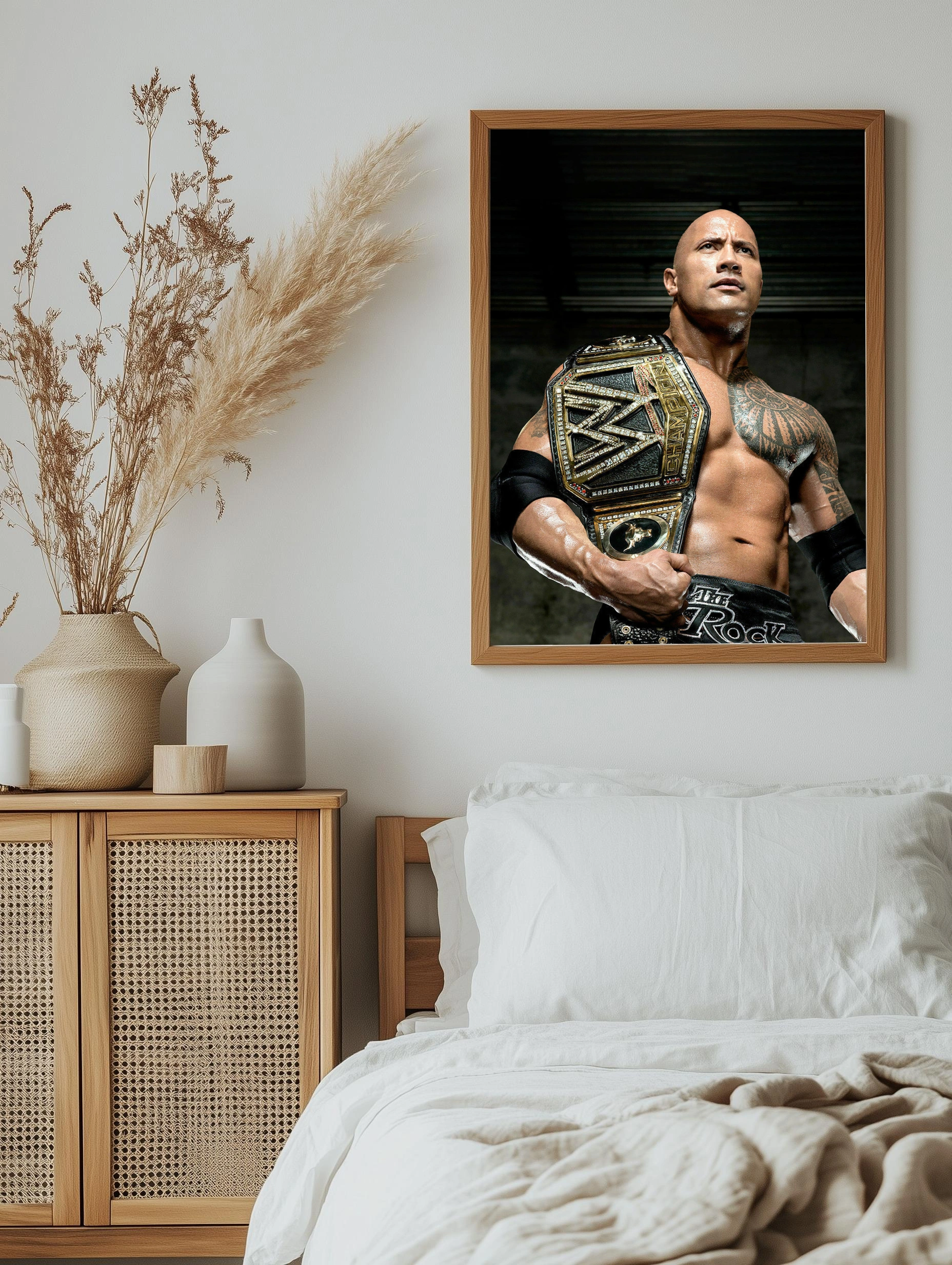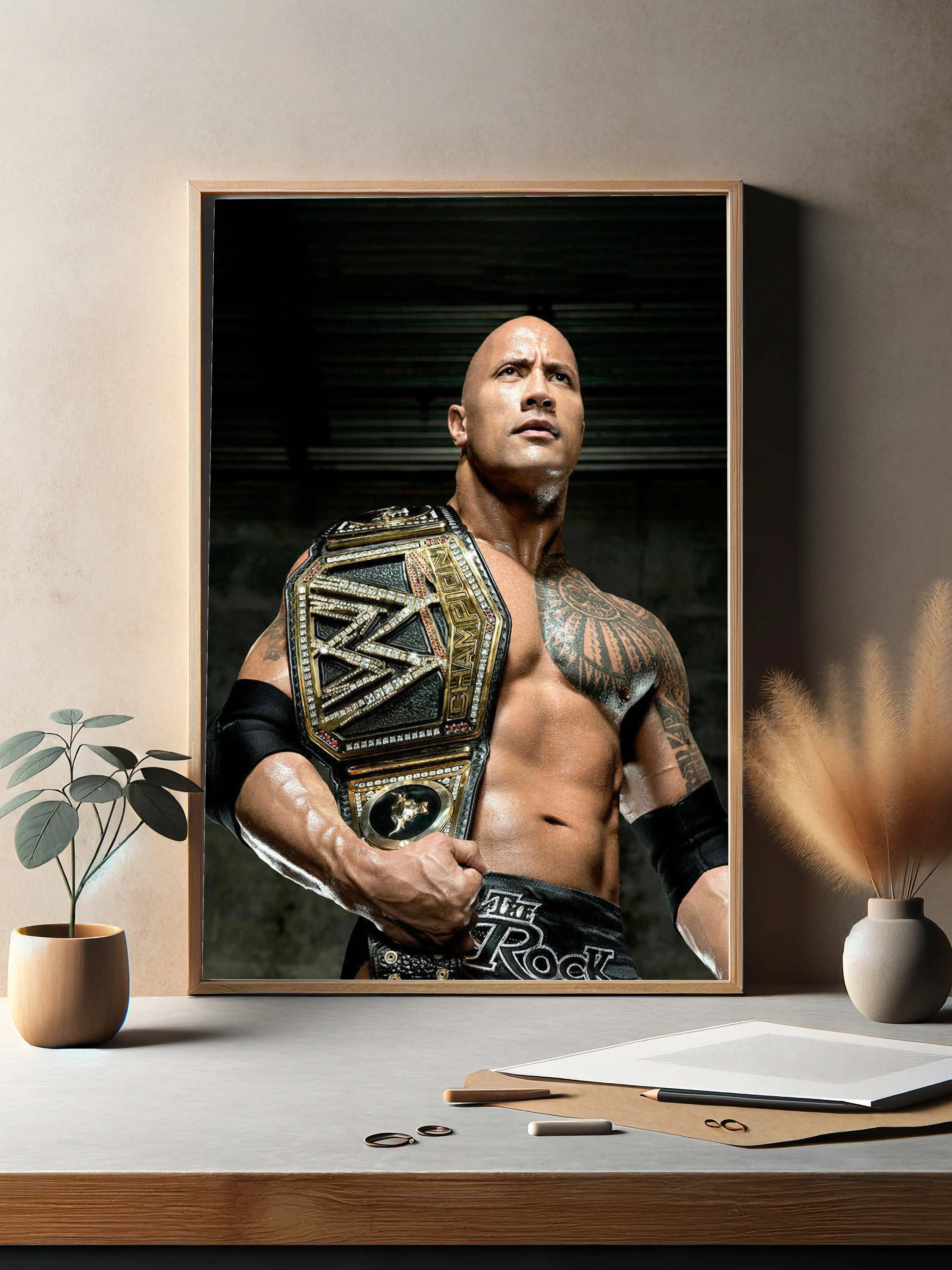 Изображение знаменитого актёра и рестлера Дуэйна Джонсона (The Rock), держащего чемпионский пояс WWE. Картина наполнена энергией силы и уверенности, выполнена в фотостиле с акцентом на мускулатуру и узнаваемые татуировки. Идеально подходит для интерьера спортзала или мужской комнаты, современное искусство для стен с мотивом победы и борьбы.