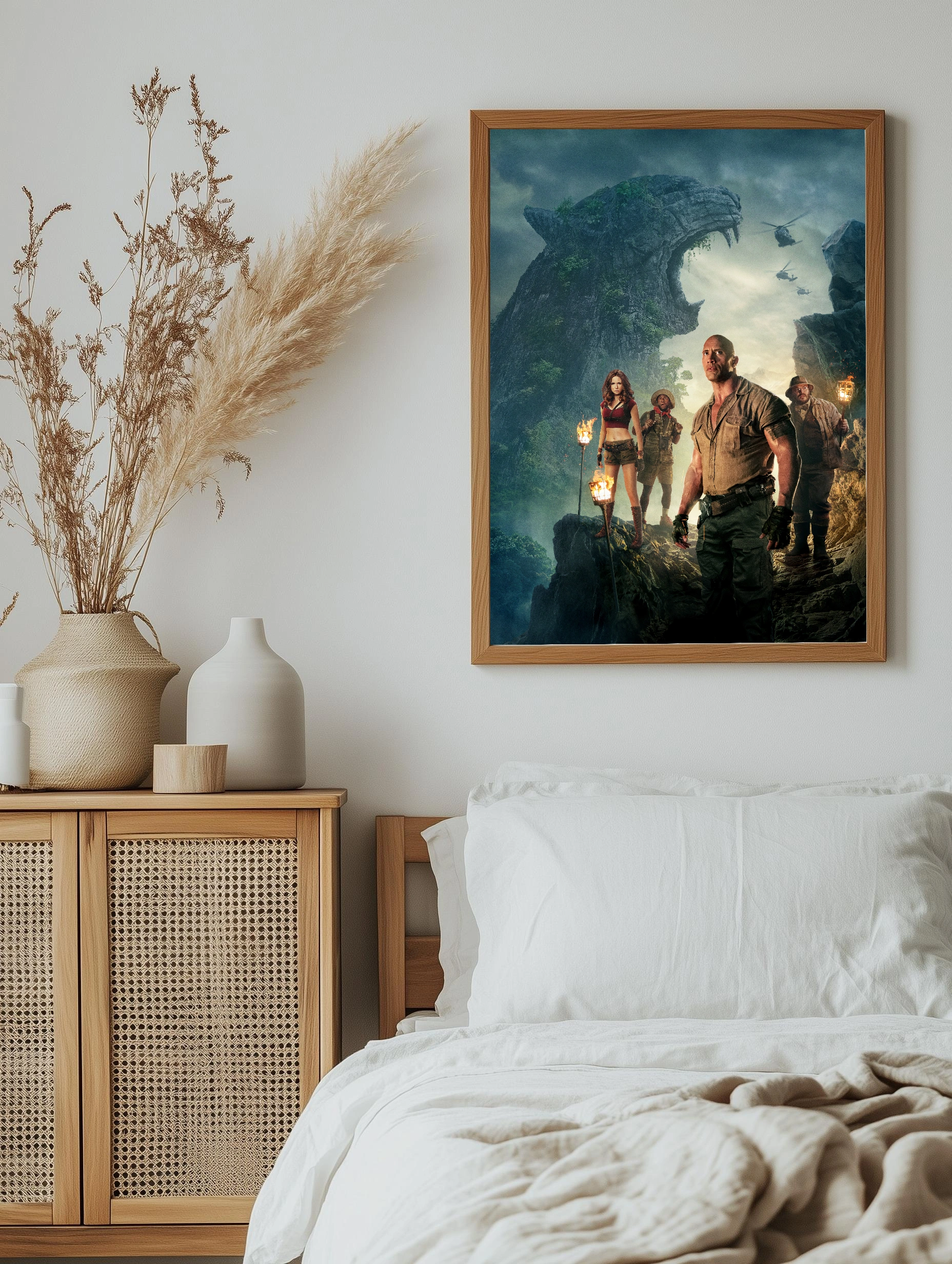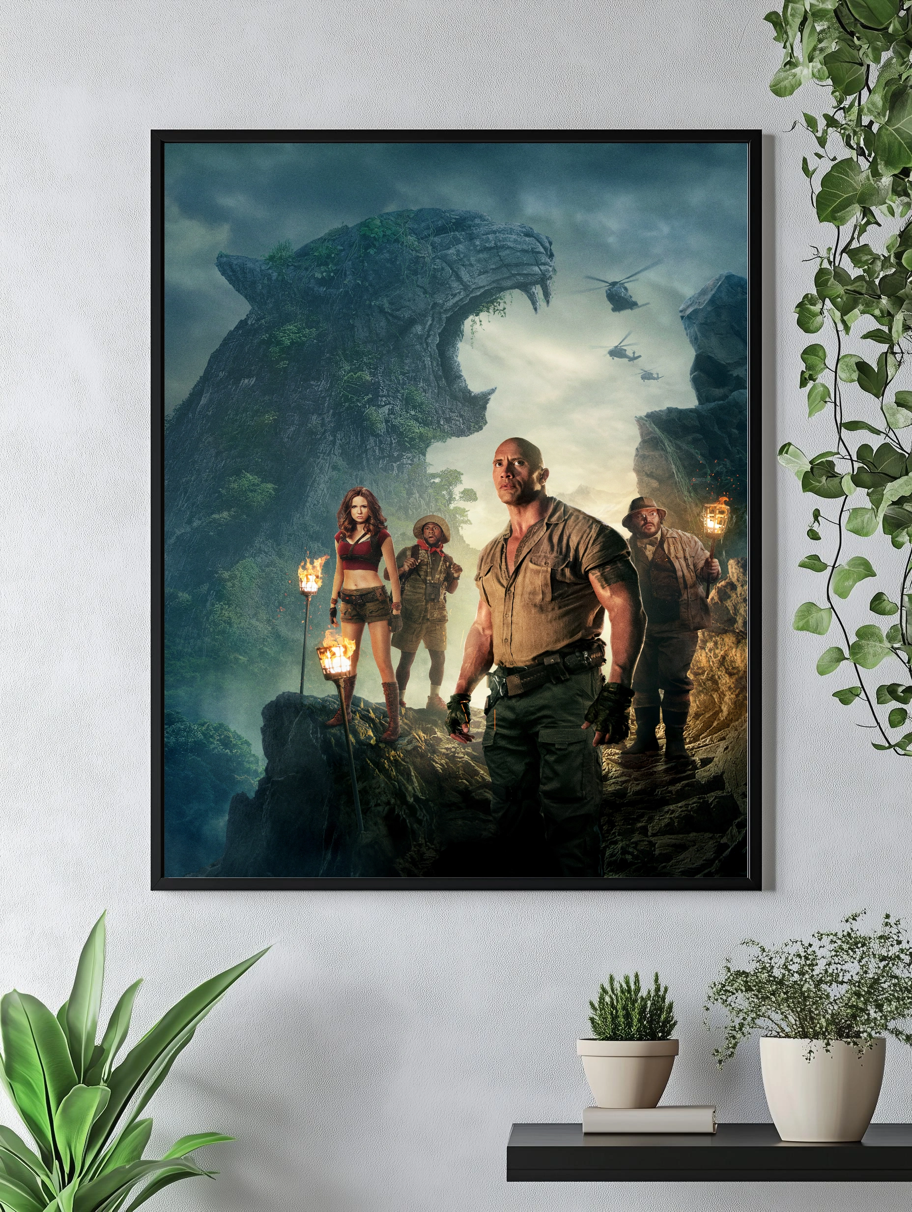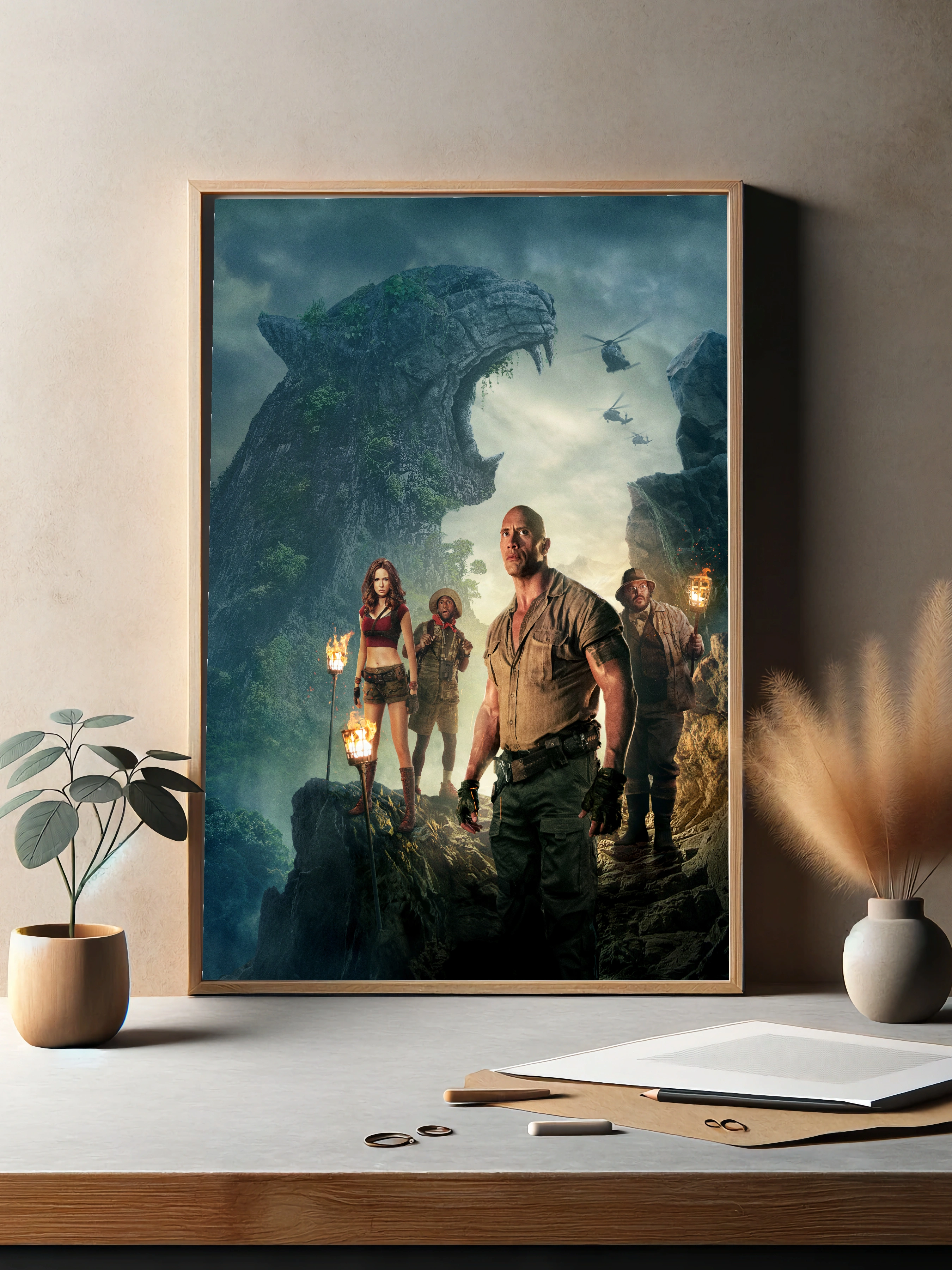 Картина для гостиной с героями фильма «Джуманджи»: Дуэйн Джонсон, Джек Блэк, Карен Гиллан и Кевин Харт. На фоне — гигантская каменная голова животного, джунгли и приближающиеся вертолеты. Тематика приключений и экшена, насыщенный интерьерный арт для стен с атмосферой приключений и драматизма.