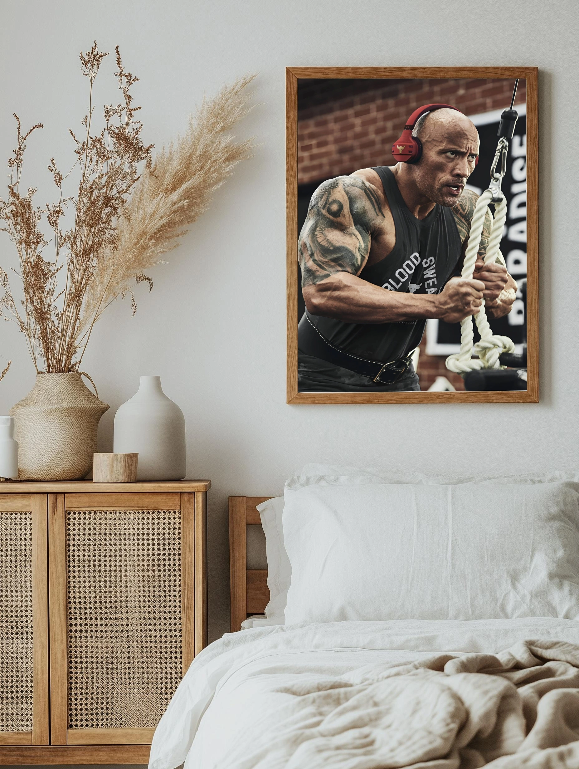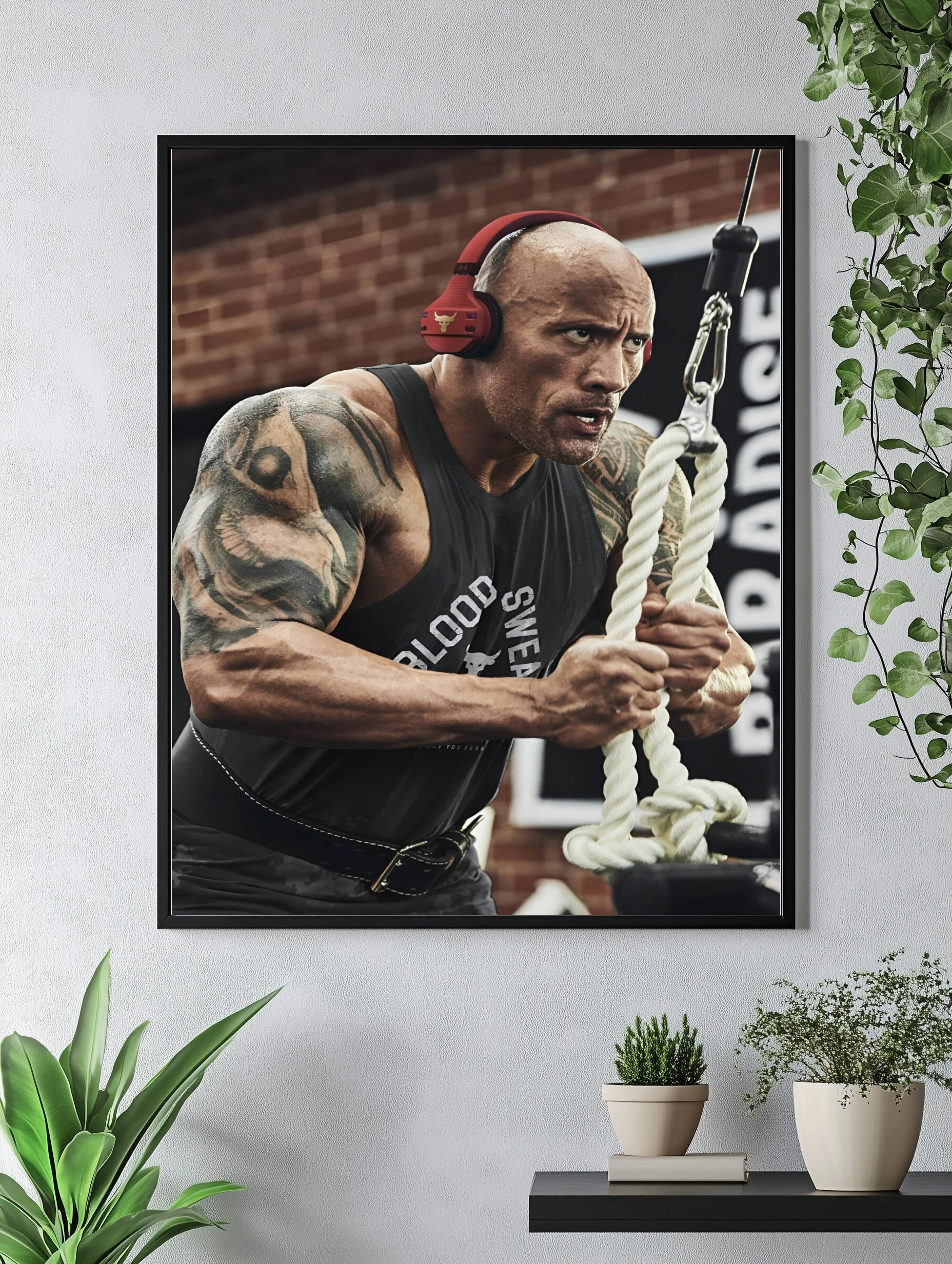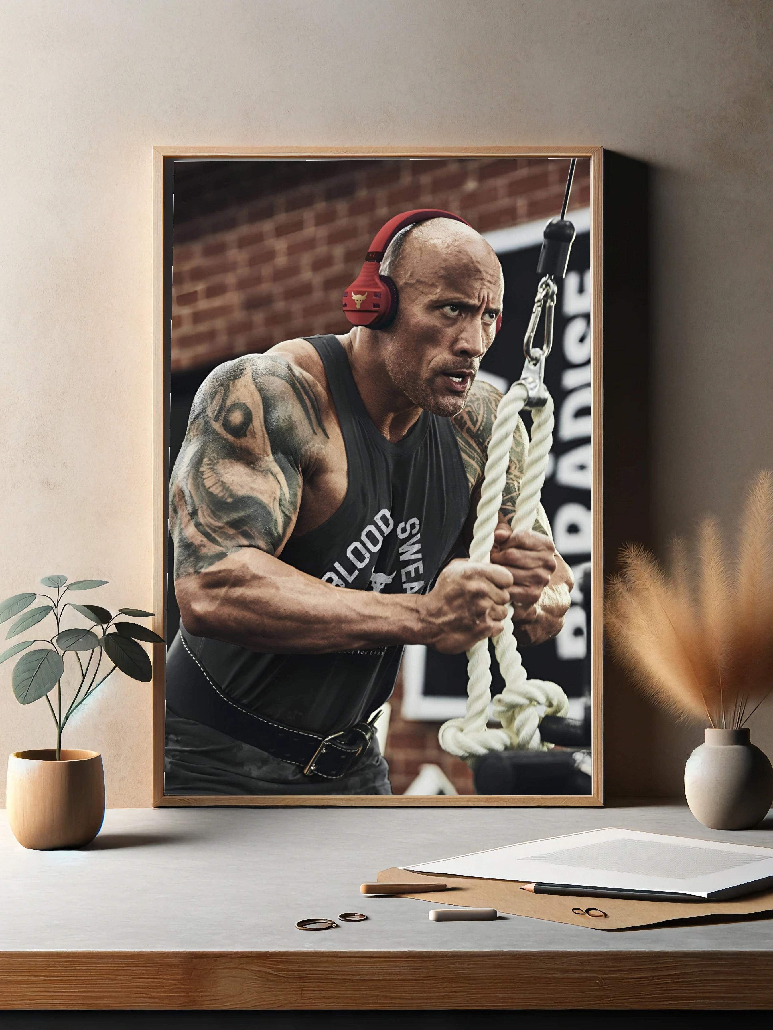 На изображении показан Дуэйн «Скала» Джонсон с характерными татуировками, одетый в черную спортивную майку и красные наушники с логотипом с быком. Он занимается тренажерным залом, сосредоточенно выполняя упражнение с канатом. Картина идеально подойдет для спортивного интерьера, вдохновляя на достижение целей и мотивацию.