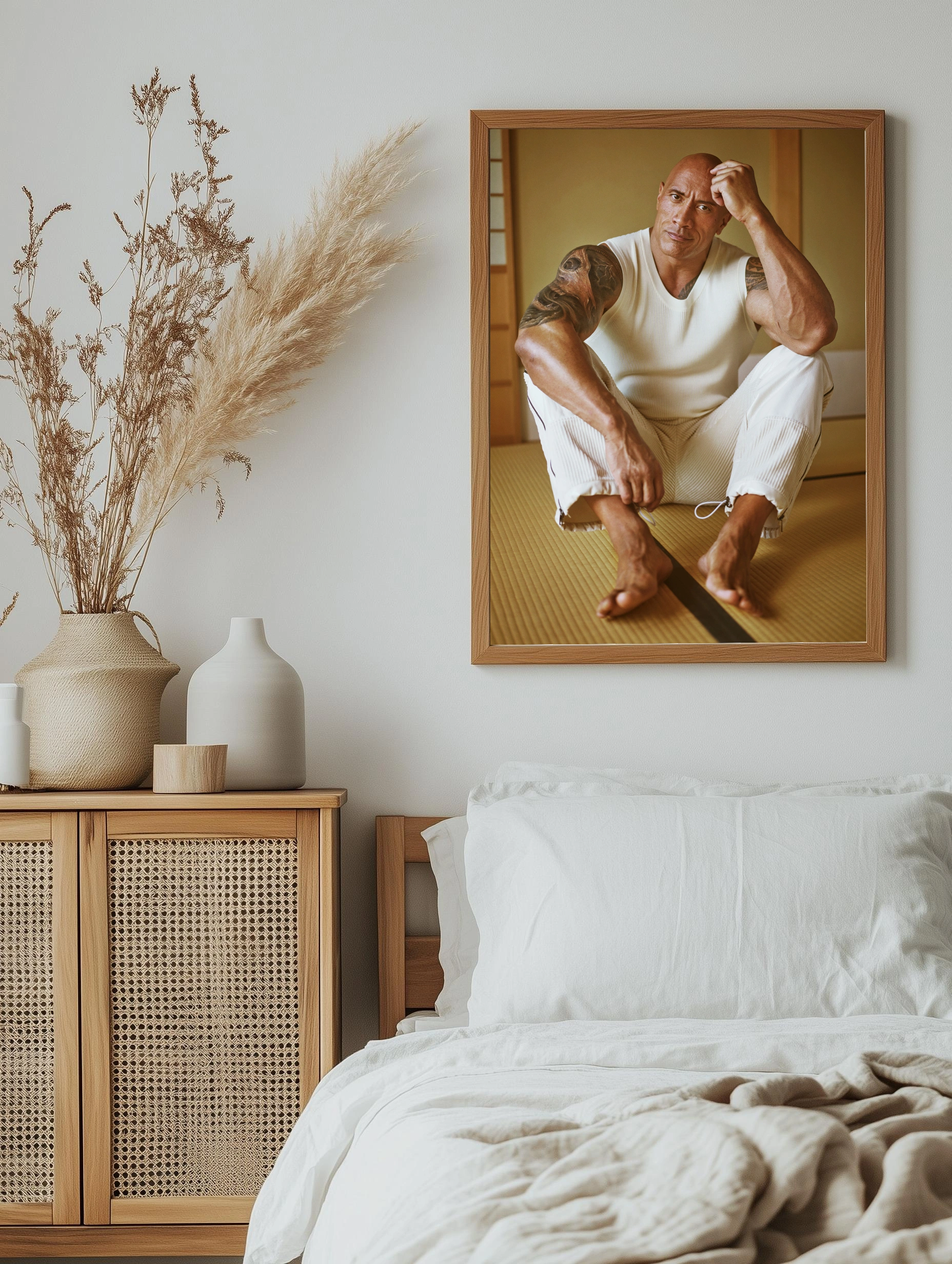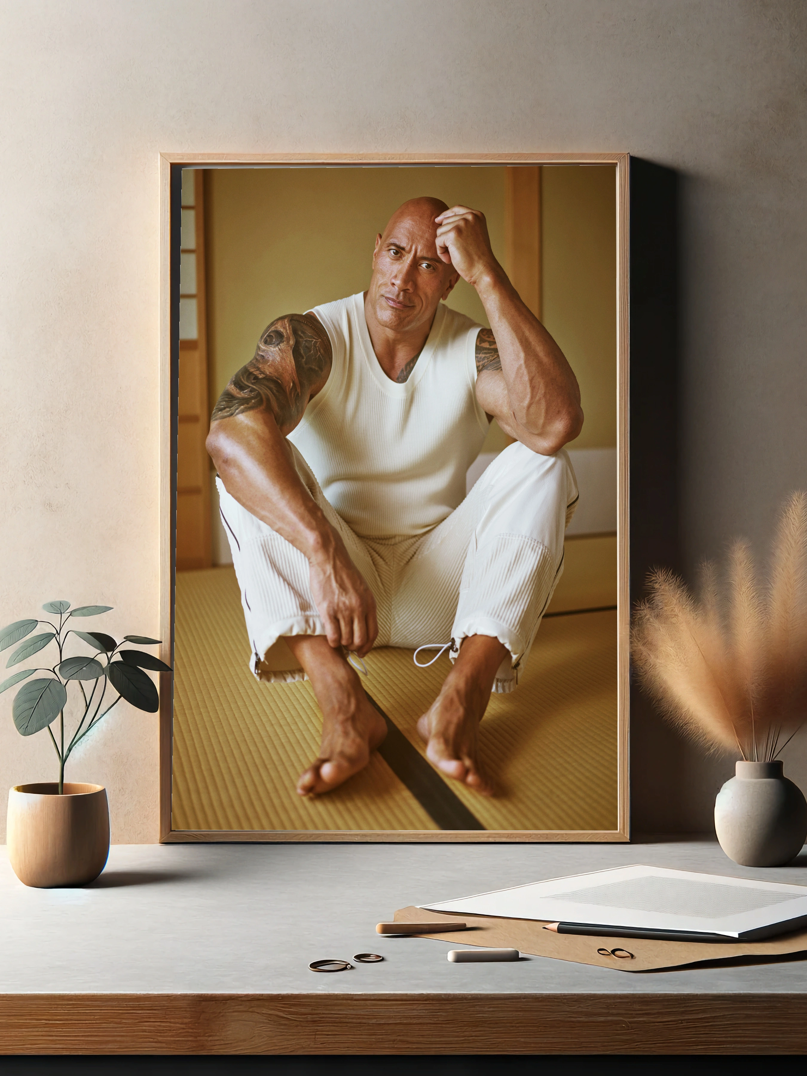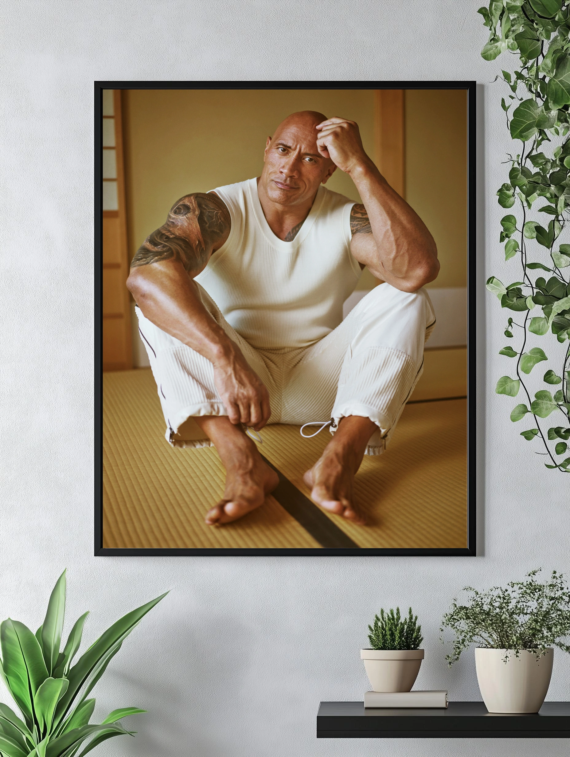 На изображении представлен Дуэйн Джонсон в светлой одежде, сидящий в расслабленной позе на фоне минималистичного интерьера с приглушёнными бежевыми тонами. Атмосфера передаёт уверенность, силу и естественность, что делает эту художественную картину отличным интерьерным искусством для гостиной или офиса. Декоративный плакат подойдет для создания стильного декора стен с уникальным характером и харизмой.