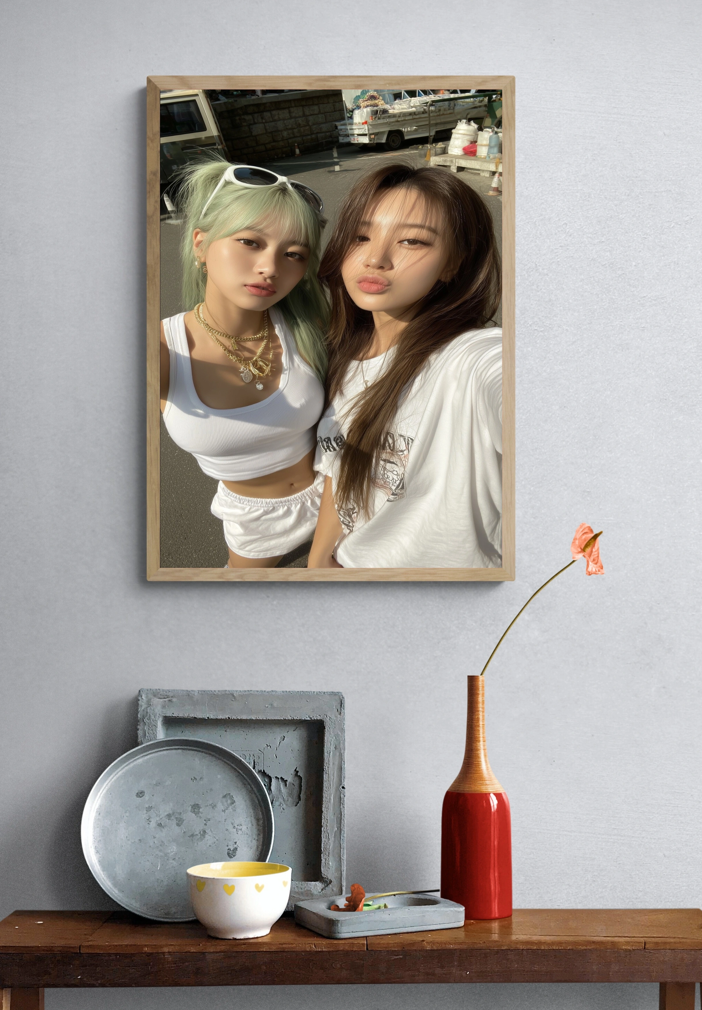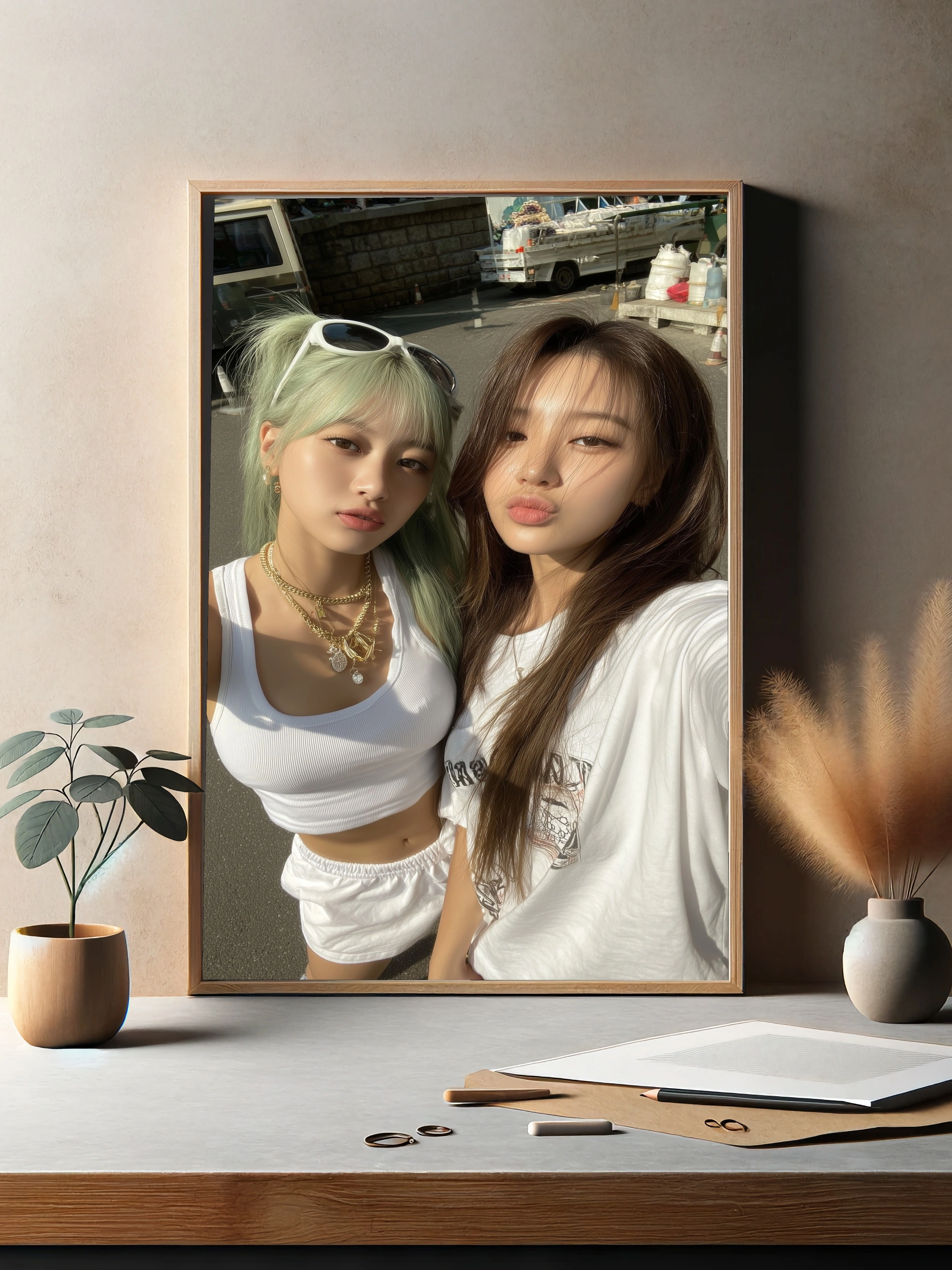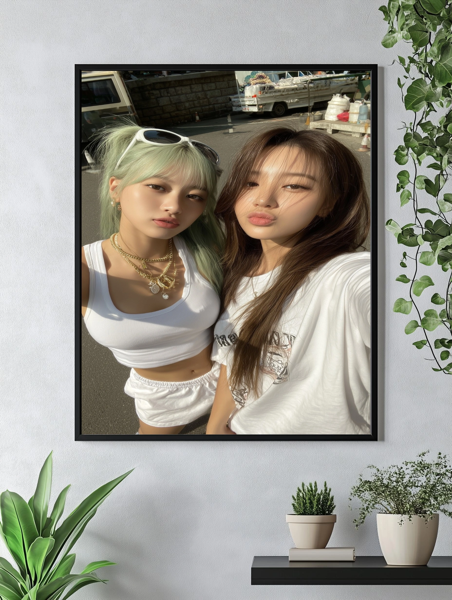 На этом ярком постере изображены две стильные девушки, позирующие на фоне городской улицы. Обе они одеты в белую одежду: одна в облегающем топе и шортах, другая в свободной футболке с графическим принтом. Их образы дополнены эффектными аксессуарами: золотыми цепочками и серьгами, что придаёт им особый шик. Девушка с зелеными волосами выглядит игриво, а её подруга с длинными тёмными локонами излучает уверенность. Солнечные лучи создают мягкое освещение, подчеркивающее их естественную красоту и атмосферу дружбы. Постер выполнен в современном стиле, идеально подходящем для молодежных интерьеров, кафе или креативных пространств. Он привлечет внимание молодежи и креативщиков, стремящихся добавить яркие акценты в своё окружение.