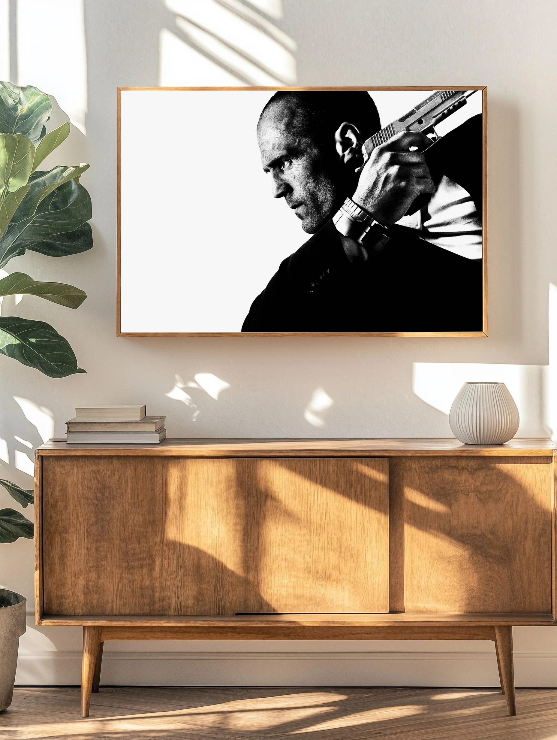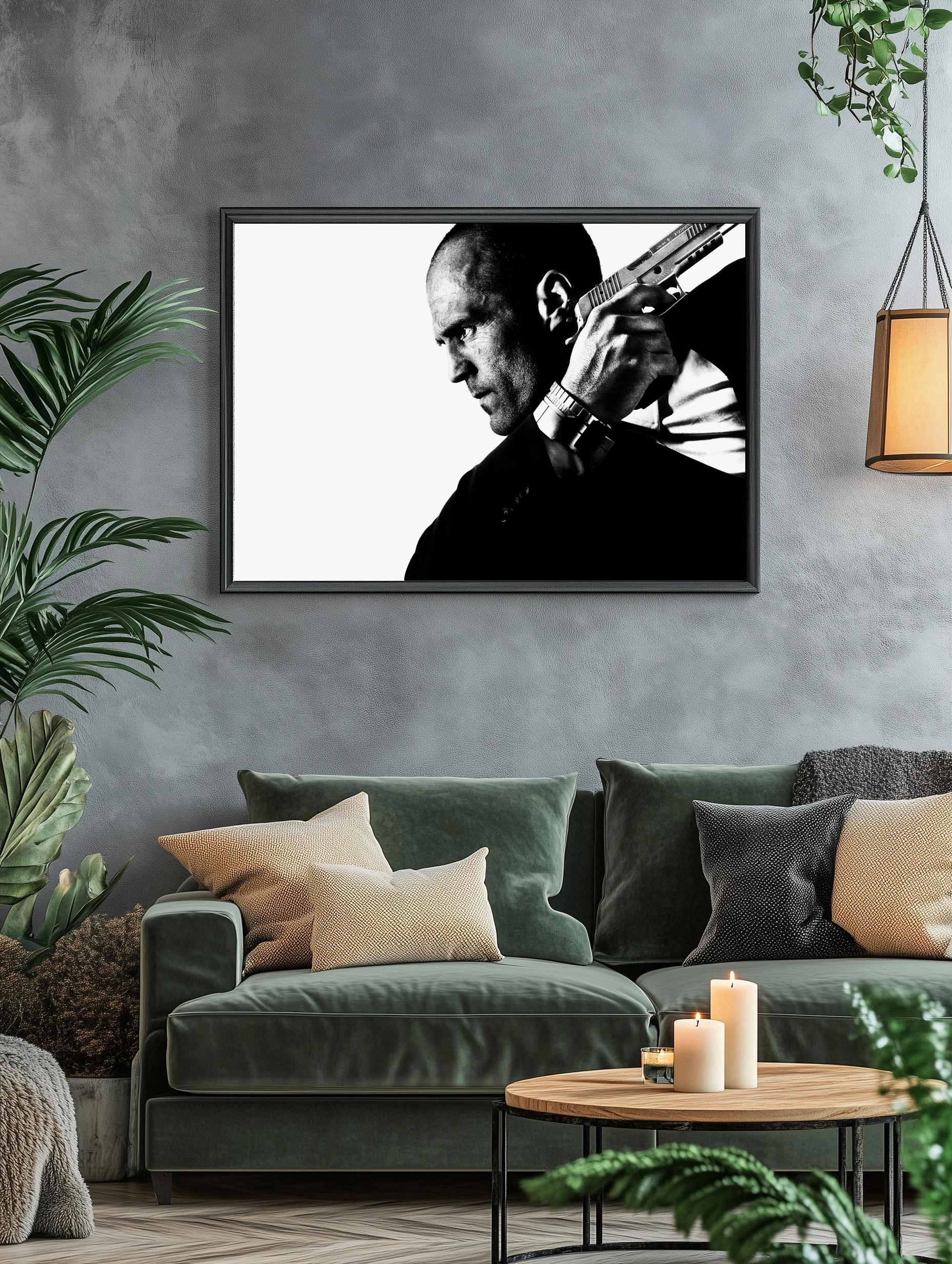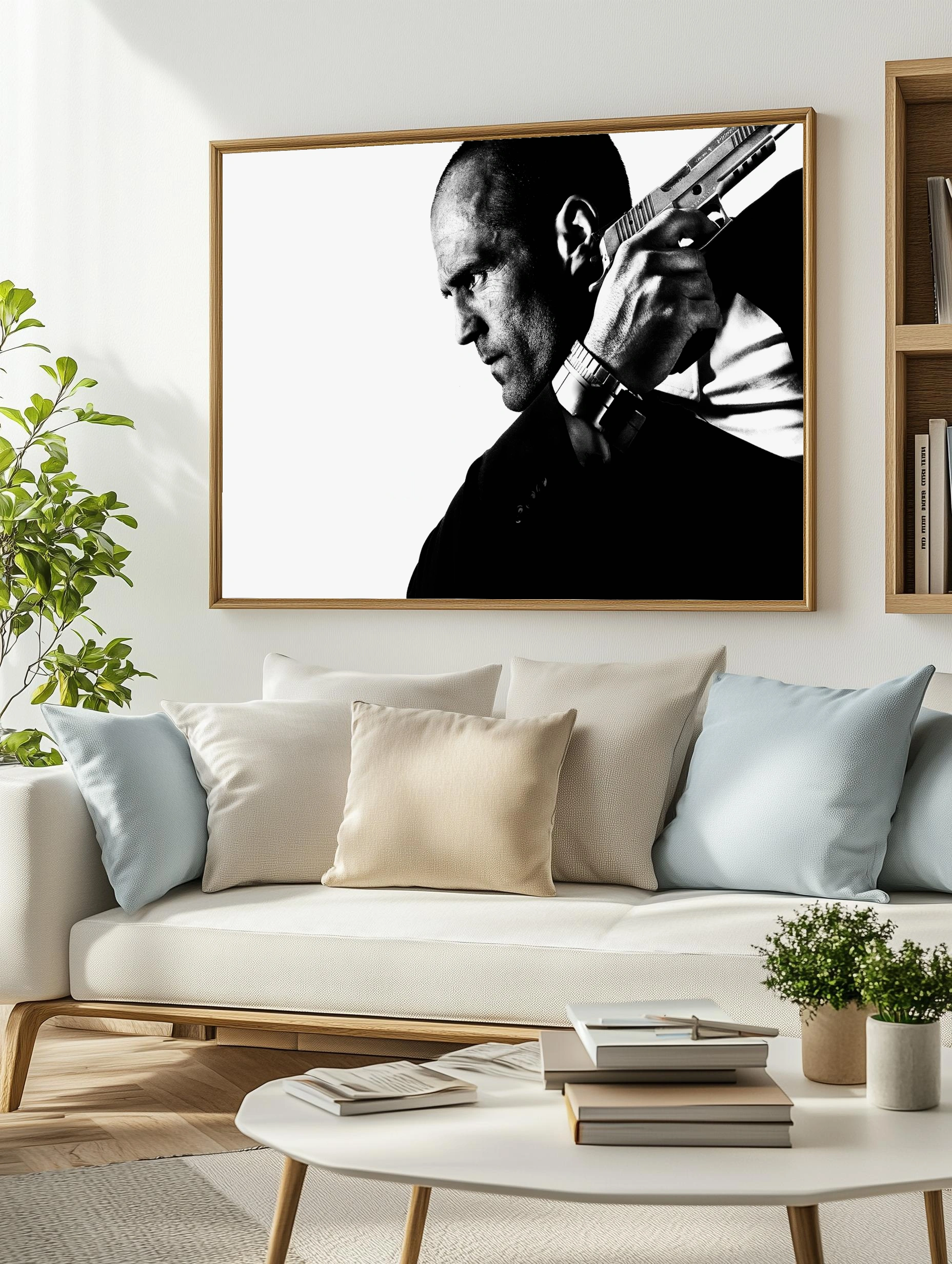 Чёрно-белое изображение актёра Джейсона Стэтхэма с пистолетом в руке, выполненное в стиле минимализма и интенсивного контраста. Этот художественный плакат идеально подойдёт для интерьера в стиле современного искусства, добавляя решительности и динамизма в гостиную или кабинет. Стильный декор стен с акцентом на силу и концентрацию.