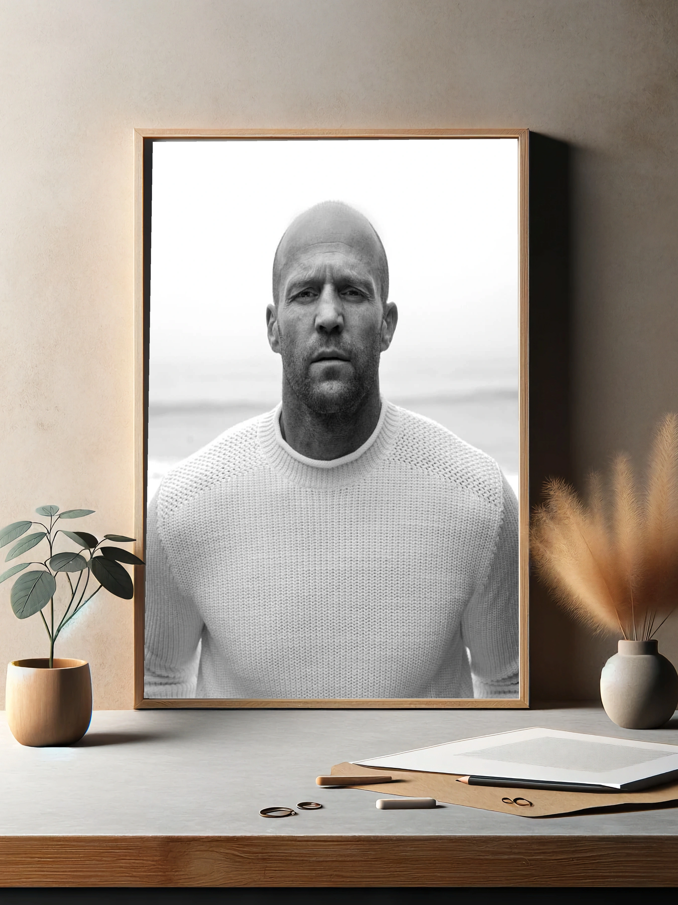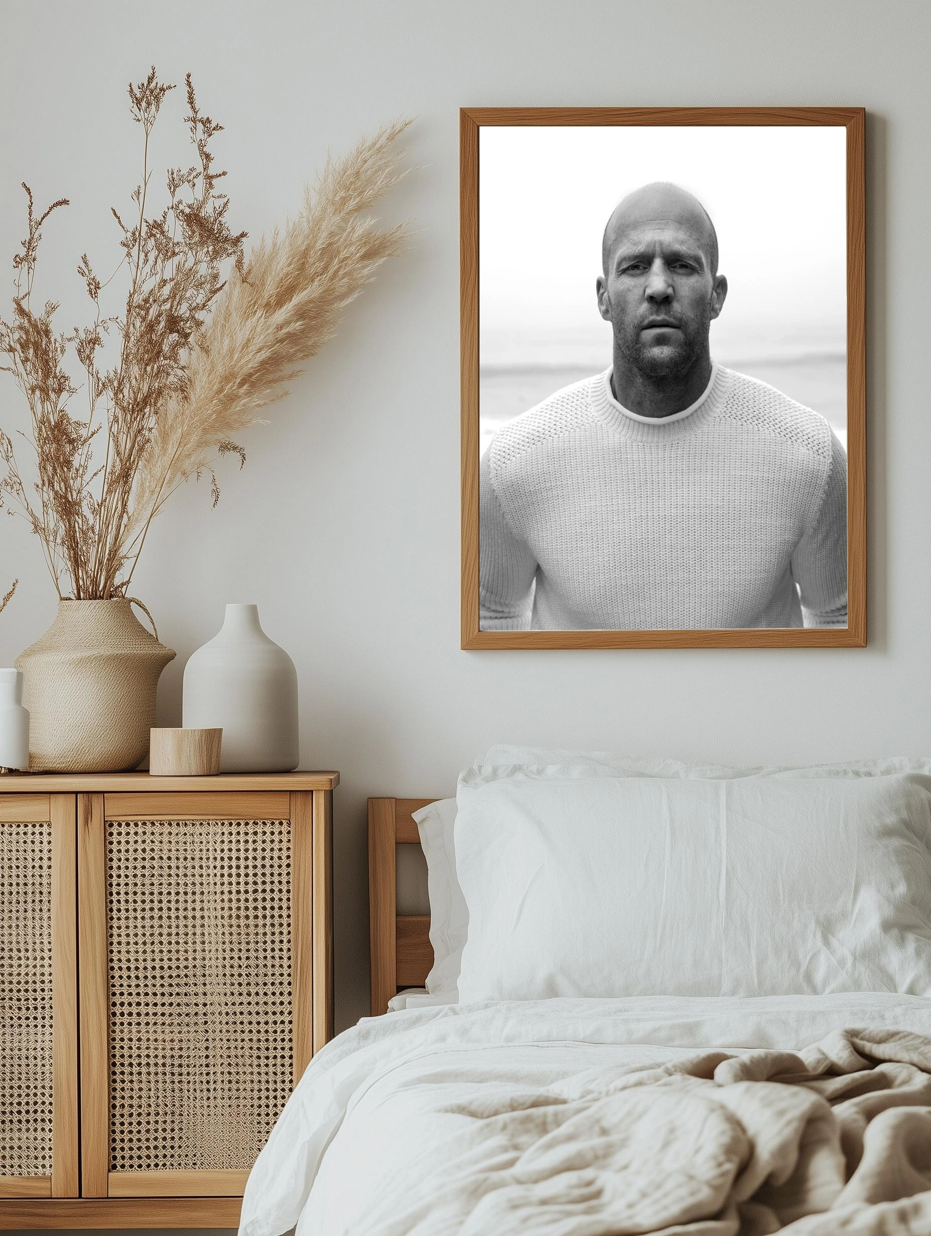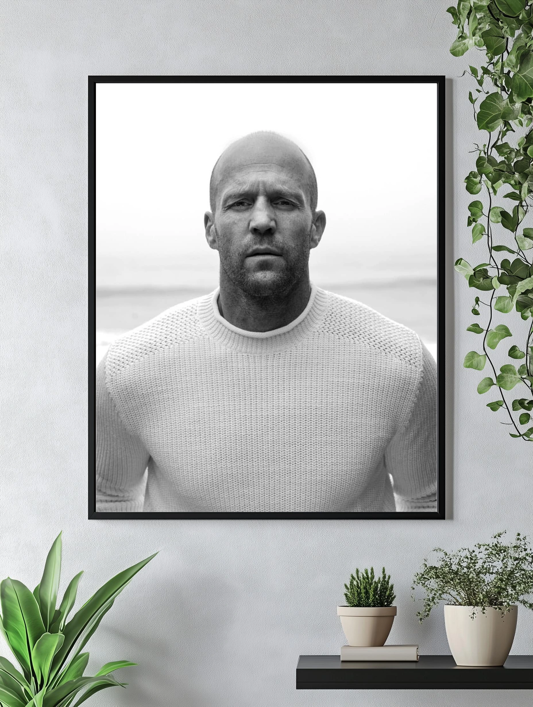 Черно-белый художественный фотопортрет мужчины с серьезным выражением лица в вязаном свитере. Монохромная палитра и минималистичный фон создают стильный декор стен и интерьерное искусство, подходящее для гостиной или офиса. Уникальный художественный плакат с акцентом на текстуры и эмоции.