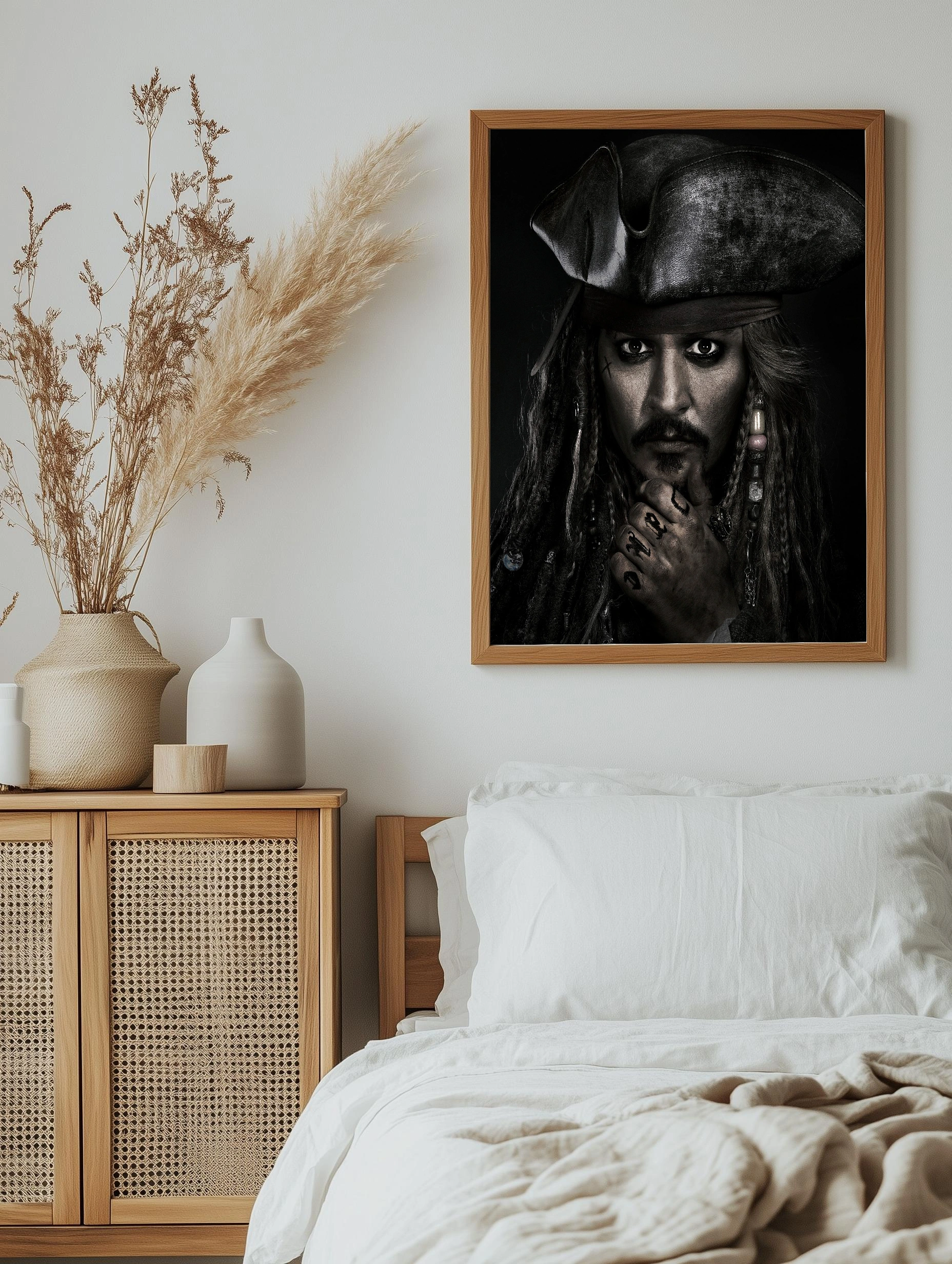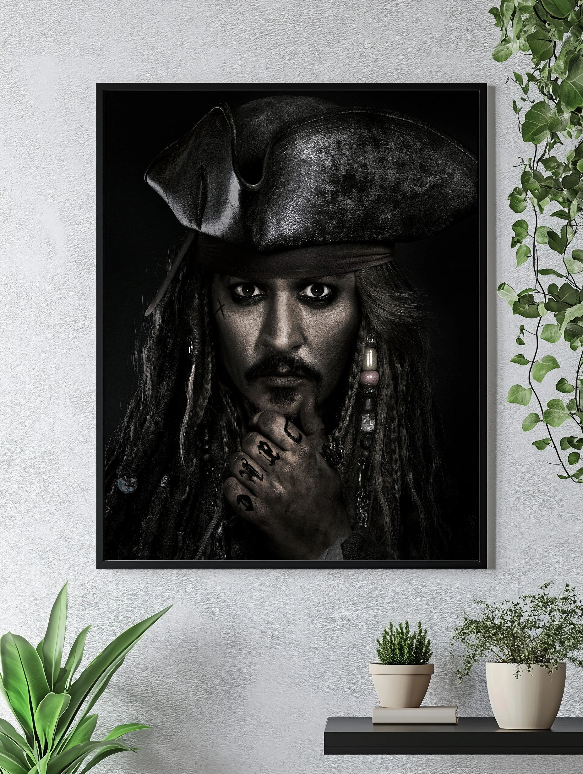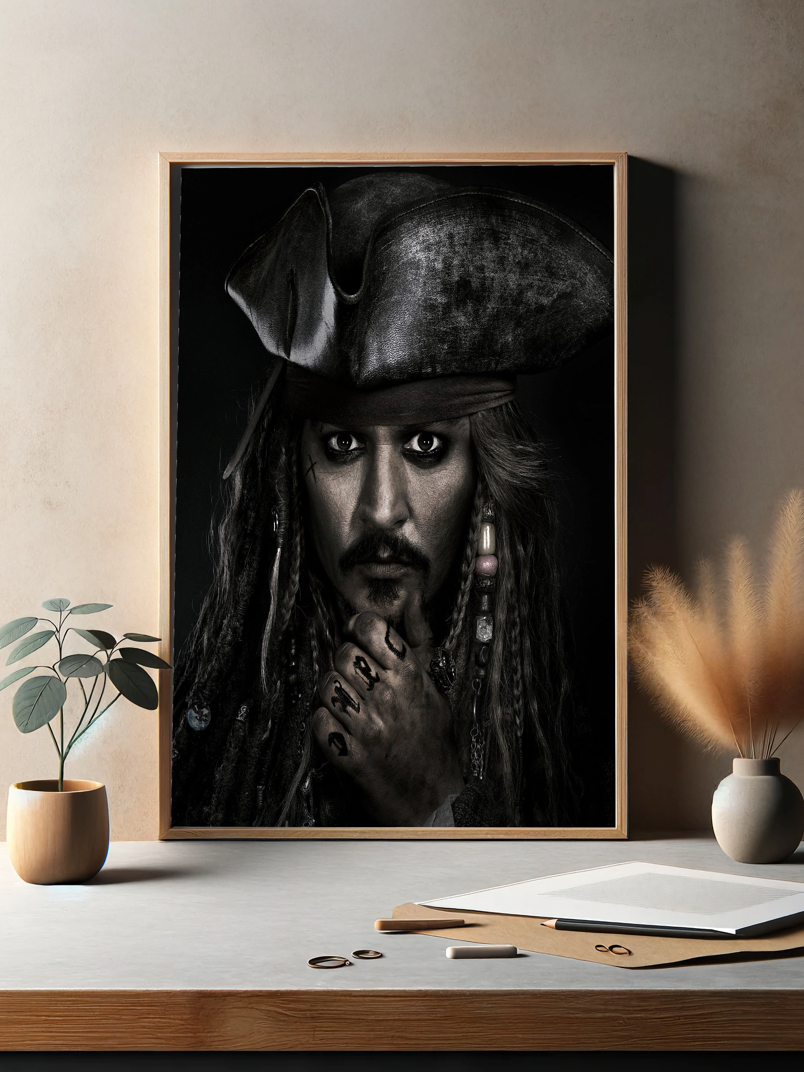 На изображении показан известный персонаж Джек Воробей из серии фильмов «Пираты Карибского моря». Картина выполнена в мрачных тонах с акцентом на детали лица и костюма героя. Черный кожаный пиратский треуголка, тёмный макияж вокруг глаз и многочисленные украшения создают атмосферу пиратского приключения. Это интерьерное искусство отлично подходит как декоративный плакат в рамке или фотопостер для гостиной, спальни или офиса. Стильный декор стен с характерным пиратским колоритом и выразительным настроением.
