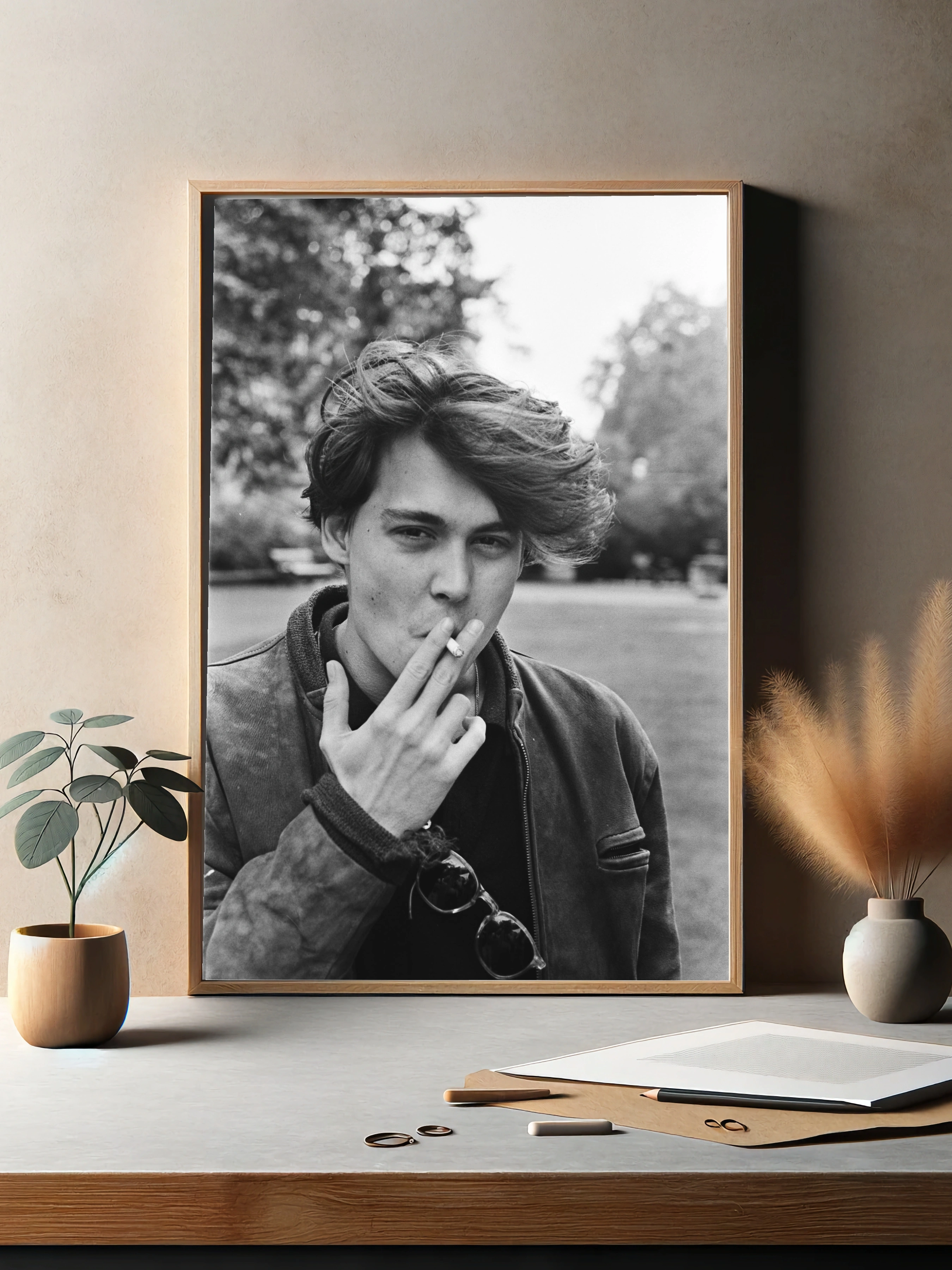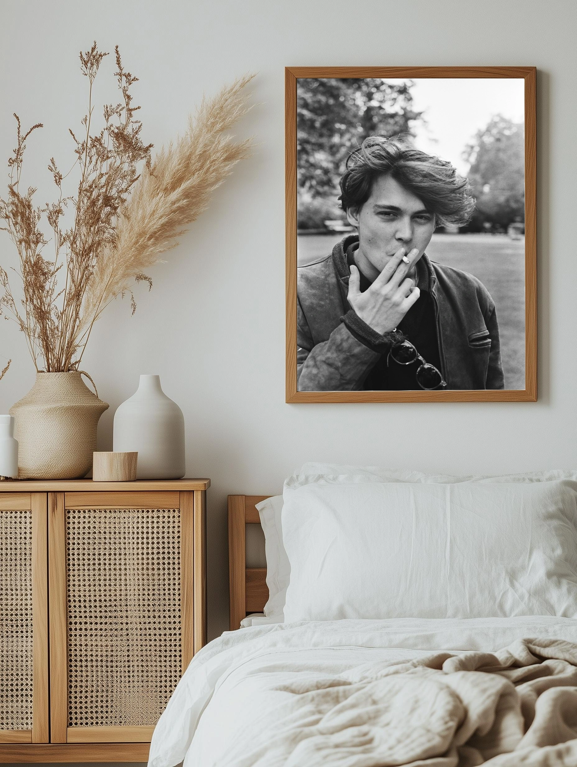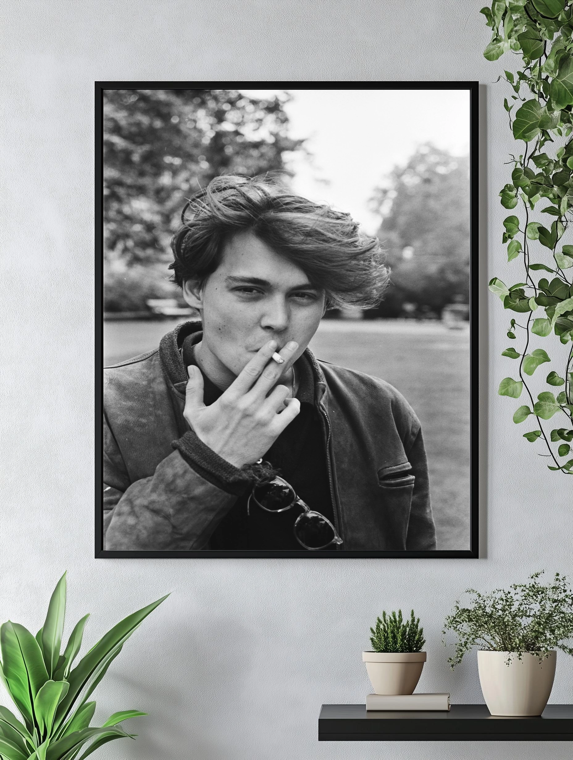 Этот интерьерный постер в черно-белой гамме демонстрирует молодого человека с ветреной прической, курящего сигарету на фоне размытых деревьев. Искренность и дерзость момента переданы благодаря естественной позе и динамичности волос. Идеально подходит для современного искусства в гостиной или офисе, добавляя стильный и винтажный акцент в интерьер.