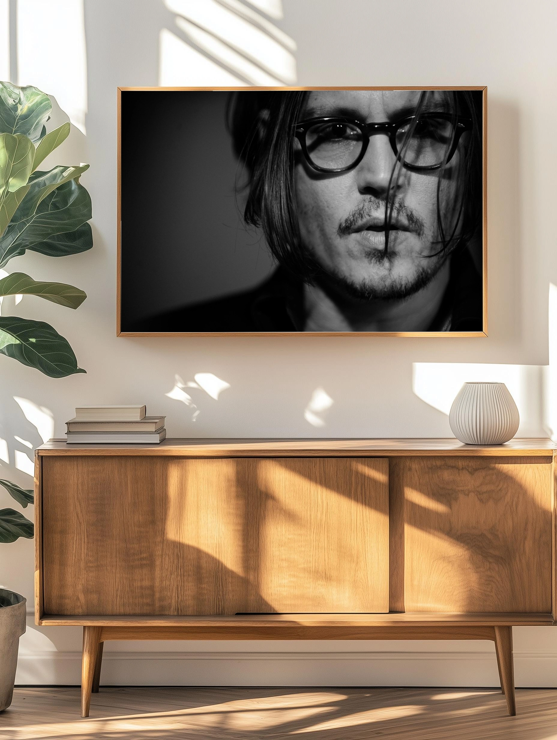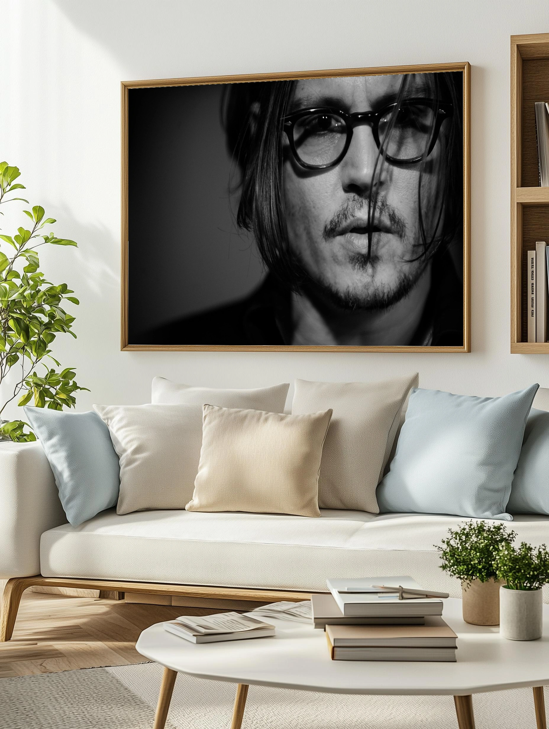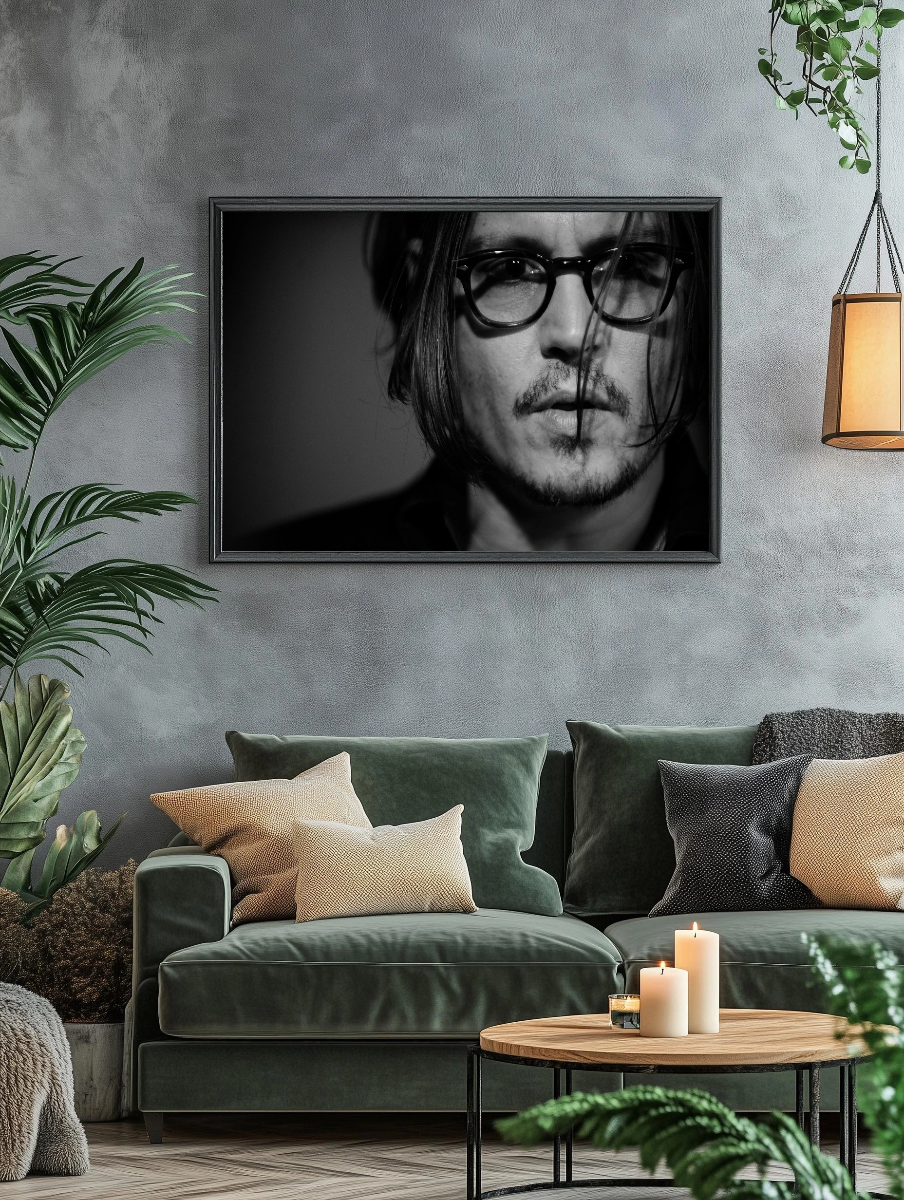 Чёрно-белая художественная фотография с крупным планом лица Джонни Деппа, с акцентом на очках и тенях, создающими мистическую и глубокую атмосферу. Этот интерьерный арт для стен подходит как декоративный плакат в рамке, идеально вписываясь в современный стиль гостиной или офиса. Чувство интроспекции и таинственности подчёркнуто через игру света и тени.