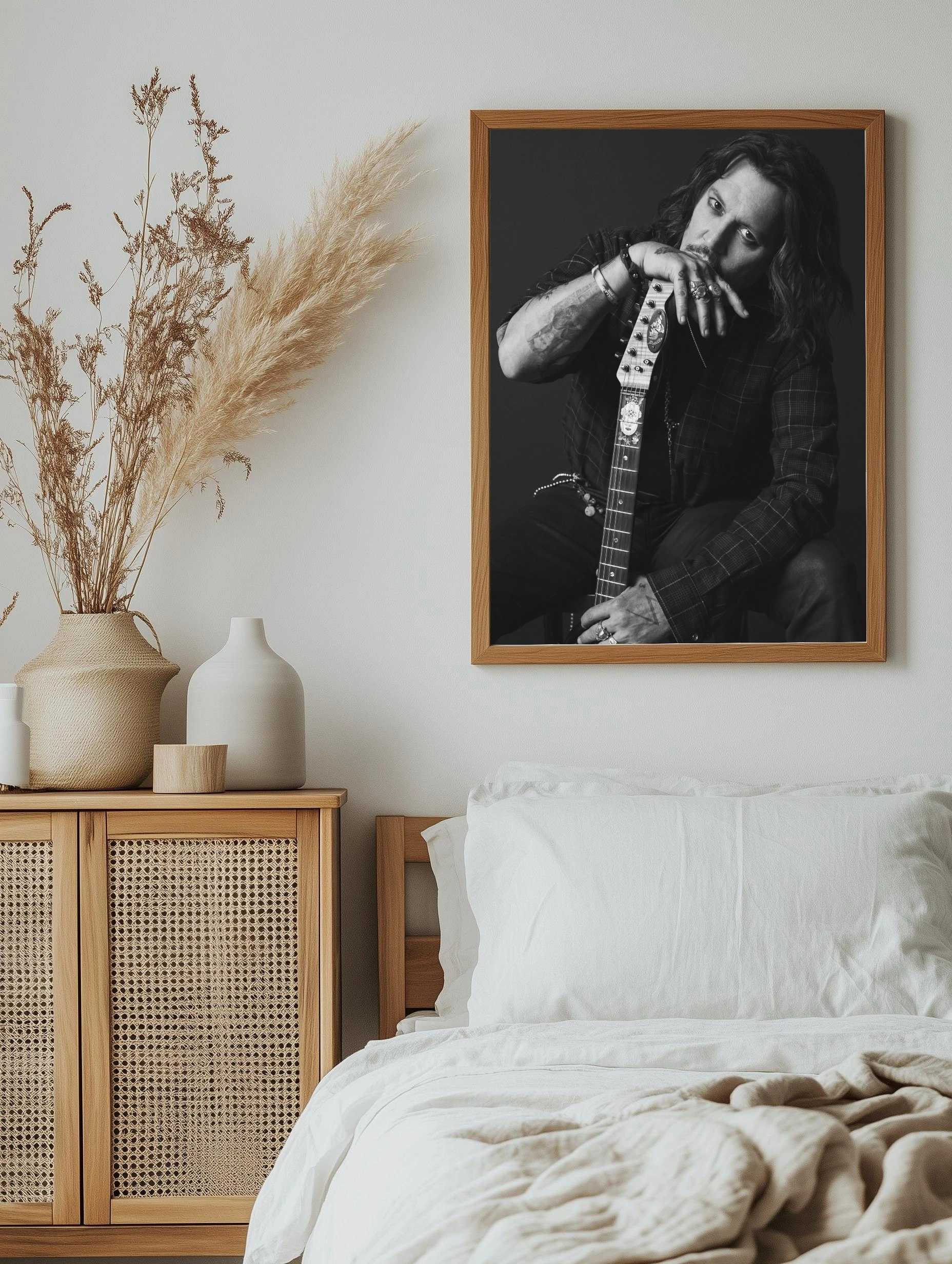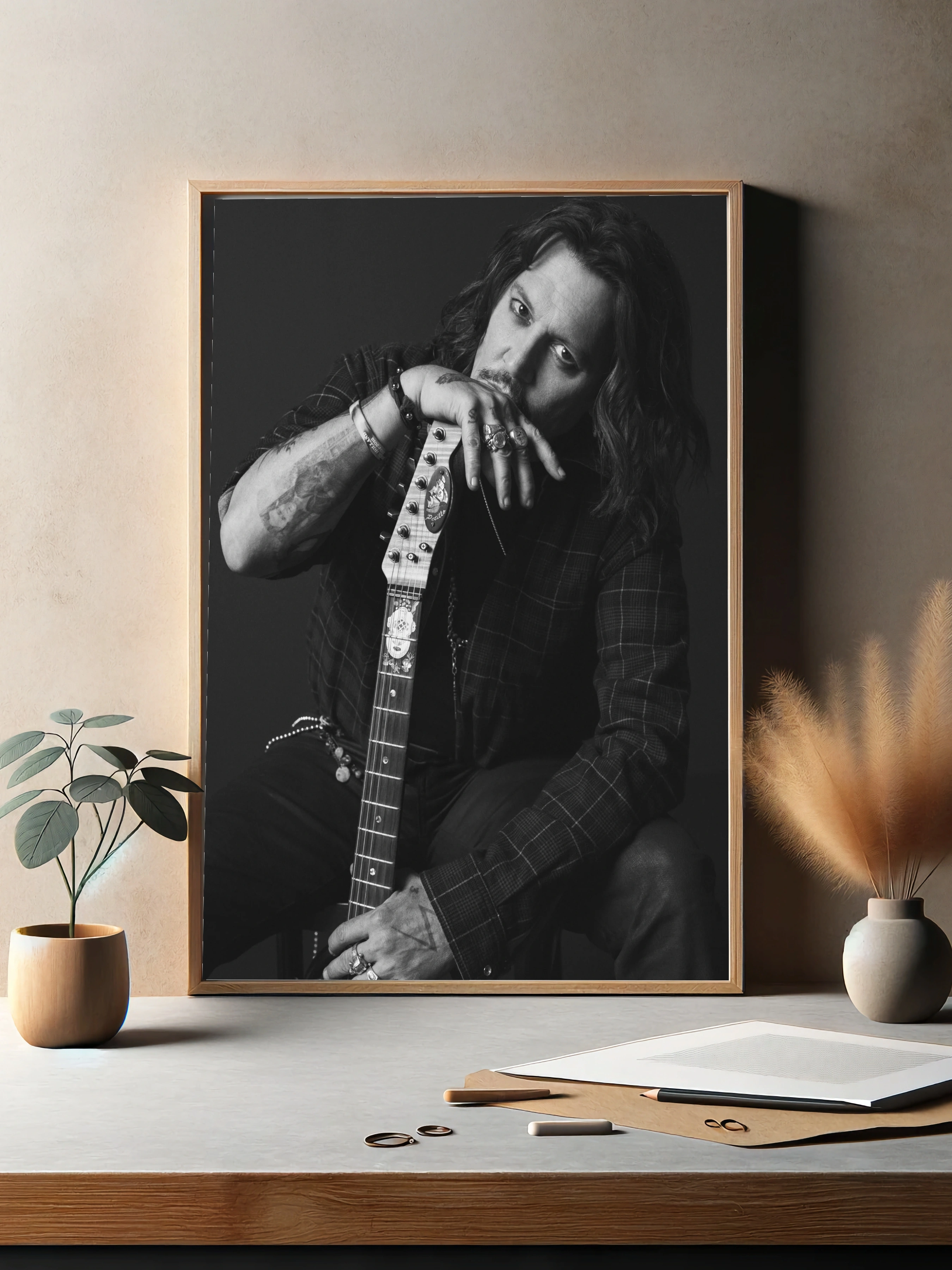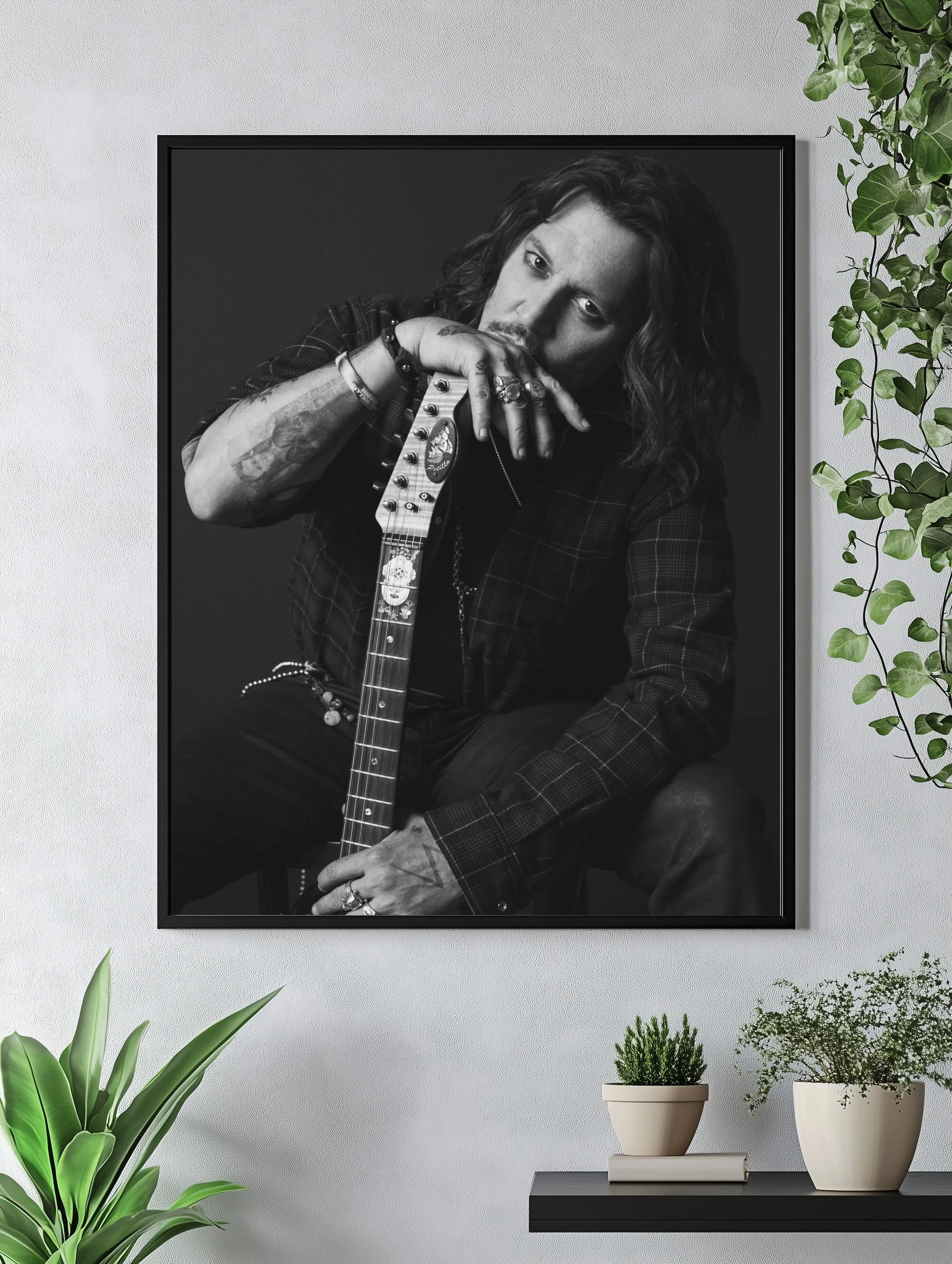 Черно-белое фото мирового актёра и музыканта Джонни Деппа, где он задумчиво держит гитару. Строгий контраст, глубокие тени и выразительный взгляд создают атмосферу интроспекции и рок-стиля. Идеально подходит как интерьерный фотопостер для спальни, гостиной или офиса.