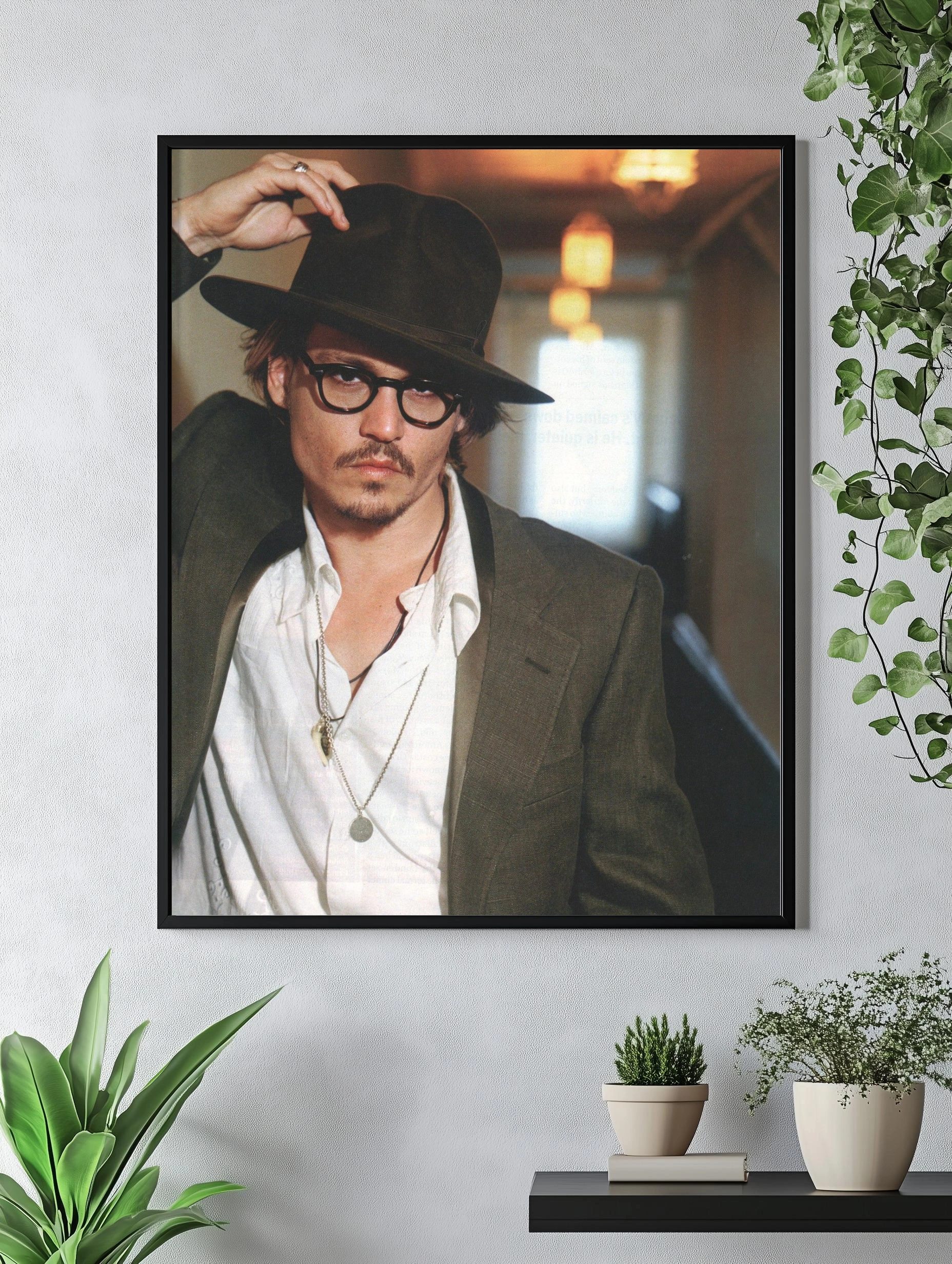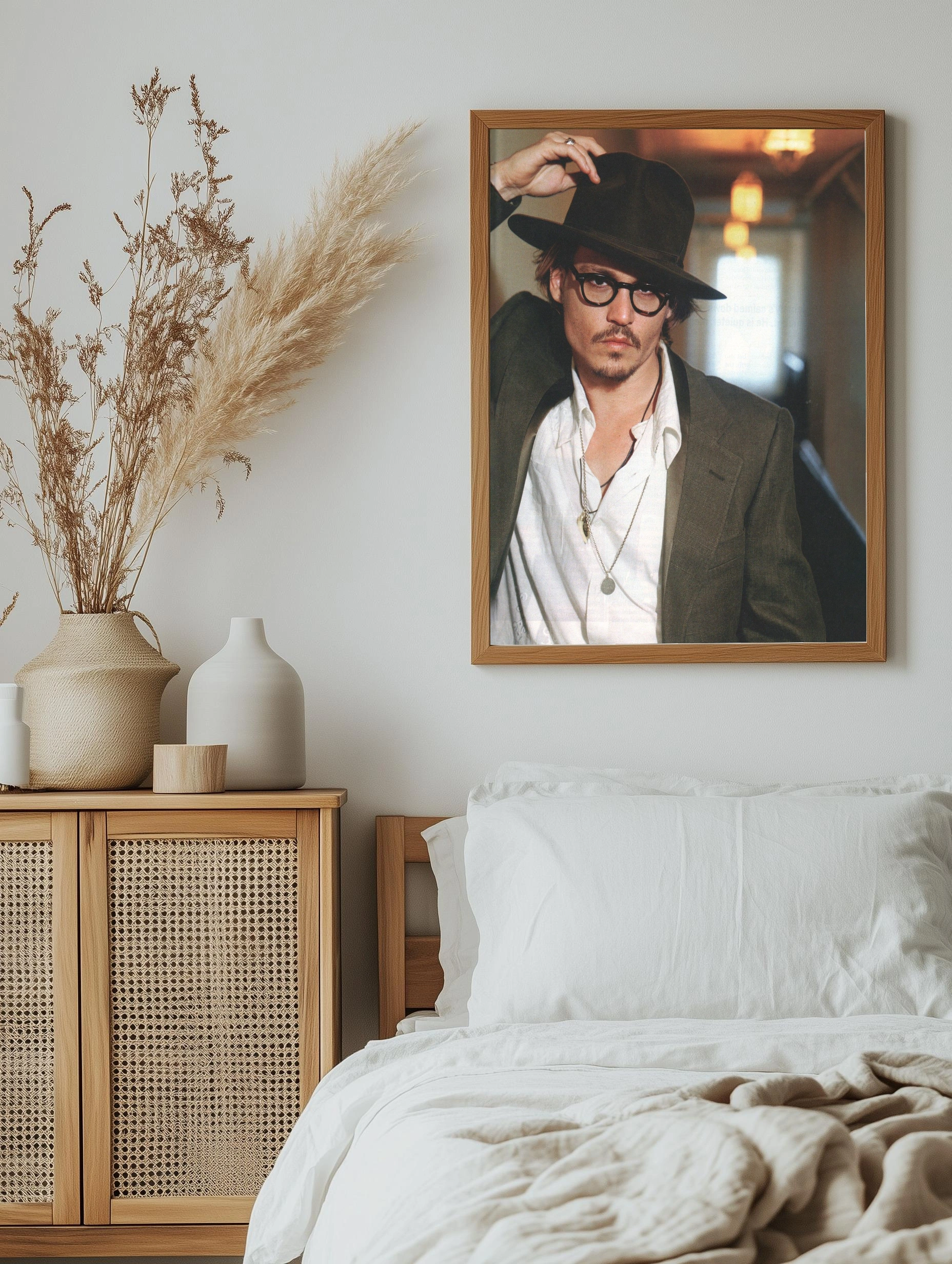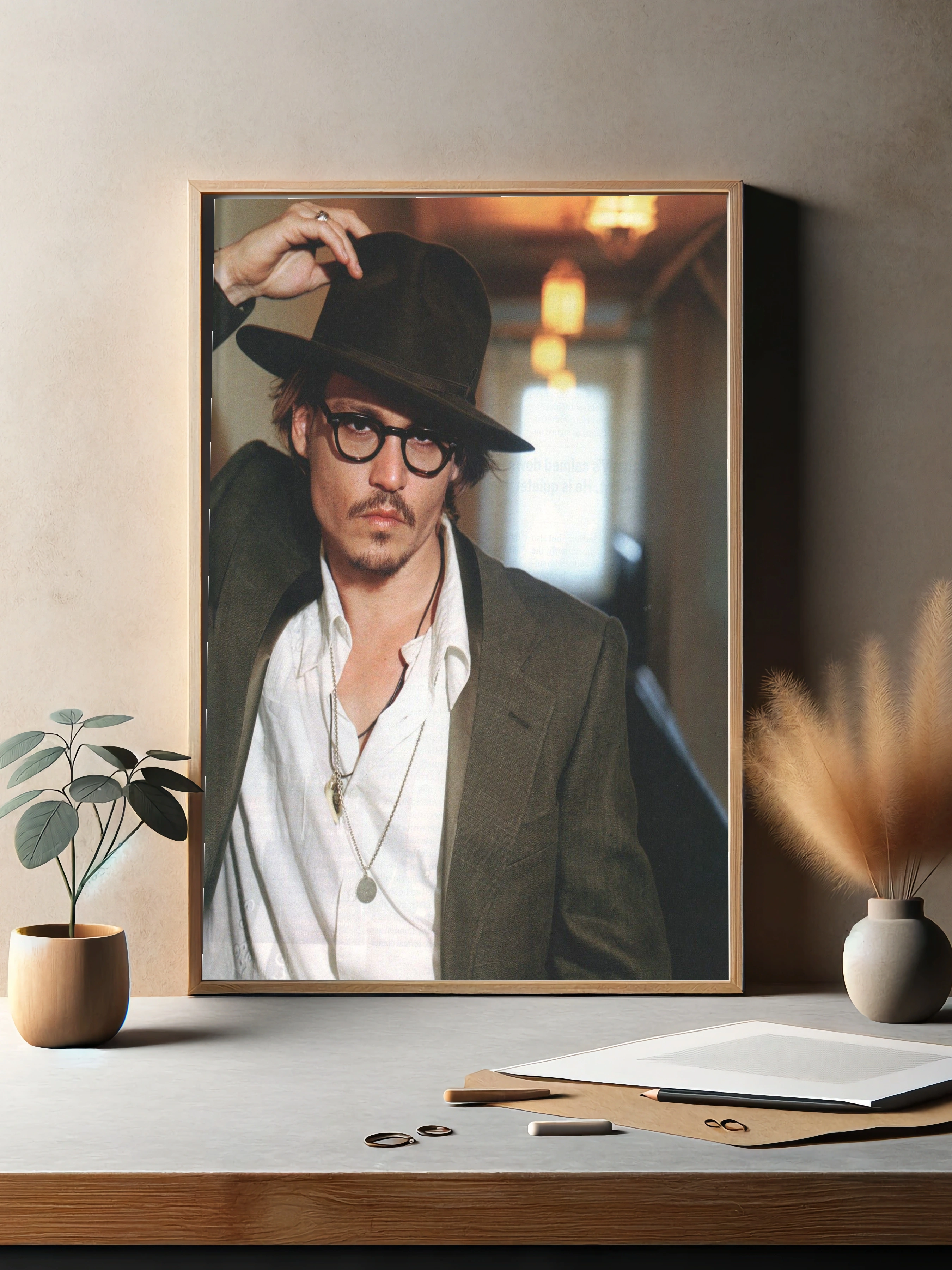 На этом художественном постере изображён известный актёр Джонни Депп, одетый в белую рубашку и коричневый пиджак, с тёмной шляпой и очками. Фото выполнено в мягких тёплых тонах коричневого и бежевого, создавая атмосферу стильного интерьерного декора. Идеальный декоративный плакат для спальни или гостиной.