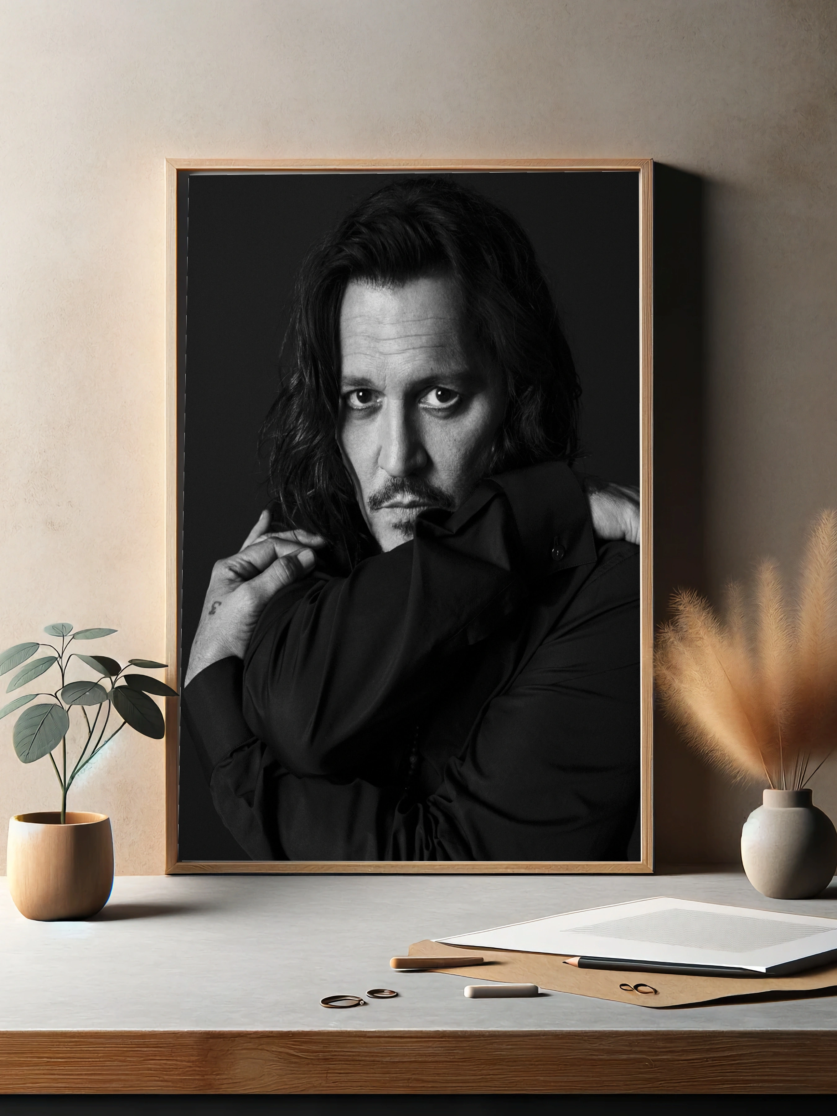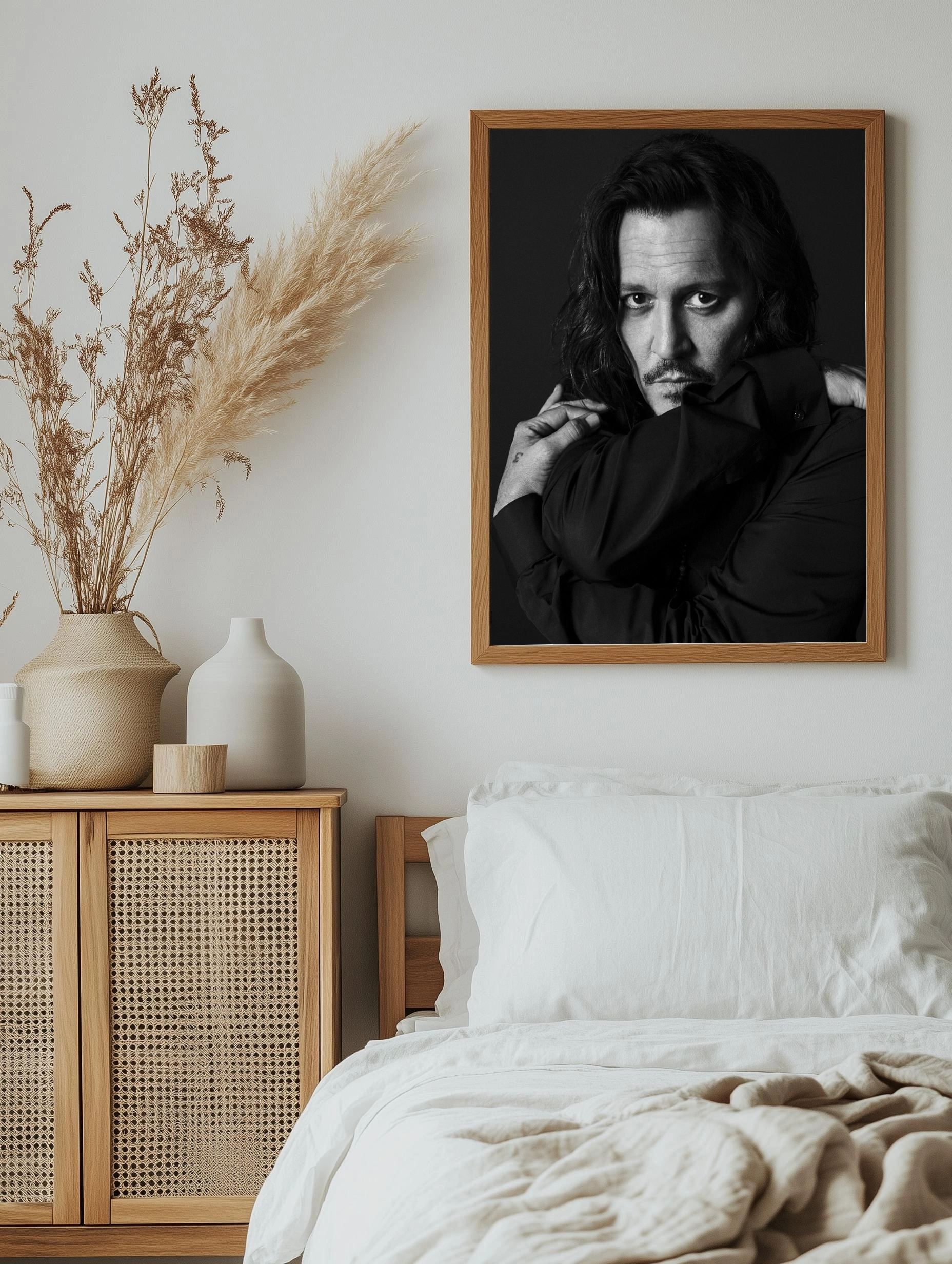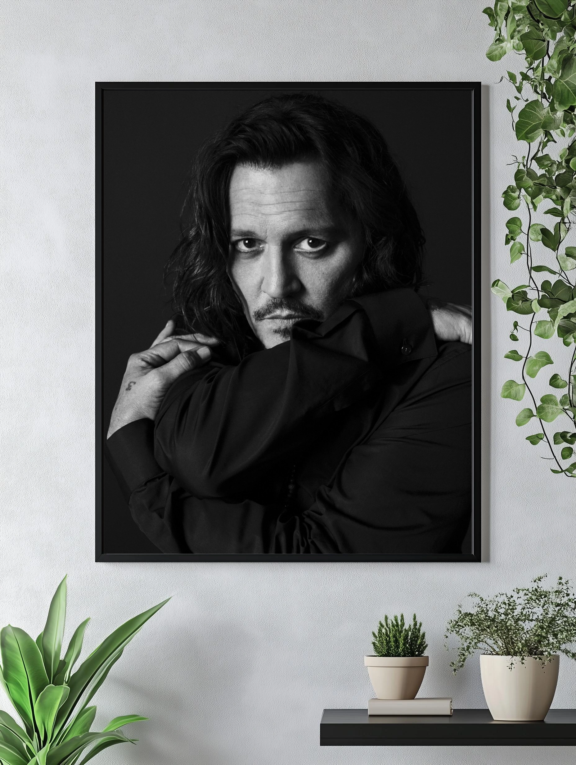 Чёрно-белое фото с крупным планом актёра Джонни Деппа, выполненное в драматическом стиле. Глубокий взгляд, лёгкая тень и контраст создают атмосферу интроспекции и тайны. Этот художественный плакат отлично впишется в интерьер гостиной или офиса, как стильный настенный декор и современное искусство для стен.
