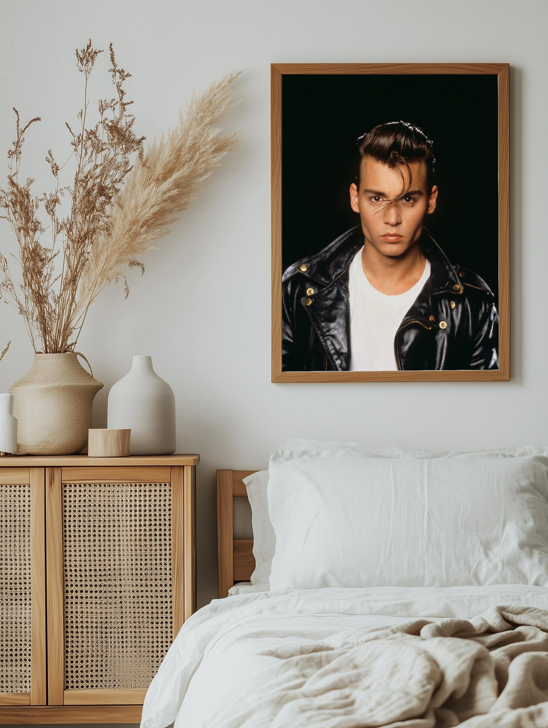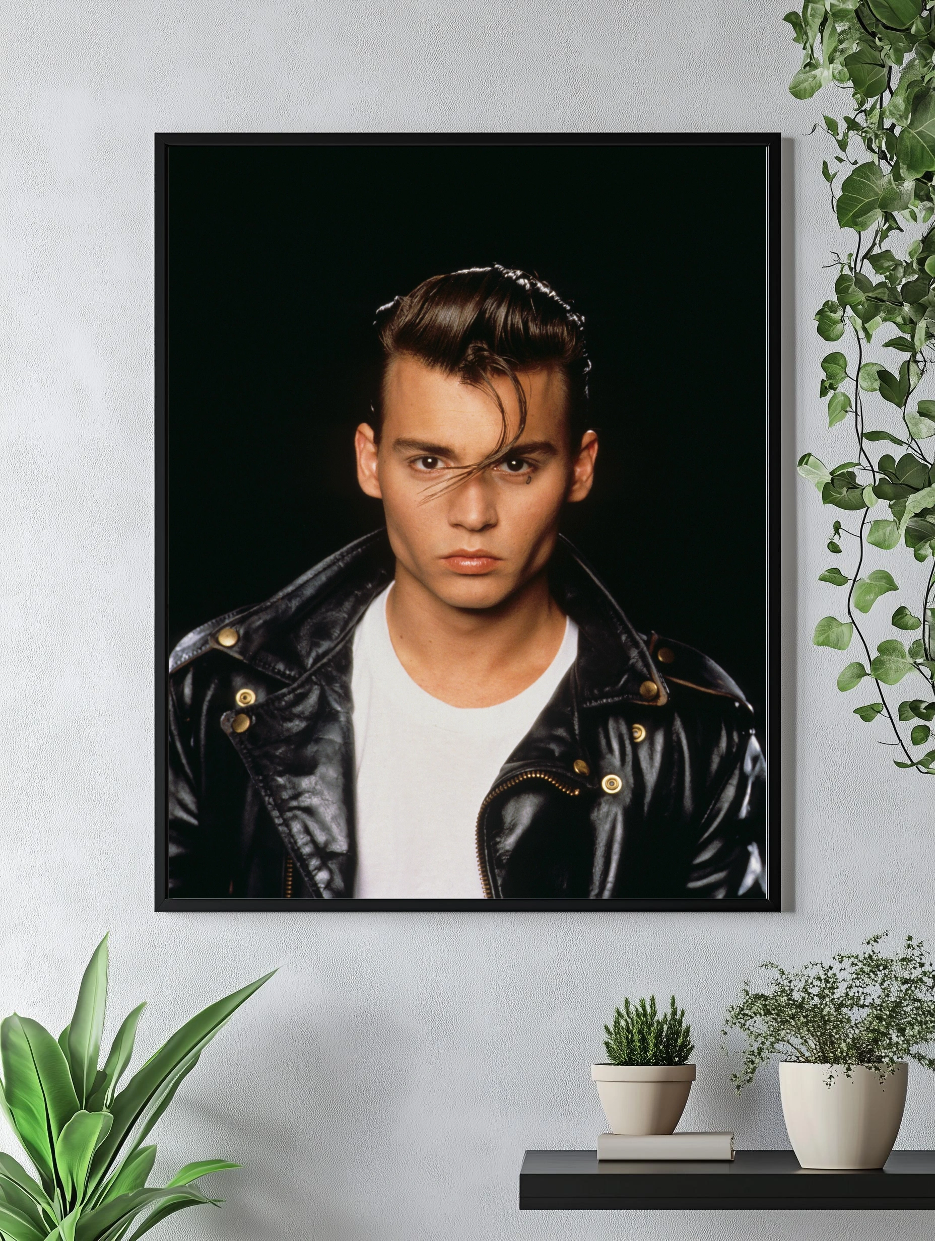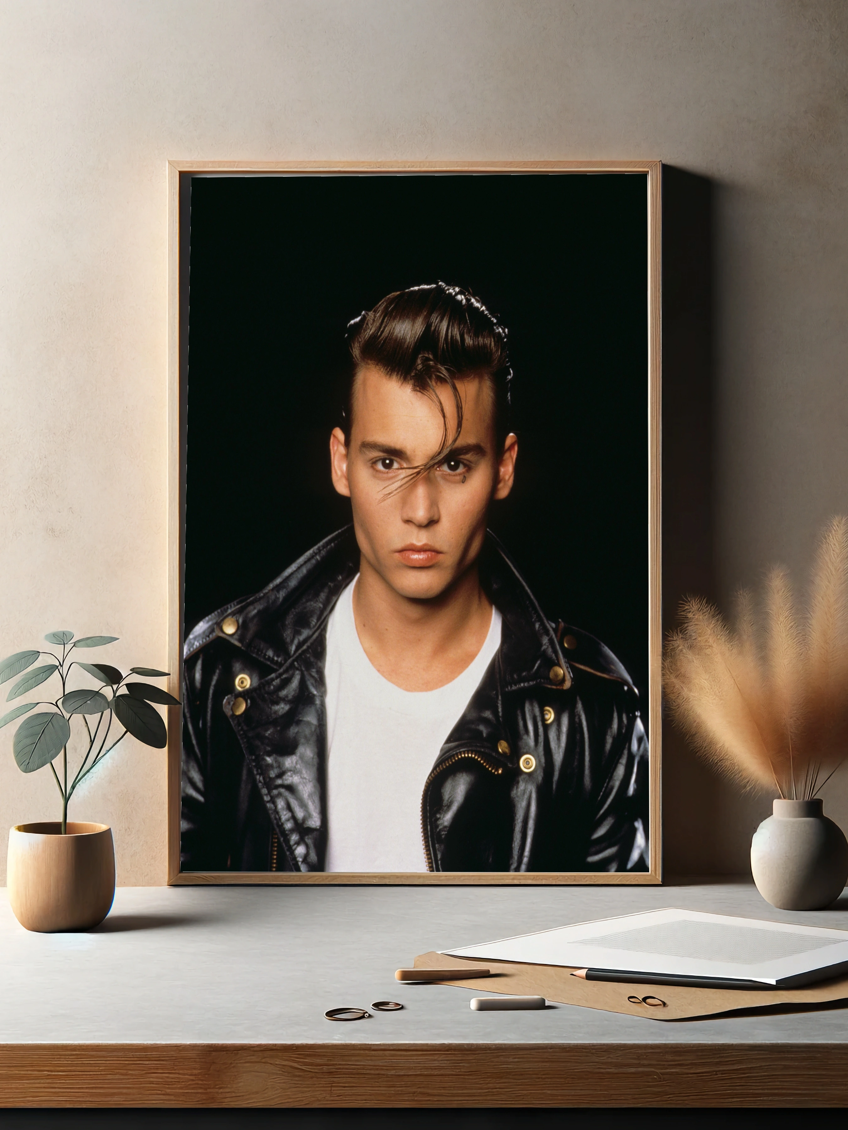На изображении знаменитый актёр Джонни Депп в молодости. Он представлен в классическом образе 90-х: кожаная чёрная куртка и белая футболка на тёмном фоне. Стиль фото передаёт атмосферу бунтарства и ретро, идеально подходит для интерьерного искусства, декоративного плаката или художественной картины для офиса и гостиной.