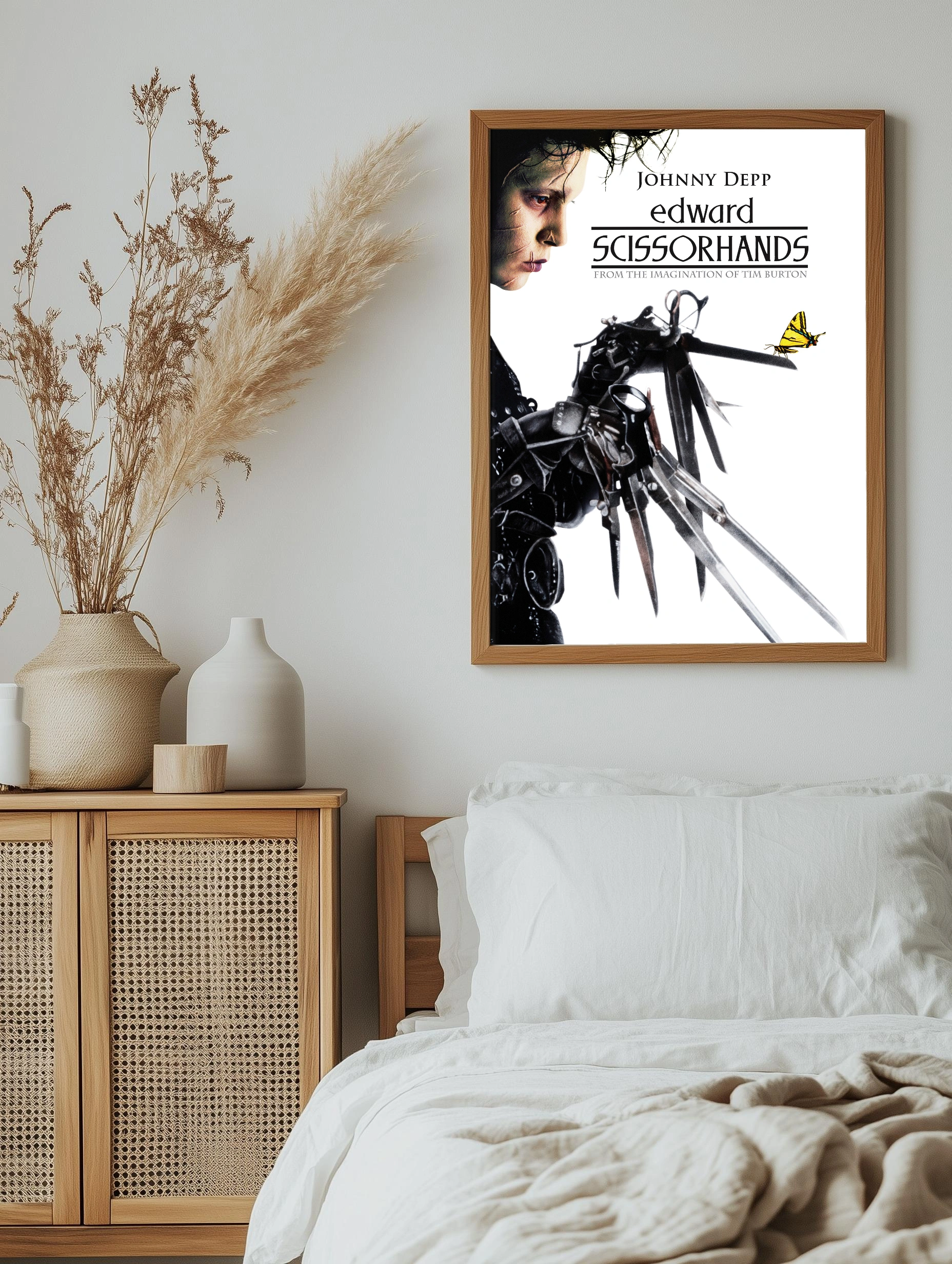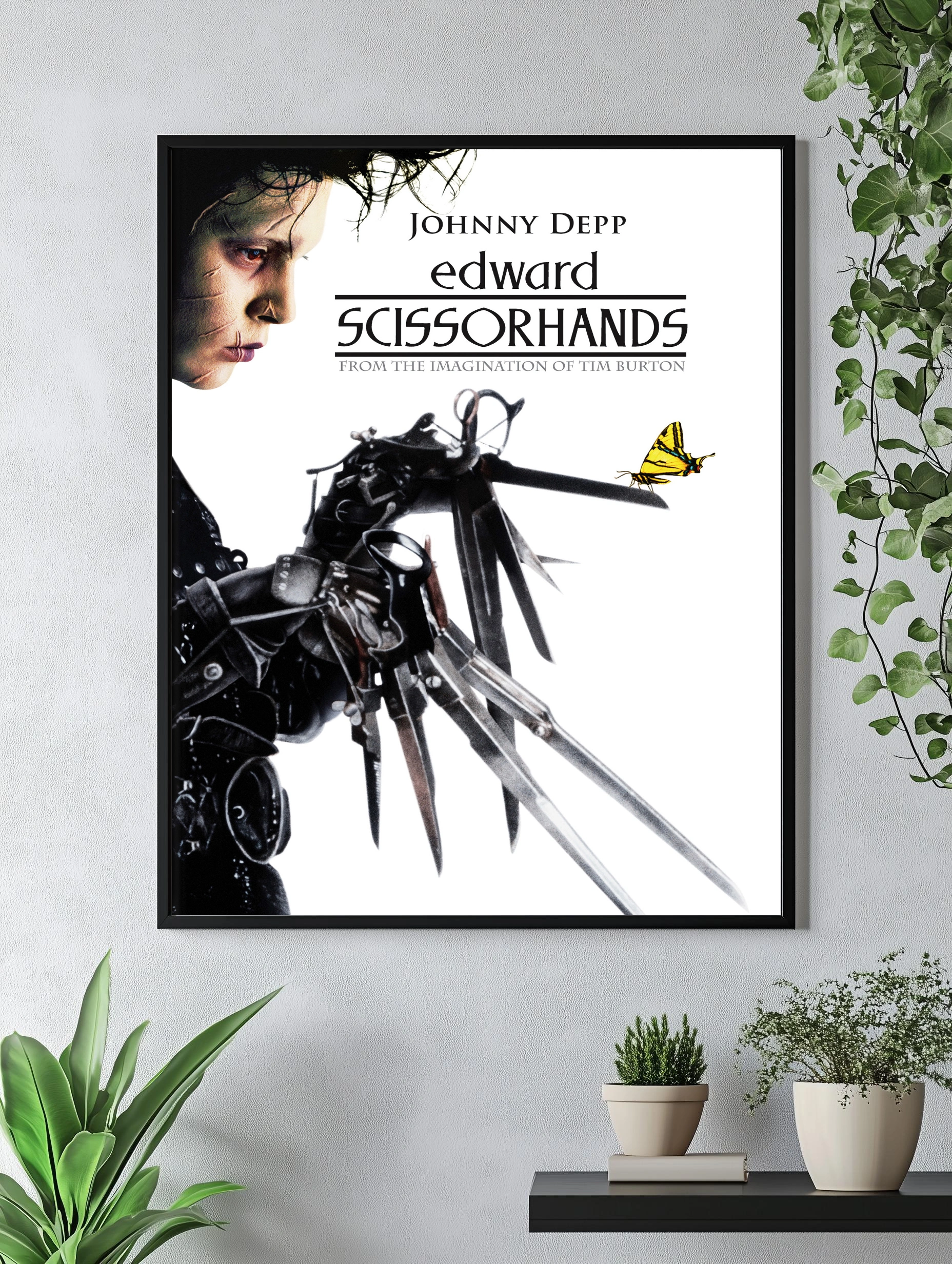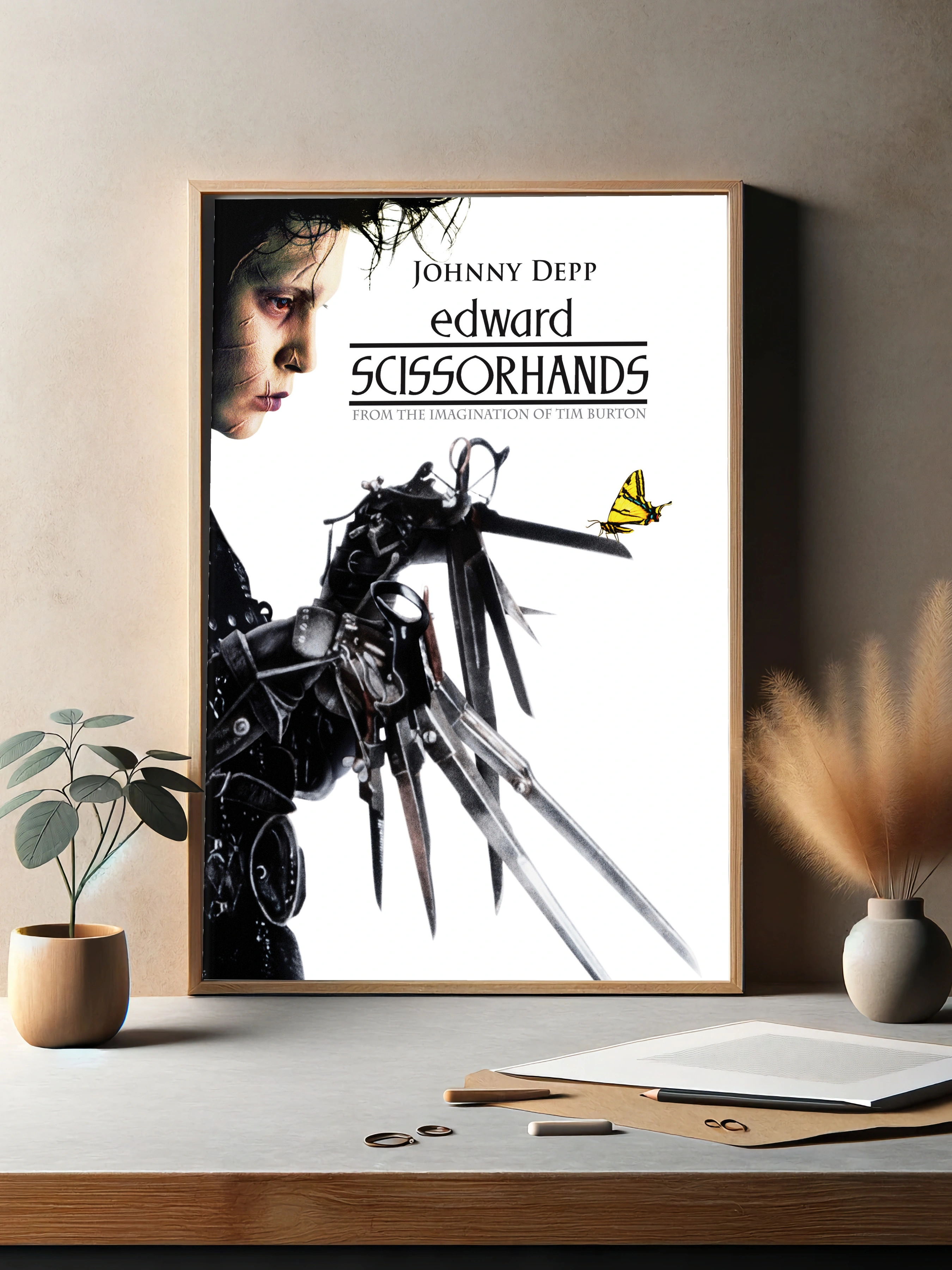 Этот интерьерный постер представляет культового персонажа Эдварда Руки-ножницы из одноимённого фильма режиссера Тима Бертона. На картине изображён Джонни Депп с выразительным лицом и уникальными металлическими руками-ножницами, что создаёт атмосферу мистики и фэнтези. Акцент на контрастах белого и чёрного с ярким жёлтым акцентом в виде бабочки, символизирующей хрупкость и надежду. Отличный художественный плакат для декора гостиной или офиса.