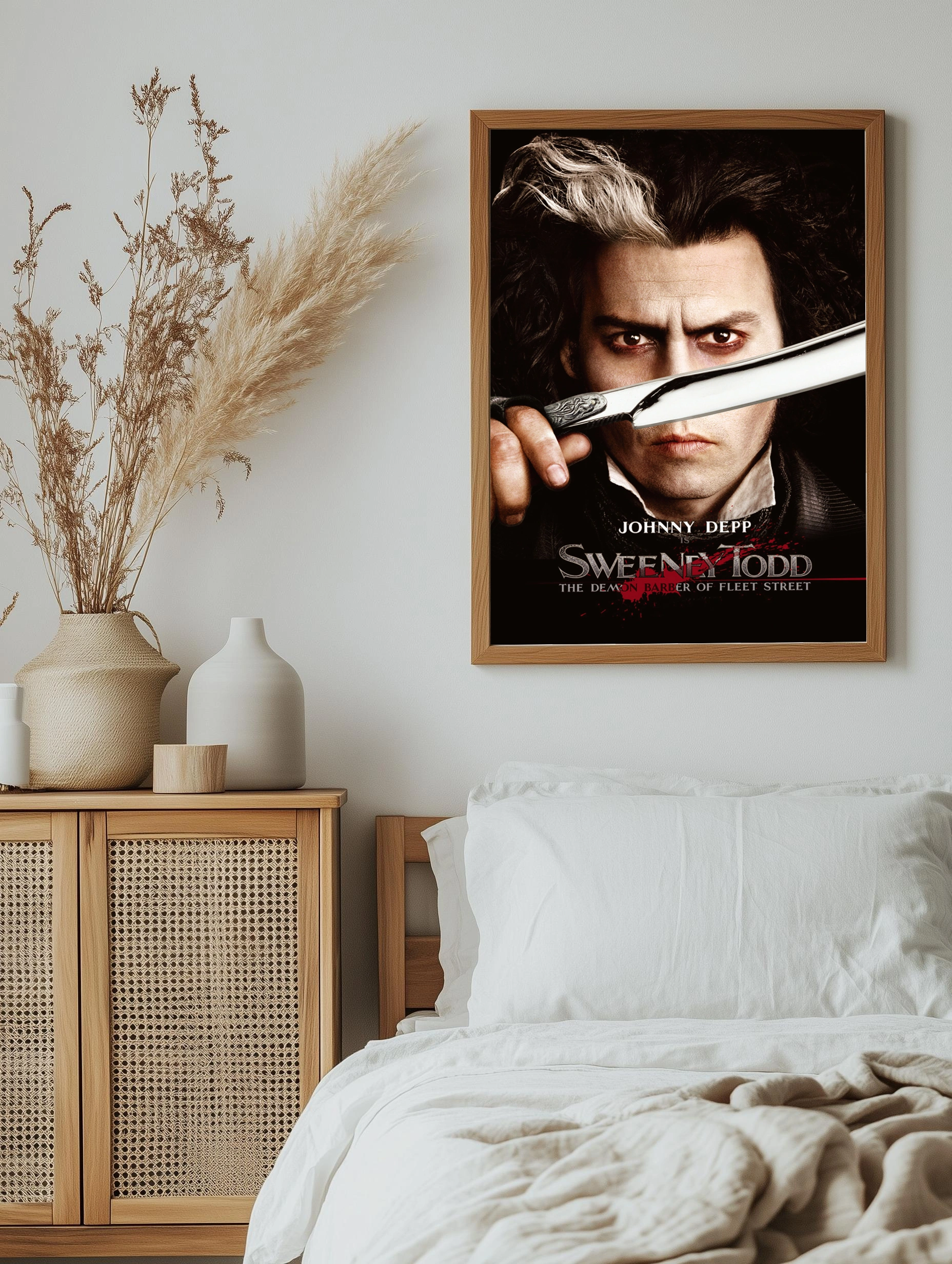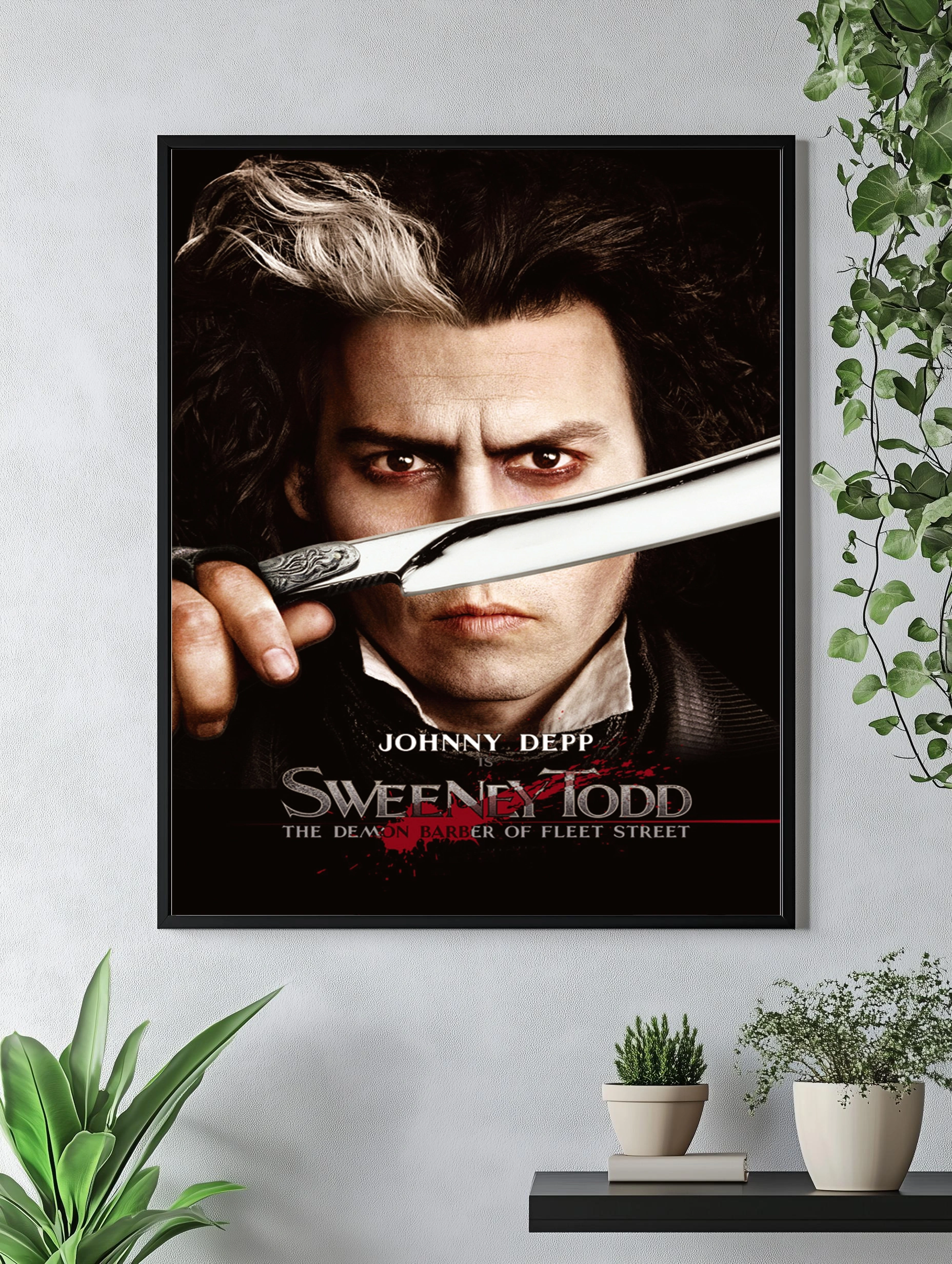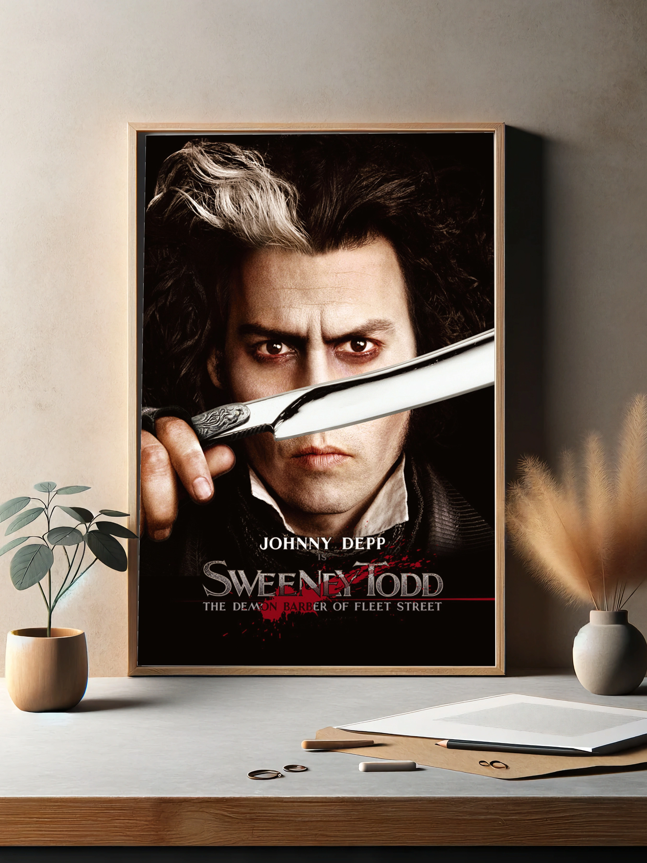 На изображении представлен Джонни Депп в роли Свини Тодда из одноименного фильма. Постер выполнен в мрачных тонах, где доминируют черный, белый и красный цвета. Фокус на лице персонажа с выразительным взглядом и бритвой, символизирующей темный и драматичный сюжет фильма. Это стильный интерьерный постер с ярким художественным контрастом и глубиной, идеально подходит для любителей кино и декоративного искусства.