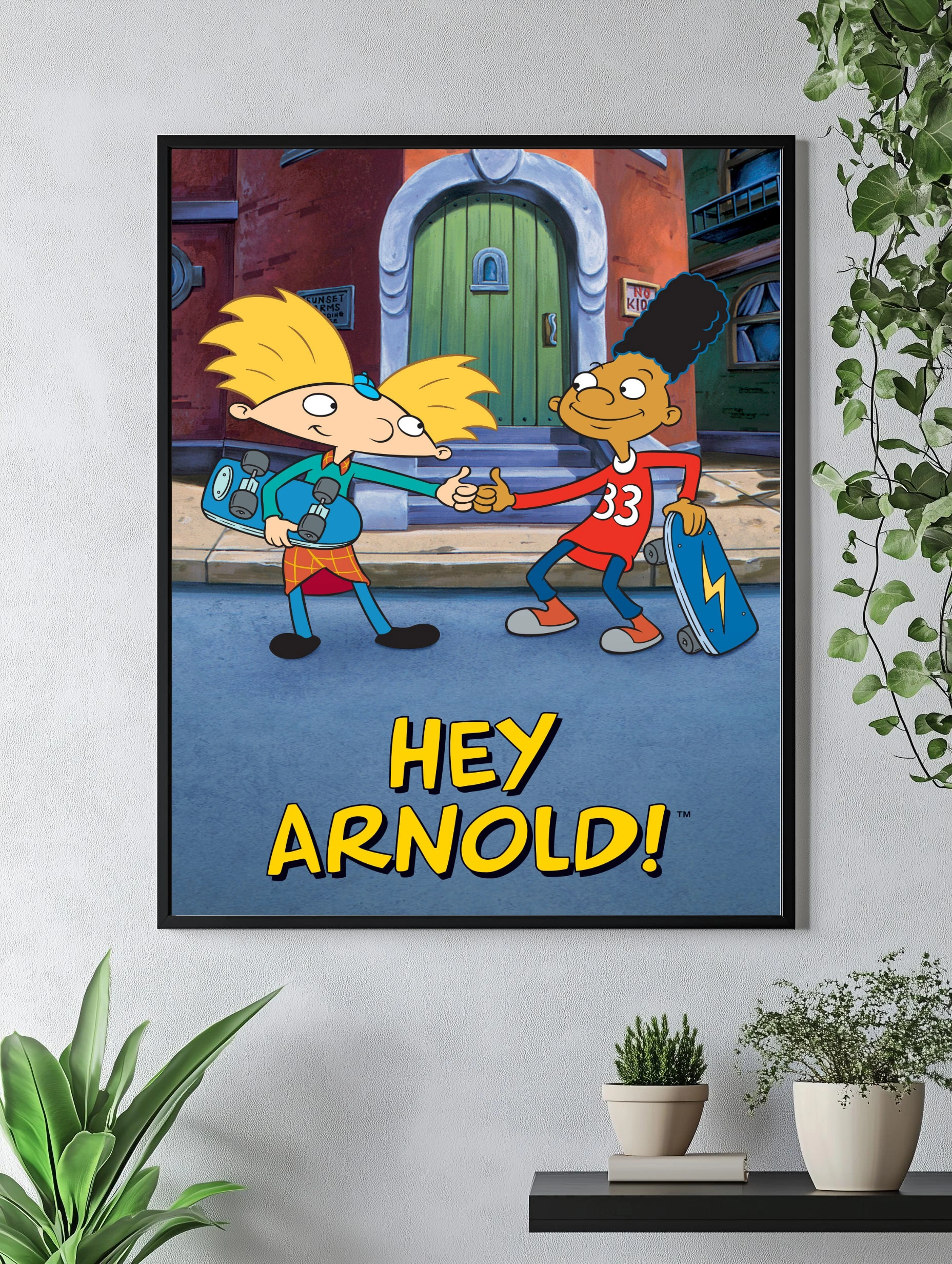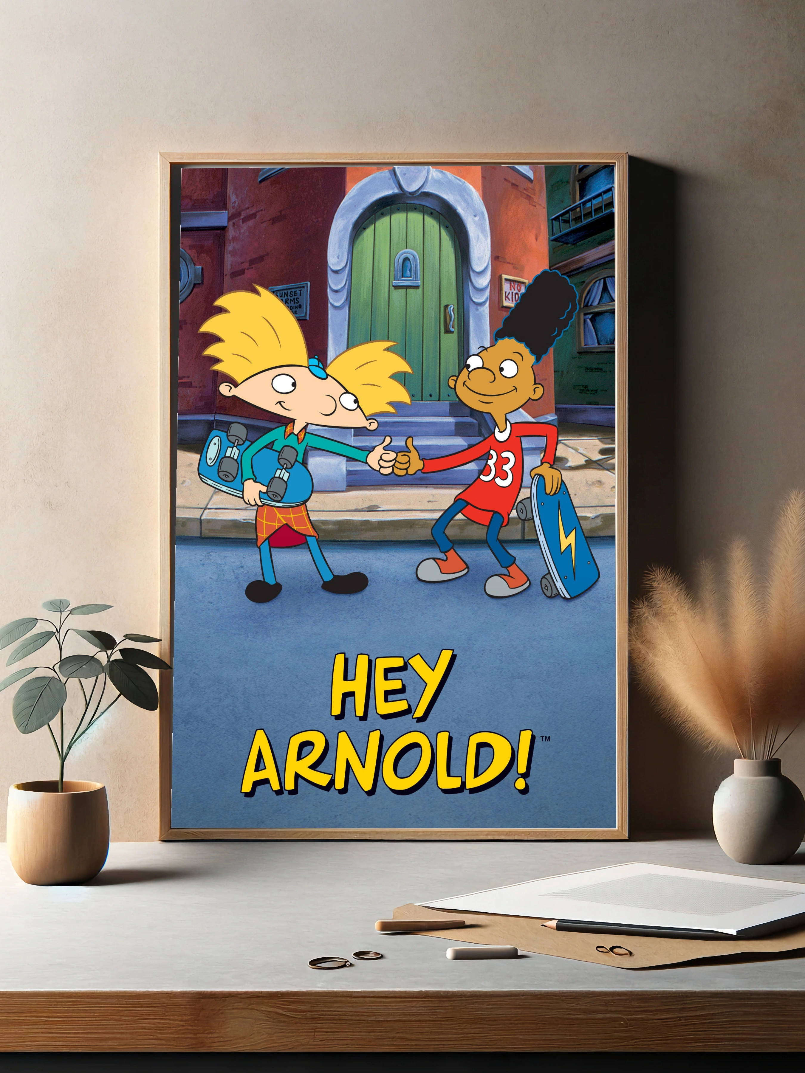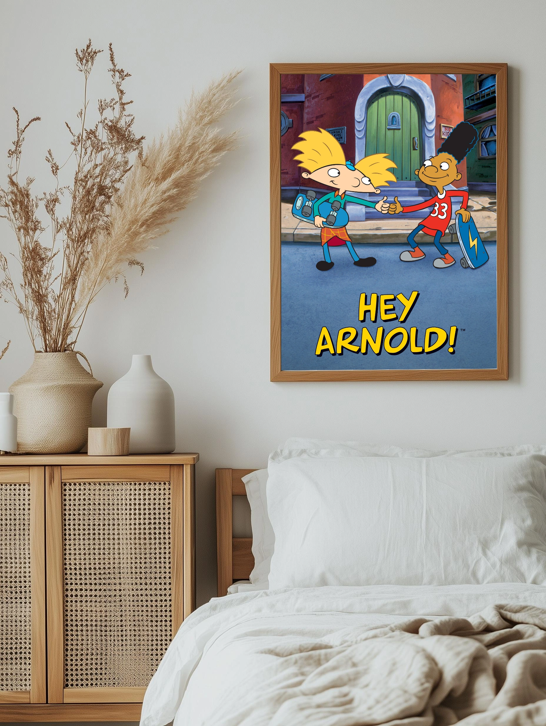 Яркий интерьерный постер с изображением известных персонажей из мультфильма ‘Хэй Арнольд!’. Арнольд с характерной жёлтой причёской и Джеральд с высоким чёрным волосом обмениваются приветствием на фоне городского дома с зелёной дверью. Картинка наполнена элементами современного искусства для стен и стилем анимации 90-х.