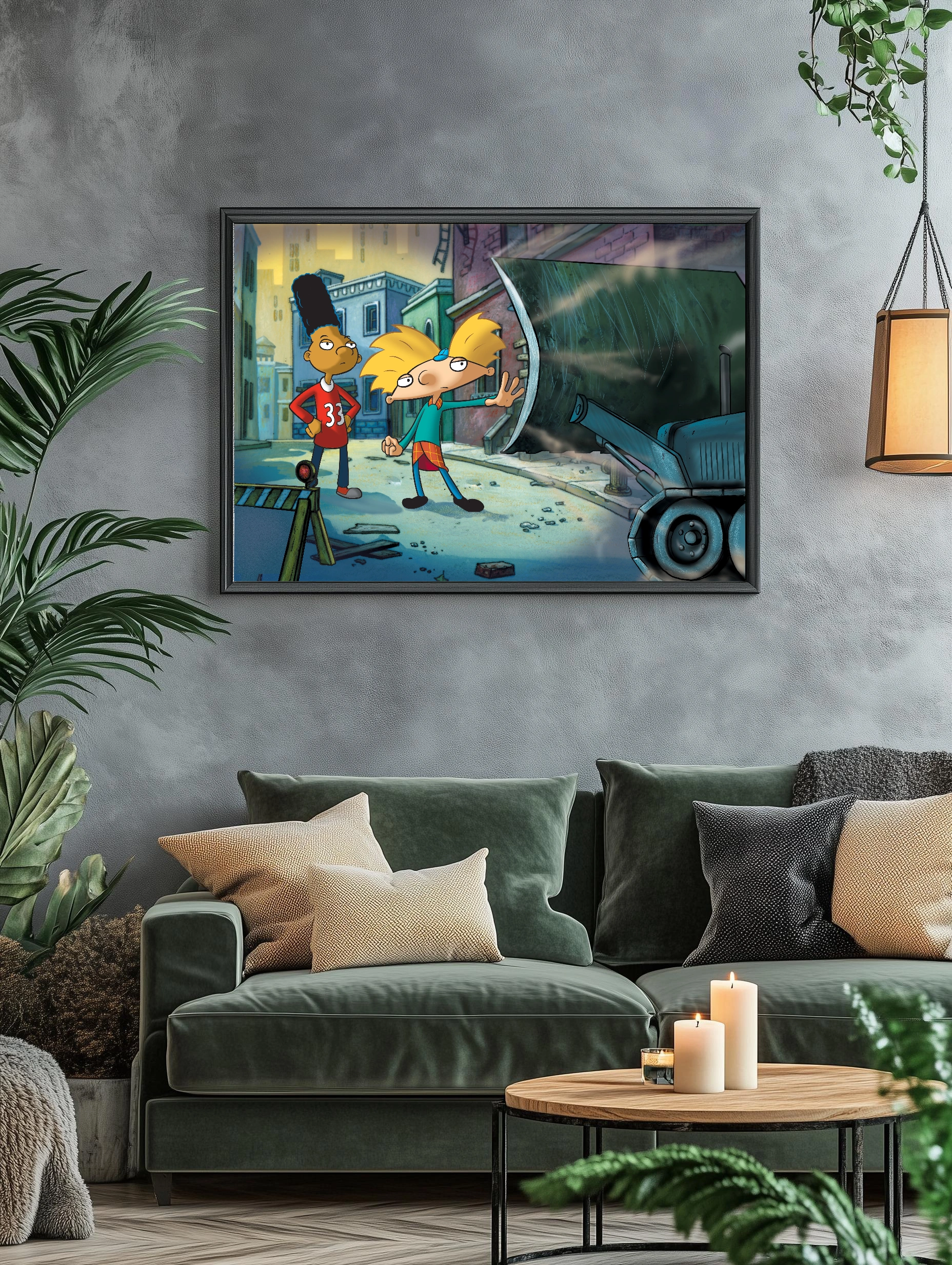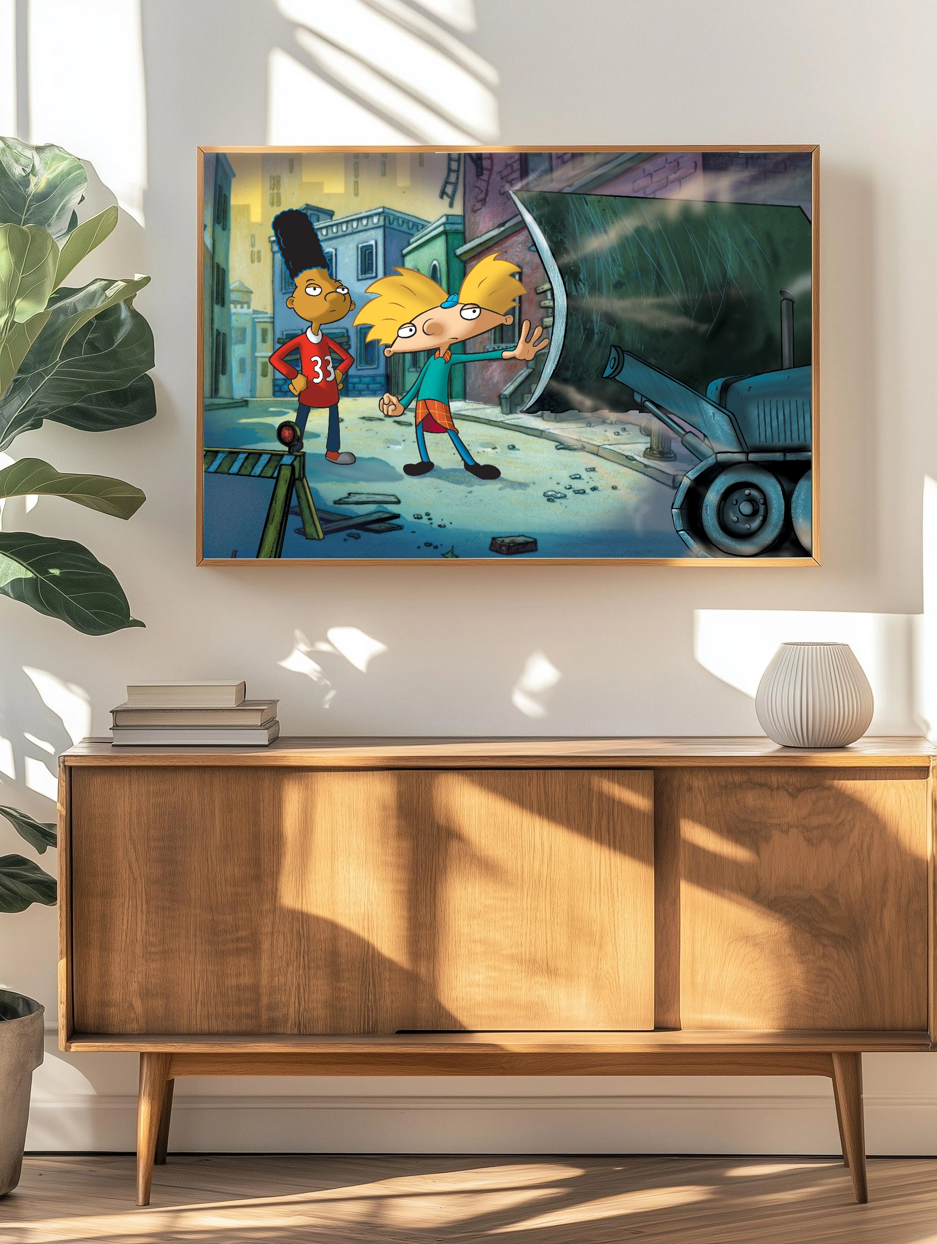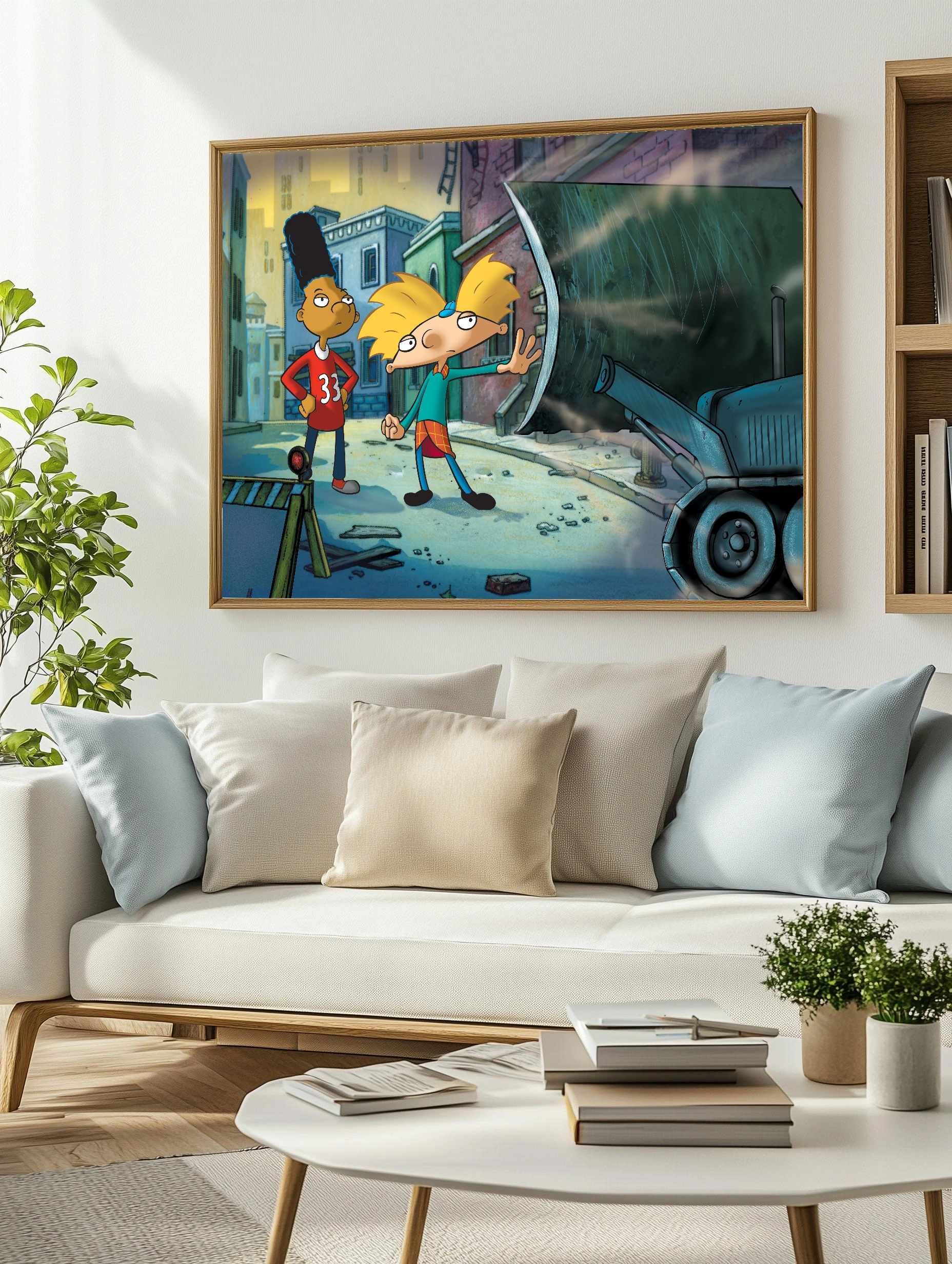 Яркая и динамичная иллюстрация из мультсериала «Эй, Арнольд!», на которой изображены главные герои Арнольд и Джеральд на фоне городских улиц с кирпичными стенами и заброшенными элементами. Картина сочетает жёлтый, синий и зелёный цвета, создавая атмосферу уличного приключения и дружбы. Идеально для детской комнаты или современных интерьерных решений.
