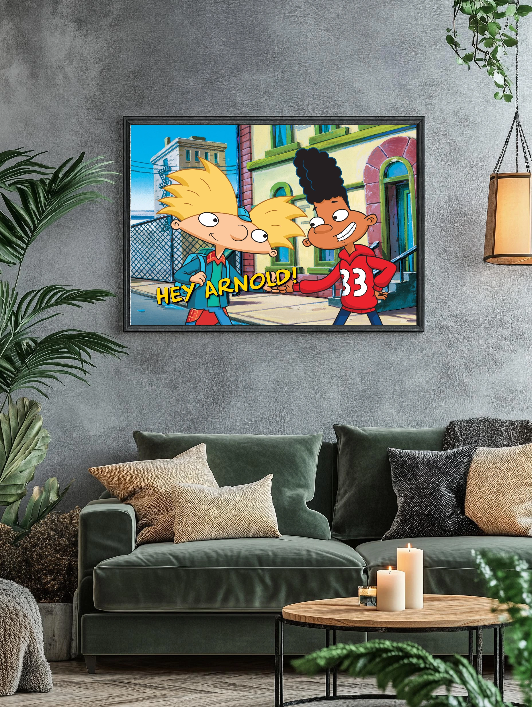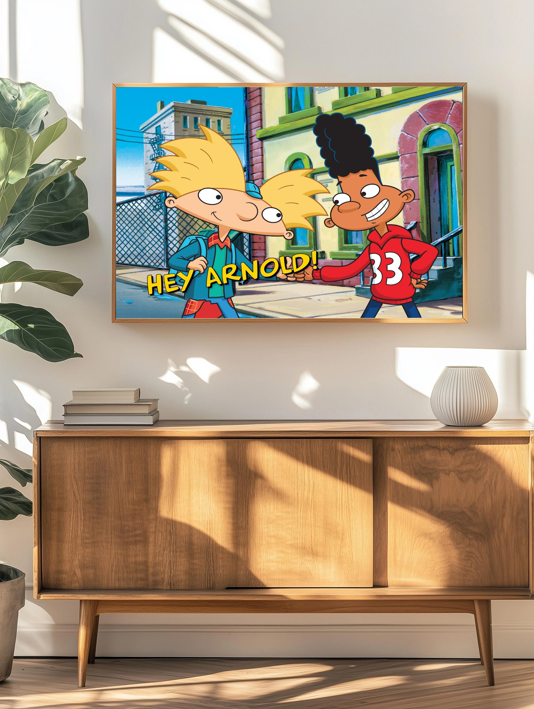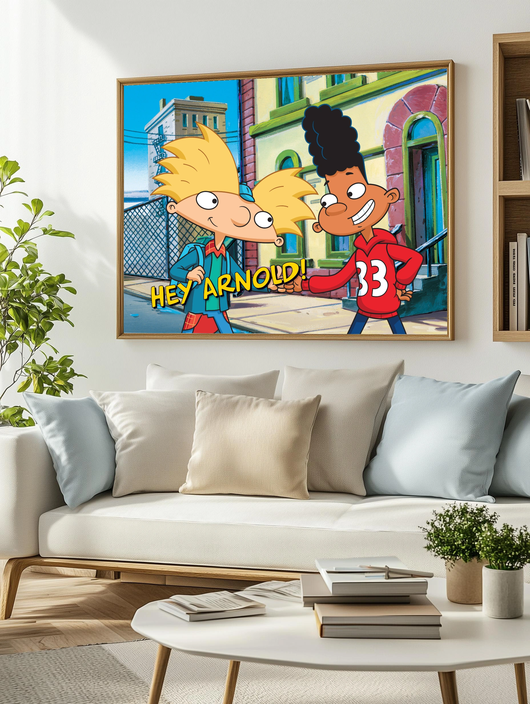 Яркий интерьерный плакат с героями известного мультфильма «Хей Арнолд!» — Арнольдом и Джеральдом. На фоне городских домов, в стиле классической рисованной анимации, изображено крепкое рукопожатие друзей. Этот художественный плакат идеально дополнит гостиную, детскую или офис, придавая уют и ностальгическую атмосферу.